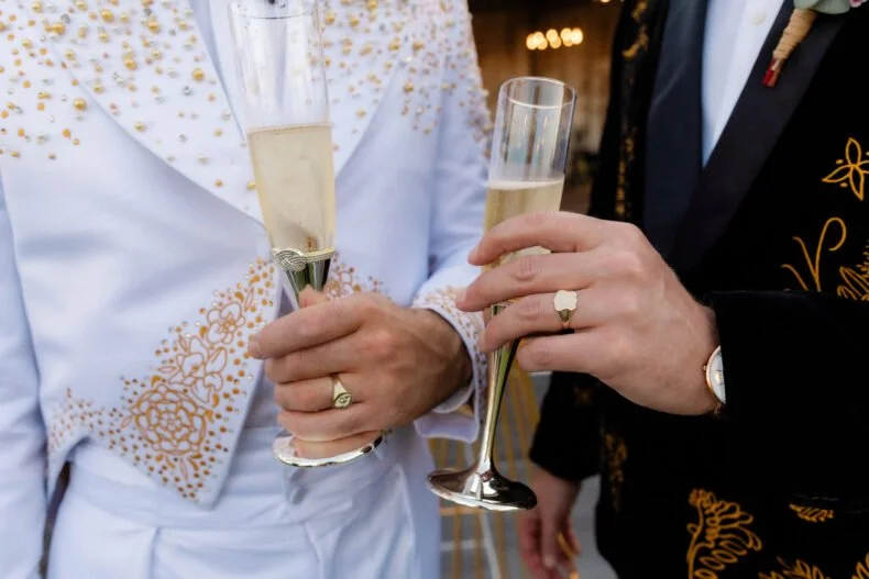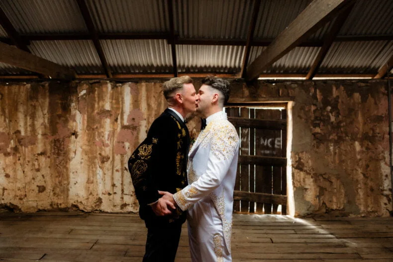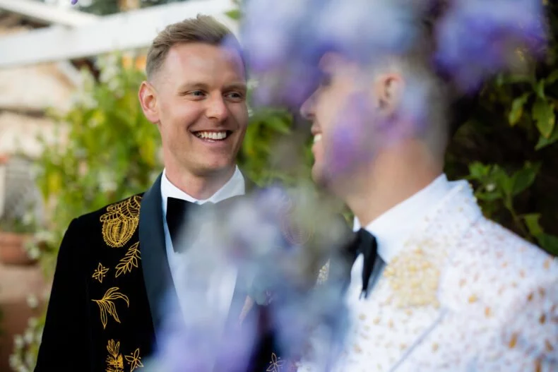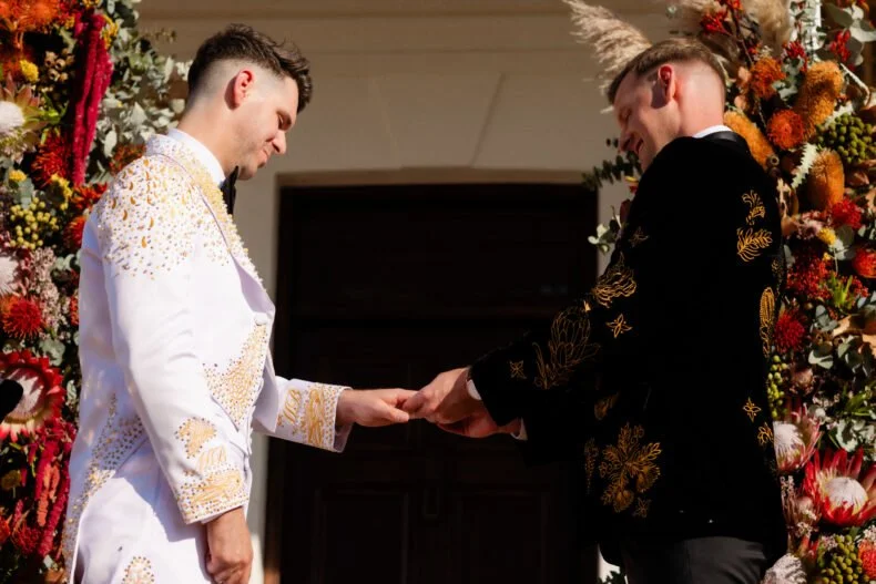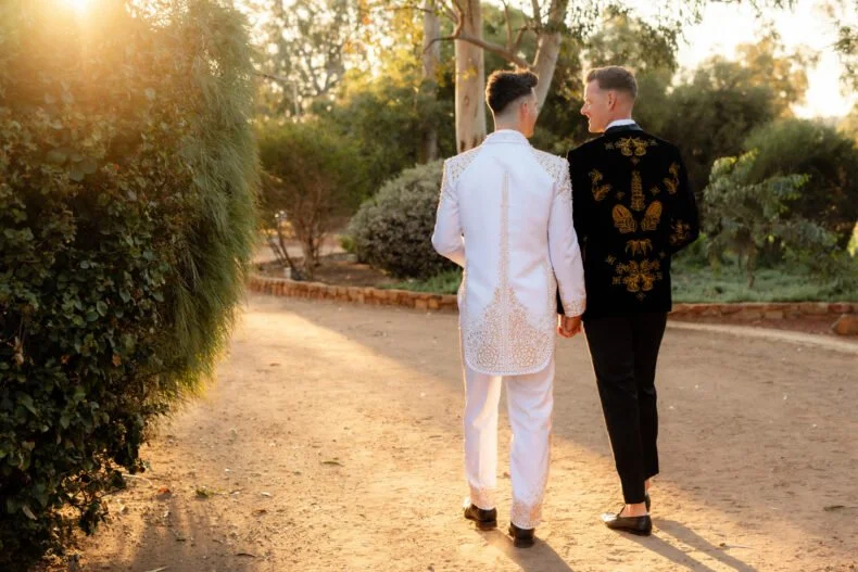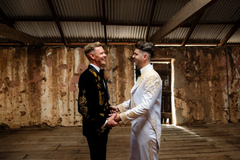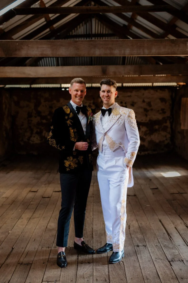 THE SUITS “I had been following our Melbourne suit designer Reigner Clothing on Instagram for years. When we started planning the wedding, I spoke to Neil and told him I wanted a full suit designed and made by Reigner. I never once thought of anyone else dressing me. I was obsessed with the embroidery, the beadwork and the pageantry. The process from start to finish took around a year, this included the design process and making of the suits. I think the suits speak for themselves when you look at the pictures. The thing I loved most about our suits was how much they complimented each other and reflected our personalities.”