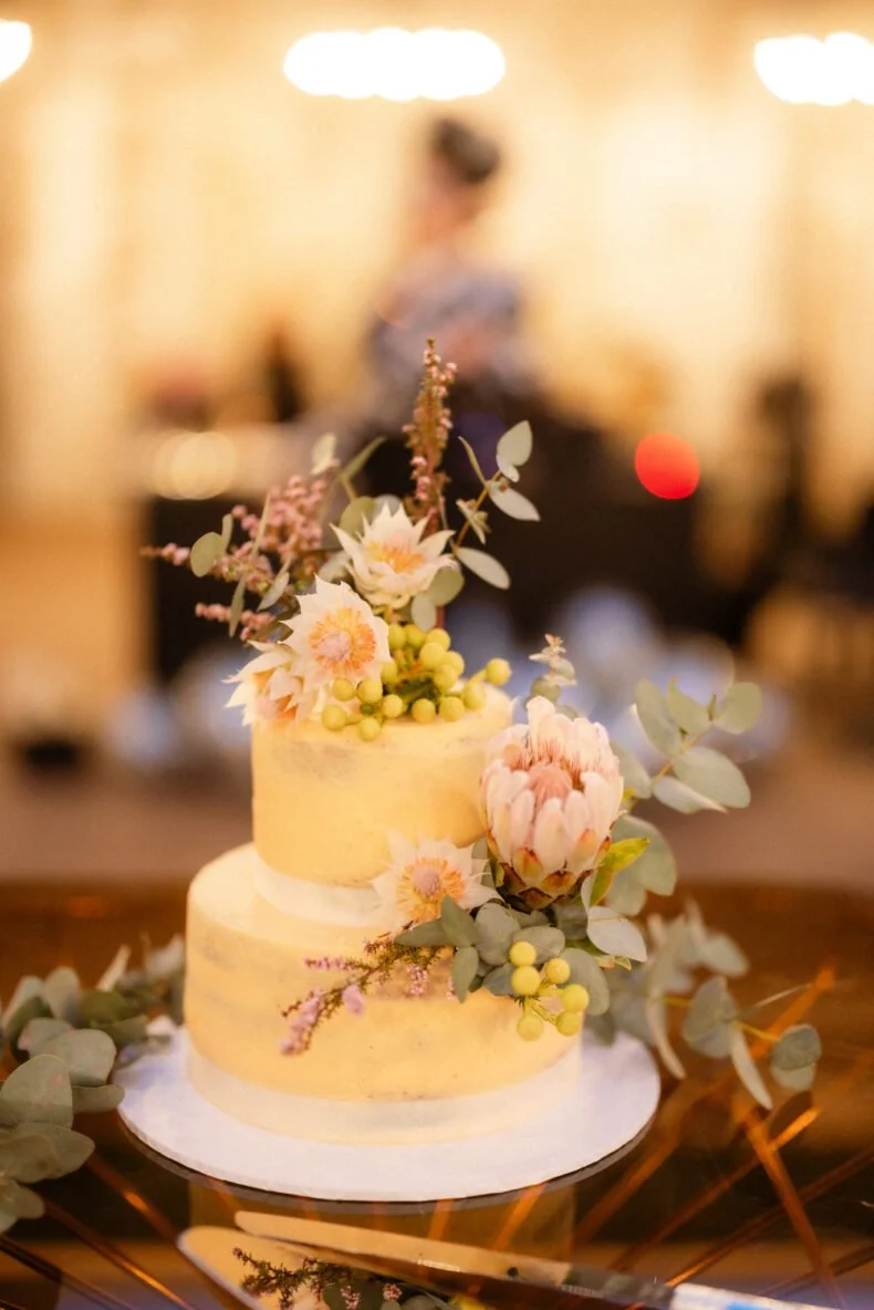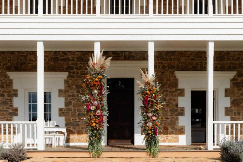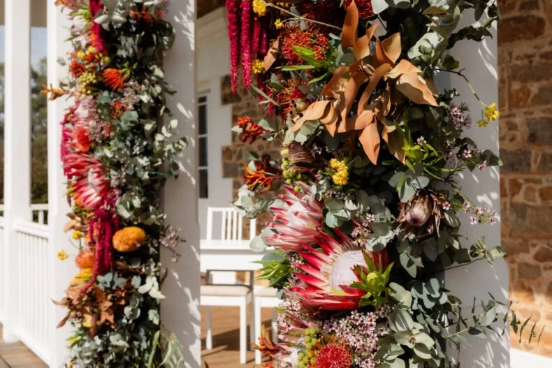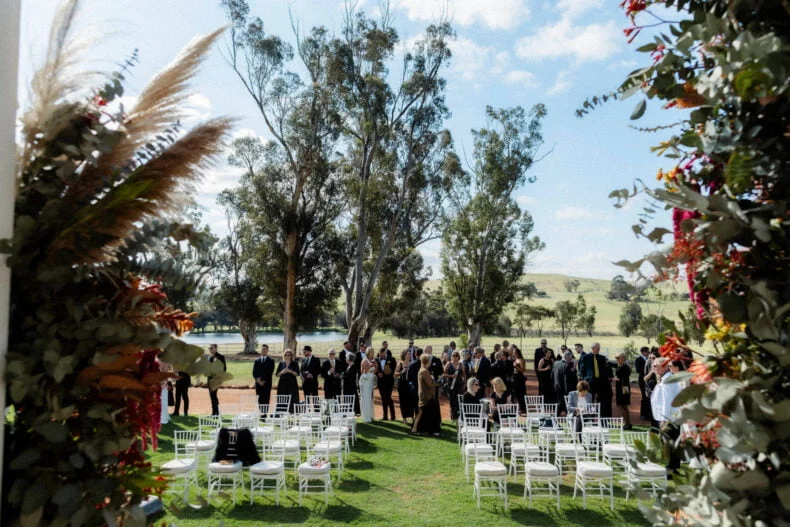 THE VIBE “We wanted the vibe of the day to be really fun, taking traditional elements we both liked and giving them a new fresh twist. Native florals are something we both loved, and the scenery of the place really supported them. Marty’s loves a theme so much so he forcibly made all of our guests stick to a very strict dress code (formal) and colour scheme (black, white and/or gold). This created so much discussion between our guests. Mainly because they knew that if they got it wrong Marty would say something. The colour scheme for our guests helped us pick the colour for everything else, like our hired furniture. The furniture we chose was contemporary and modern as Marty liked the contrast between this and the rustic farm setting of our venue Buckland Estate.”
