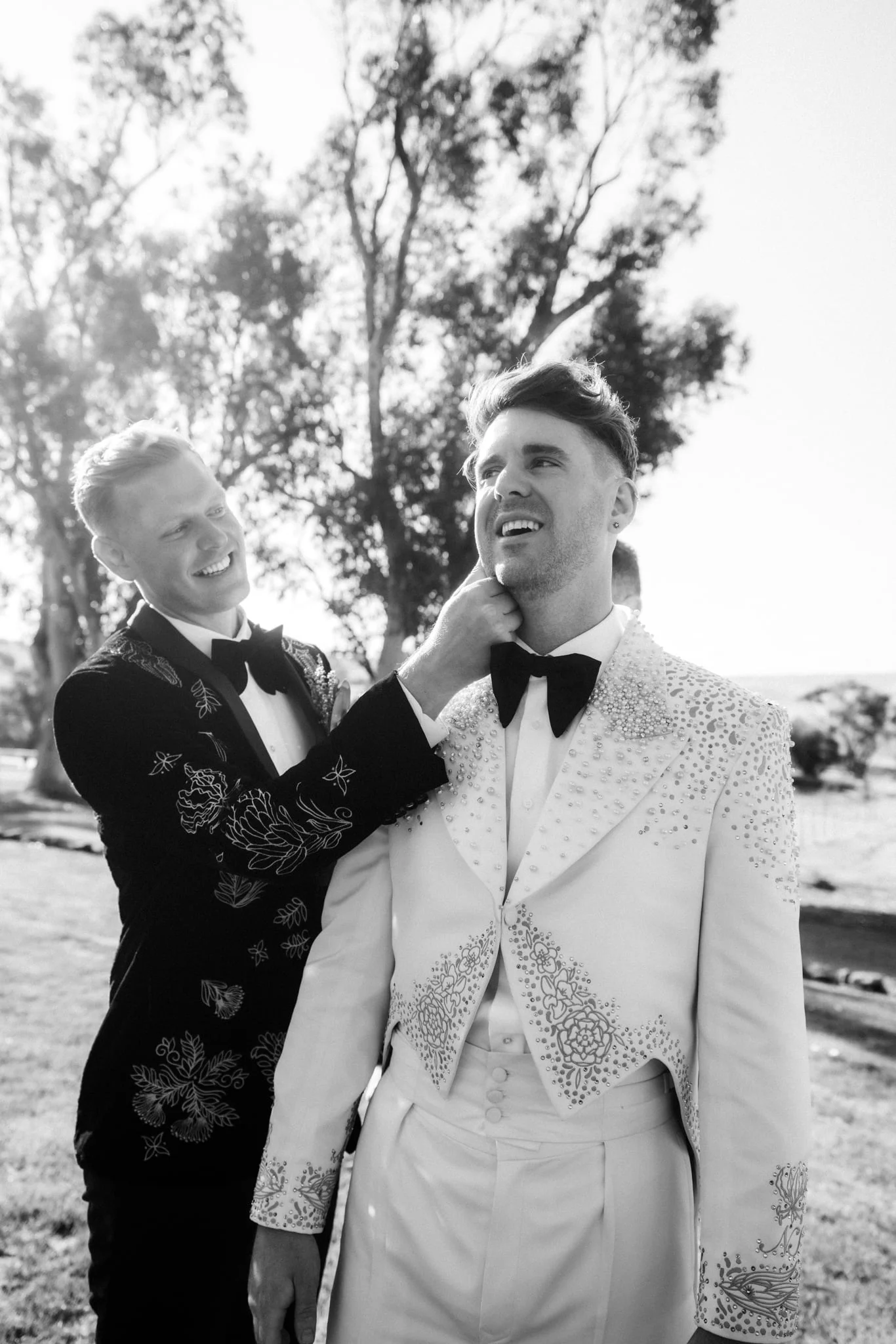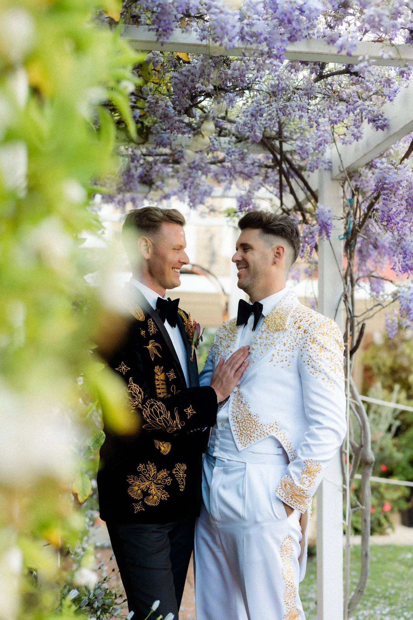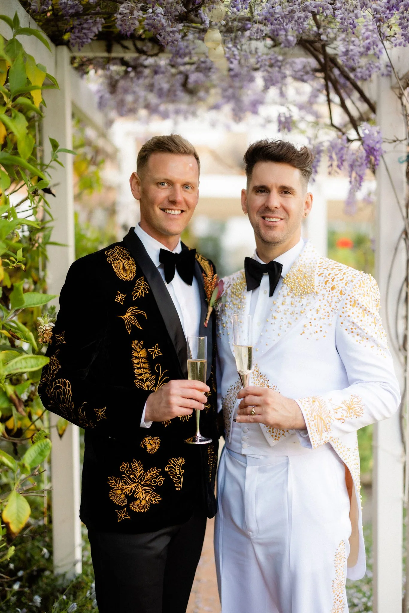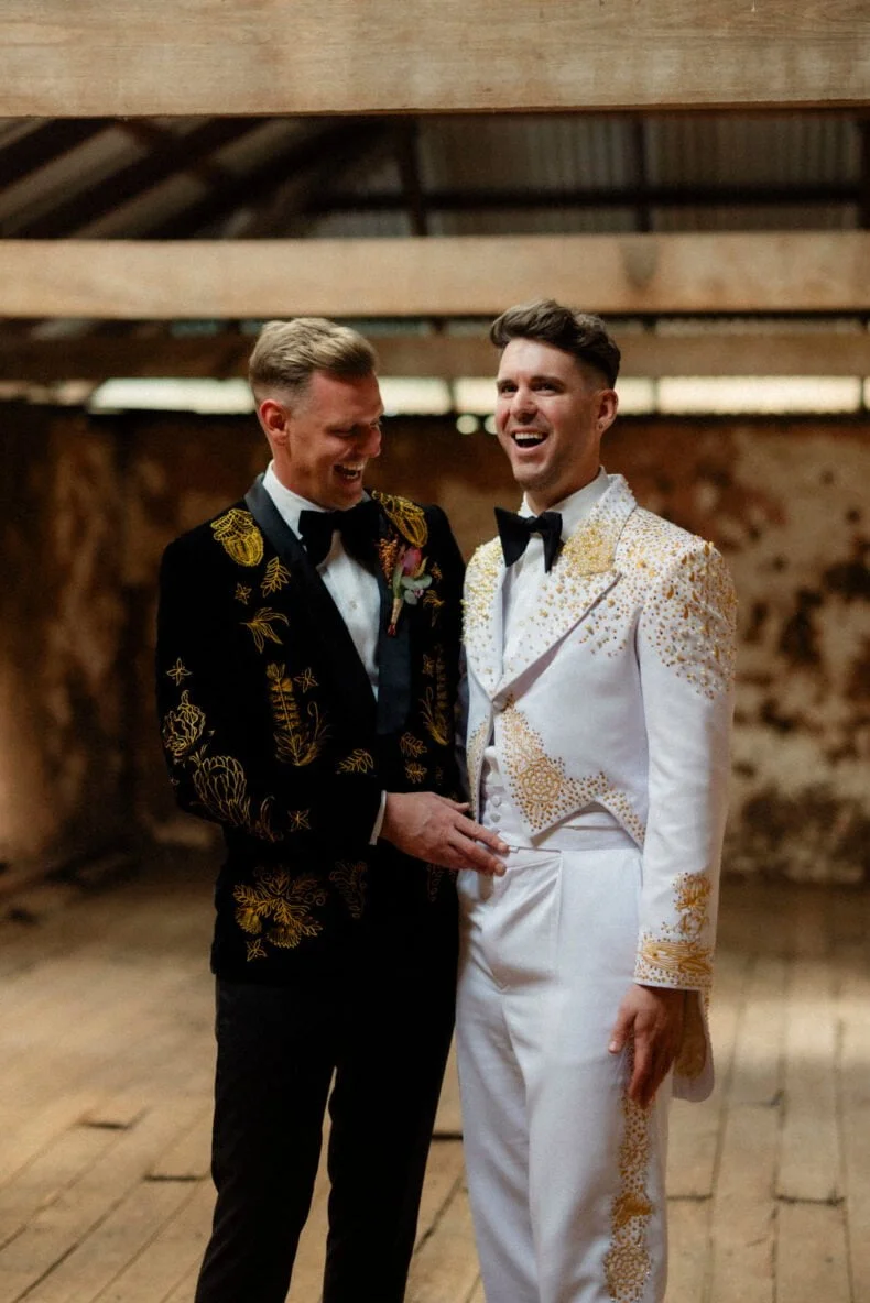 THE SUITS “I had been following our Melbourne suit designer Reigner Clothing on Instagram for years. When we started planning the wedding, I spoke to Neil and told him I wanted a full suit designed and made by Reigner. I never once thought of anyone else dressing me. I was obsessed with the embroidery, the beadwork and the pageantry. The process from start to finish took around a year, this included the design process and making of the suits. I think the suits speak for themselves when you look at the pictures. The thing I loved most about our suits was how much they complimented each other and reflected our personalities.”