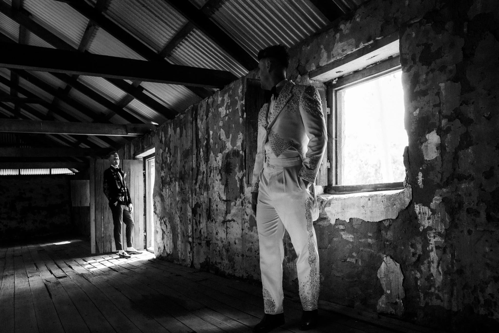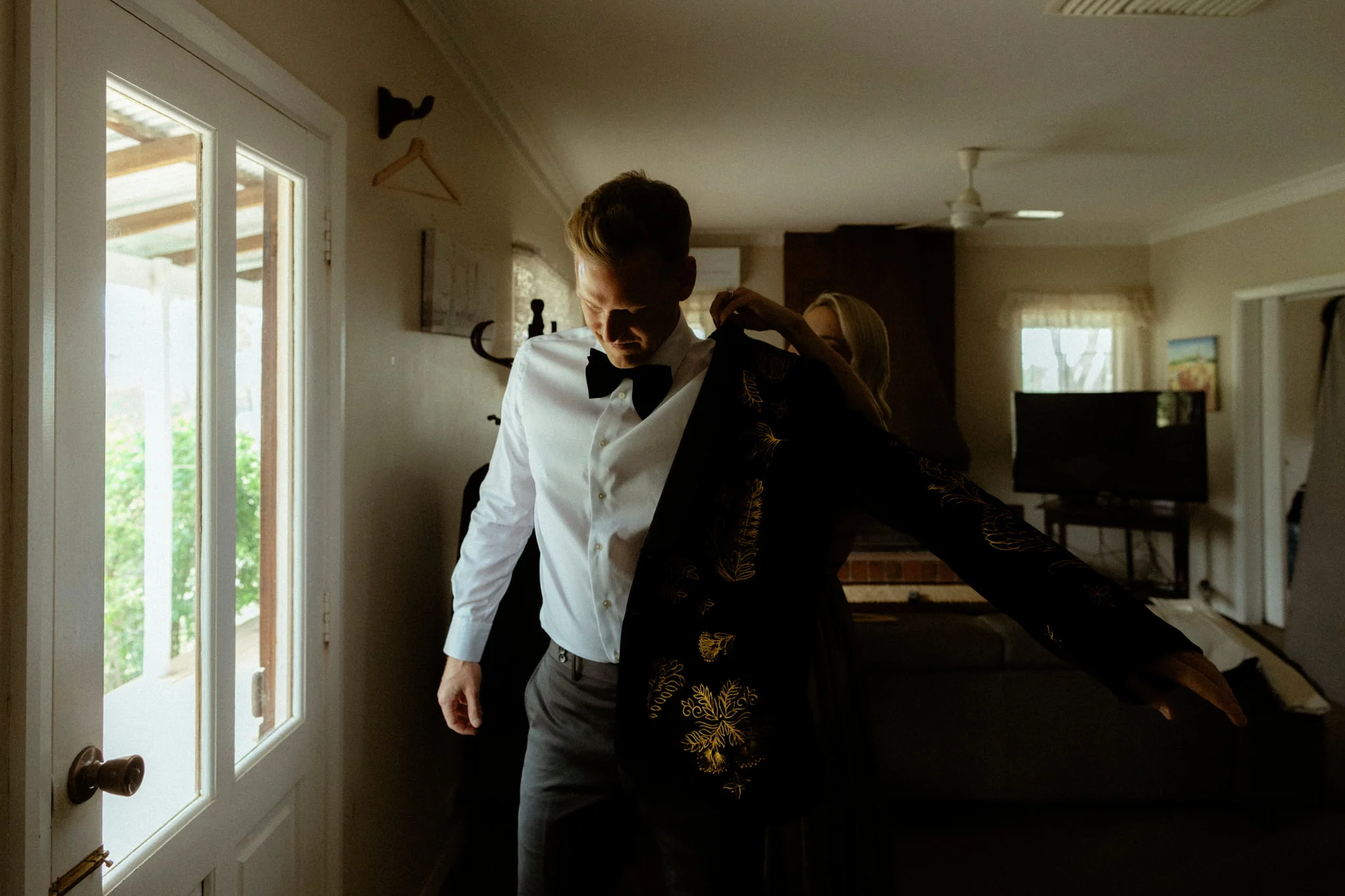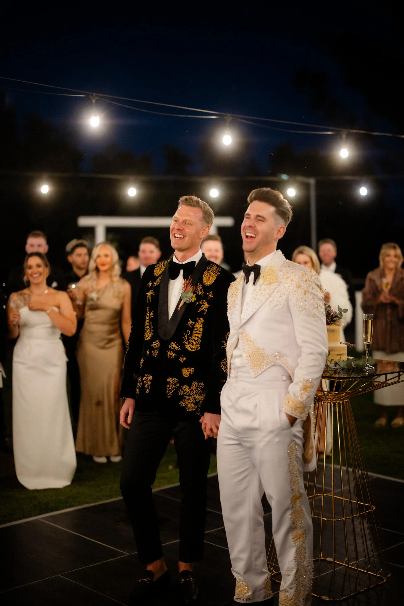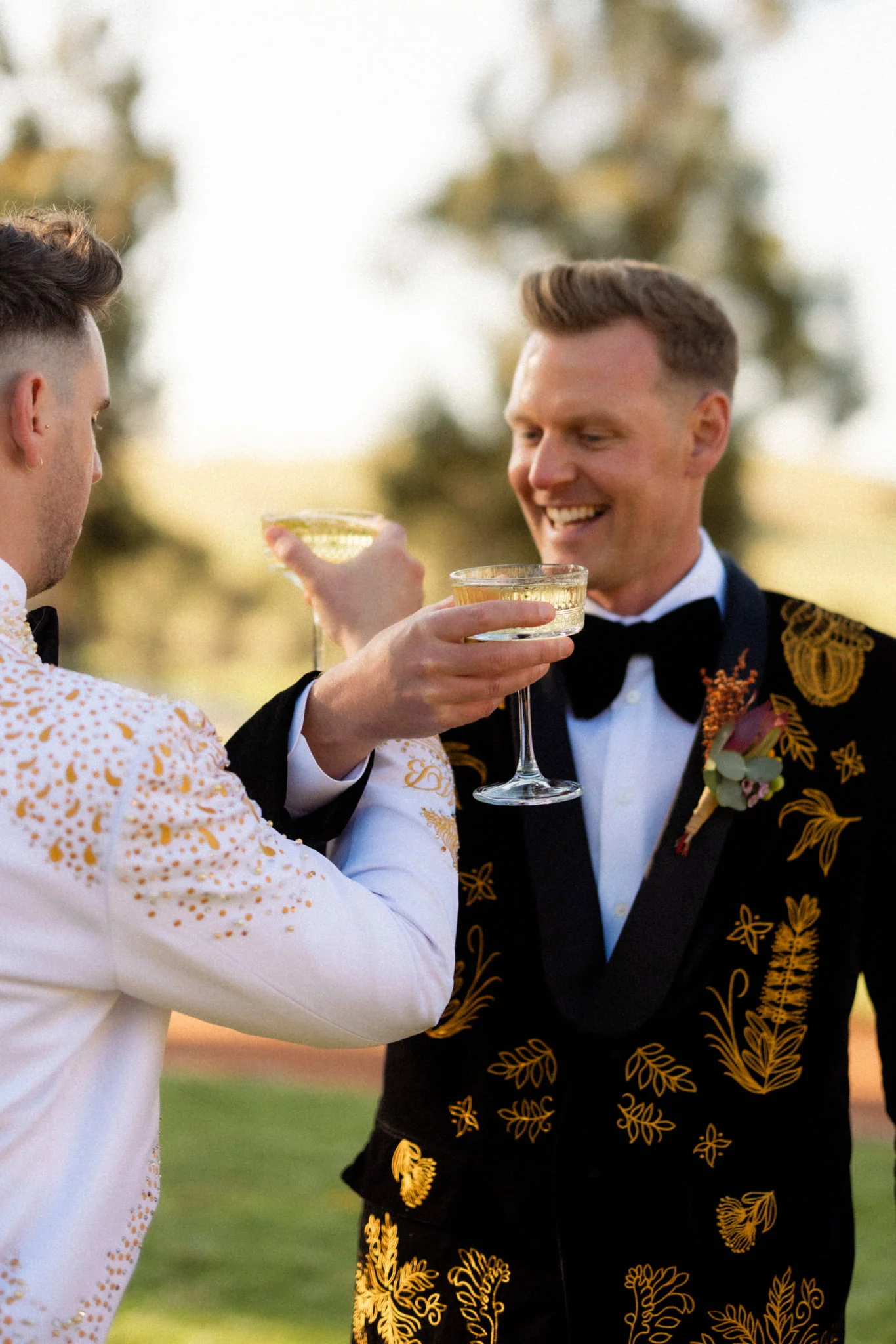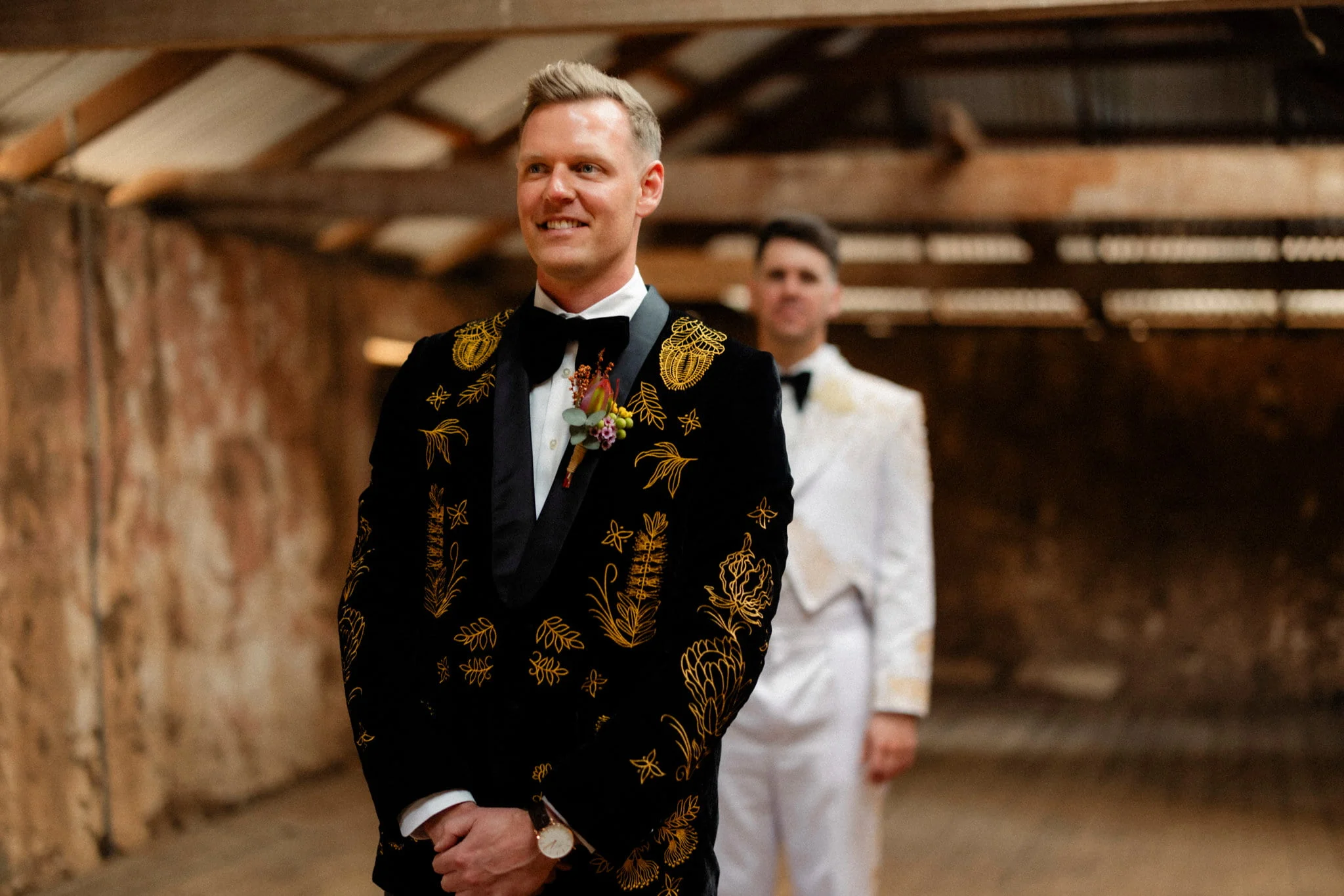 THE SUITS “I had been following our Melbourne suit designer Reigner Clothing on Instagram for years. When we started planning the wedding, I spoke to Neil and told him I wanted a full suit designed and made by Reigner. I never once thought of anyone else dressing me. I was obsessed with the embroidery, the beadwork and the pageantry. The process from start to finish took around a year, this included the design process and making of the suits. I think the suits speak for themselves when you look at the pictures. The thing I loved most about our suits was how much they complimented each other and reflected our personalities.”