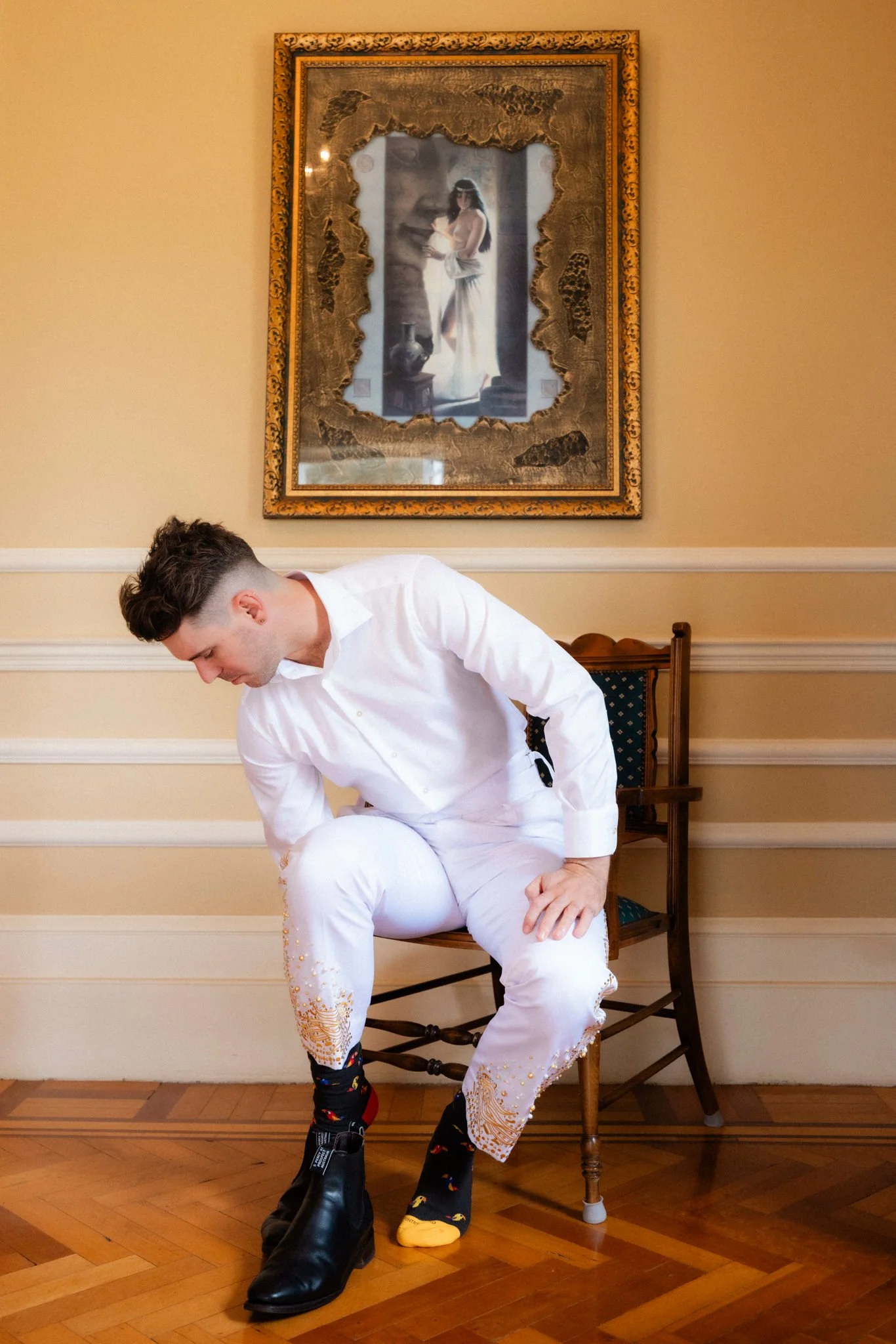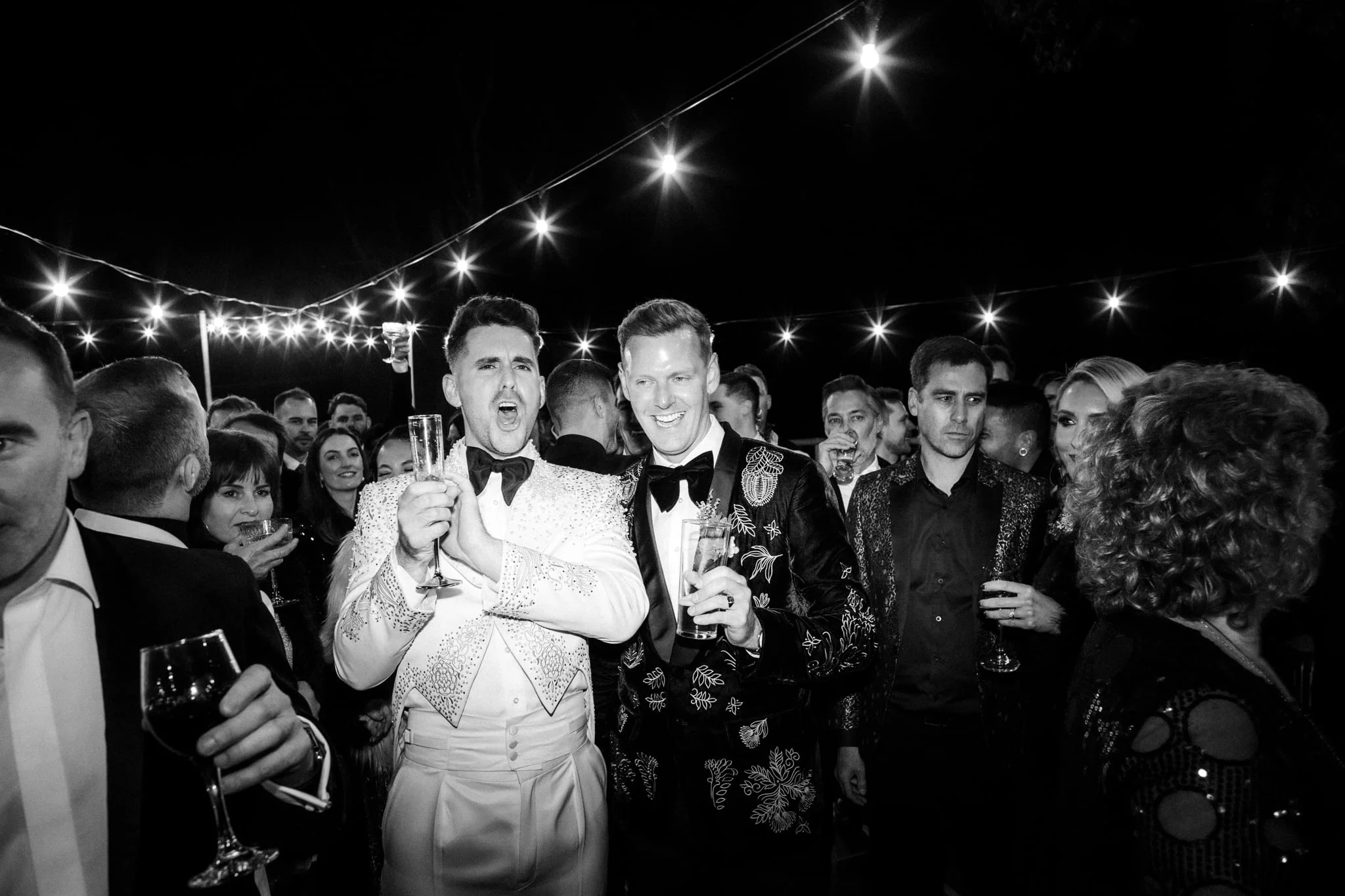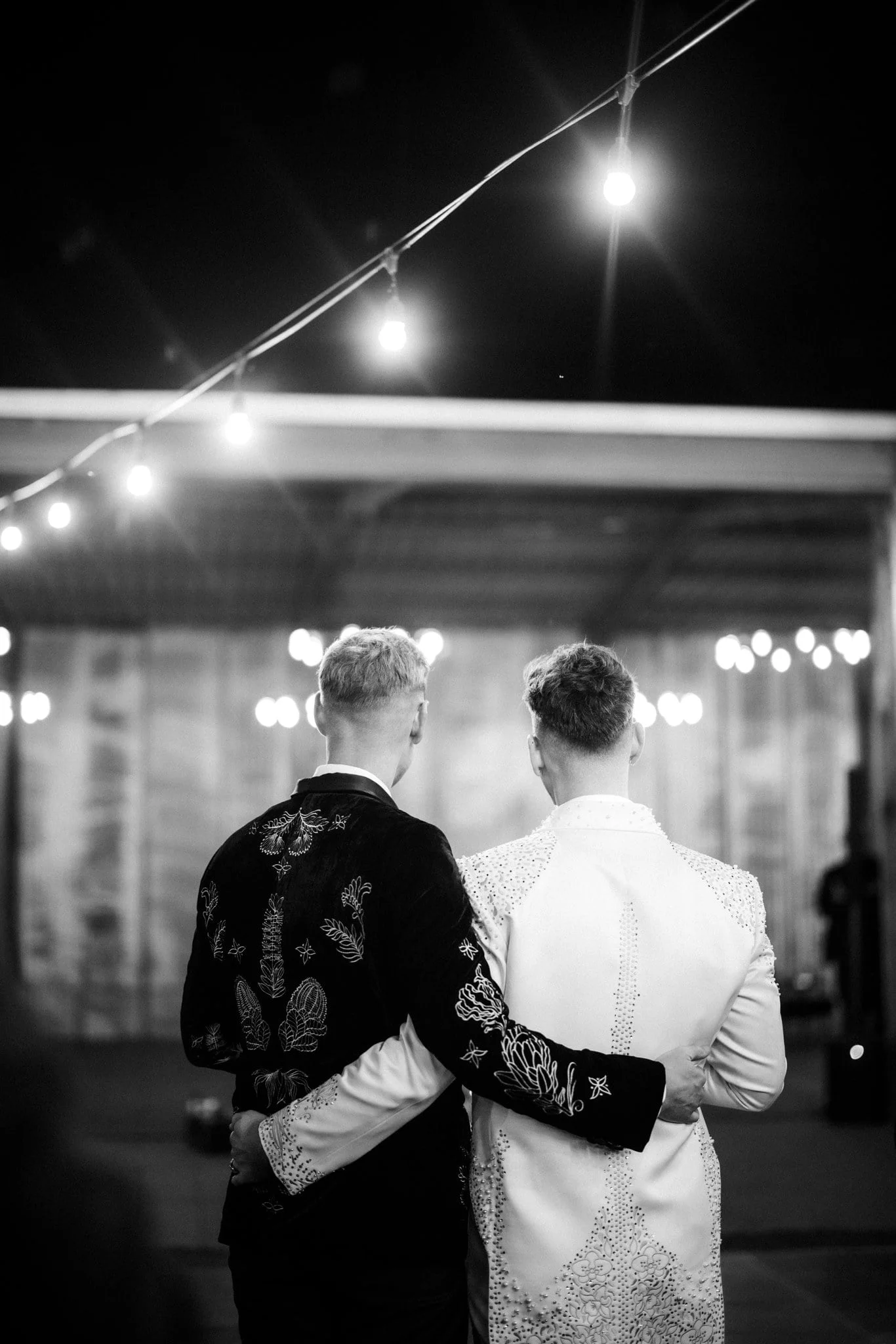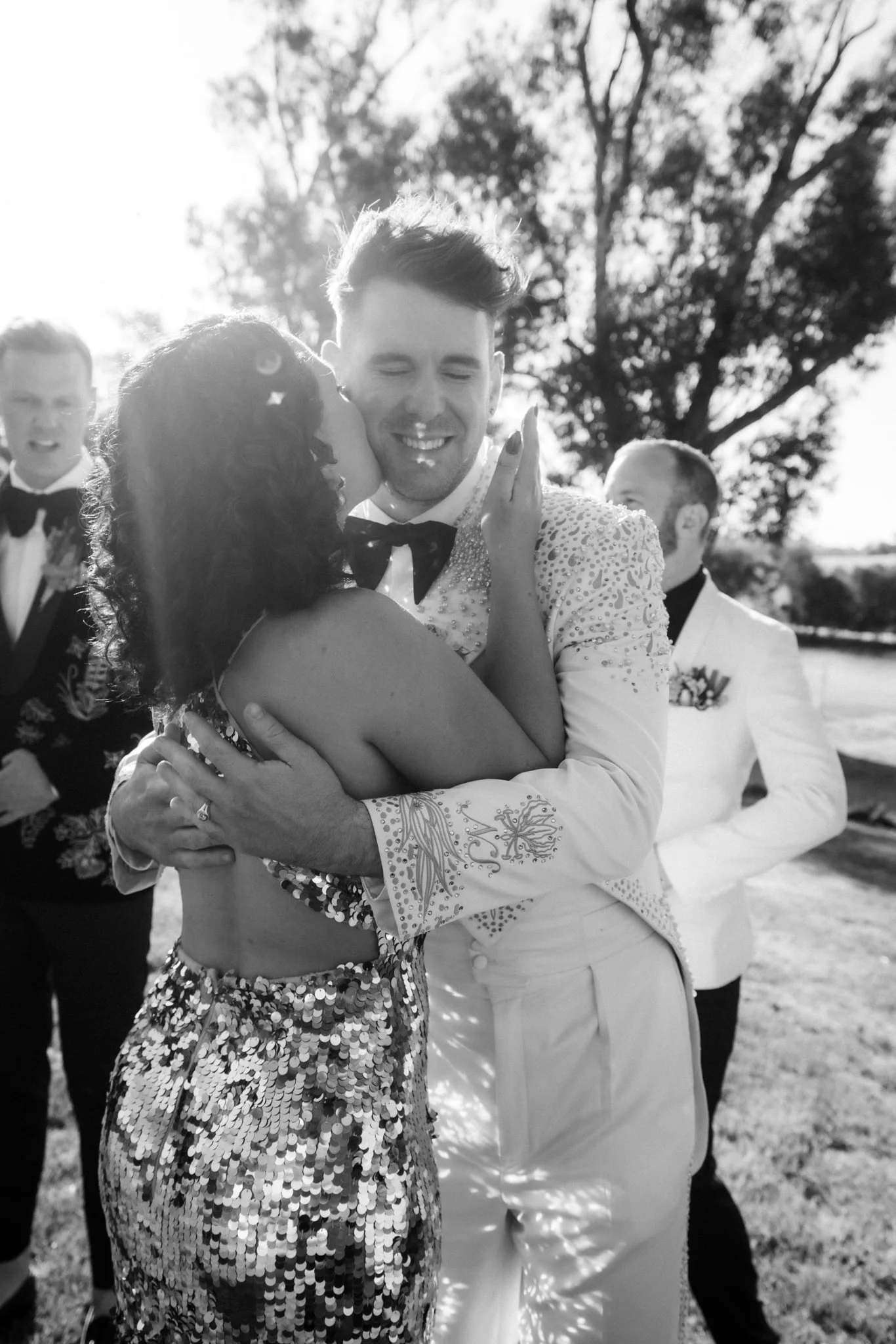 THE SUITS “I had been following our Melbourne suit designer Reigner Clothing on Instagram for years. When we started planning the wedding, I spoke to Neil and told him I wanted a full suit designed and made by Reigner. I never once thought of anyone else dressing me. I was obsessed with the embroidery, the beadwork and the pageantry. The process from start to finish took around a year, this included the design process and making of the suits. I think the suits speak for themselves when you look at the pictures. The thing I loved most about our suits was how much they complimented each other and reflected our personalities.”