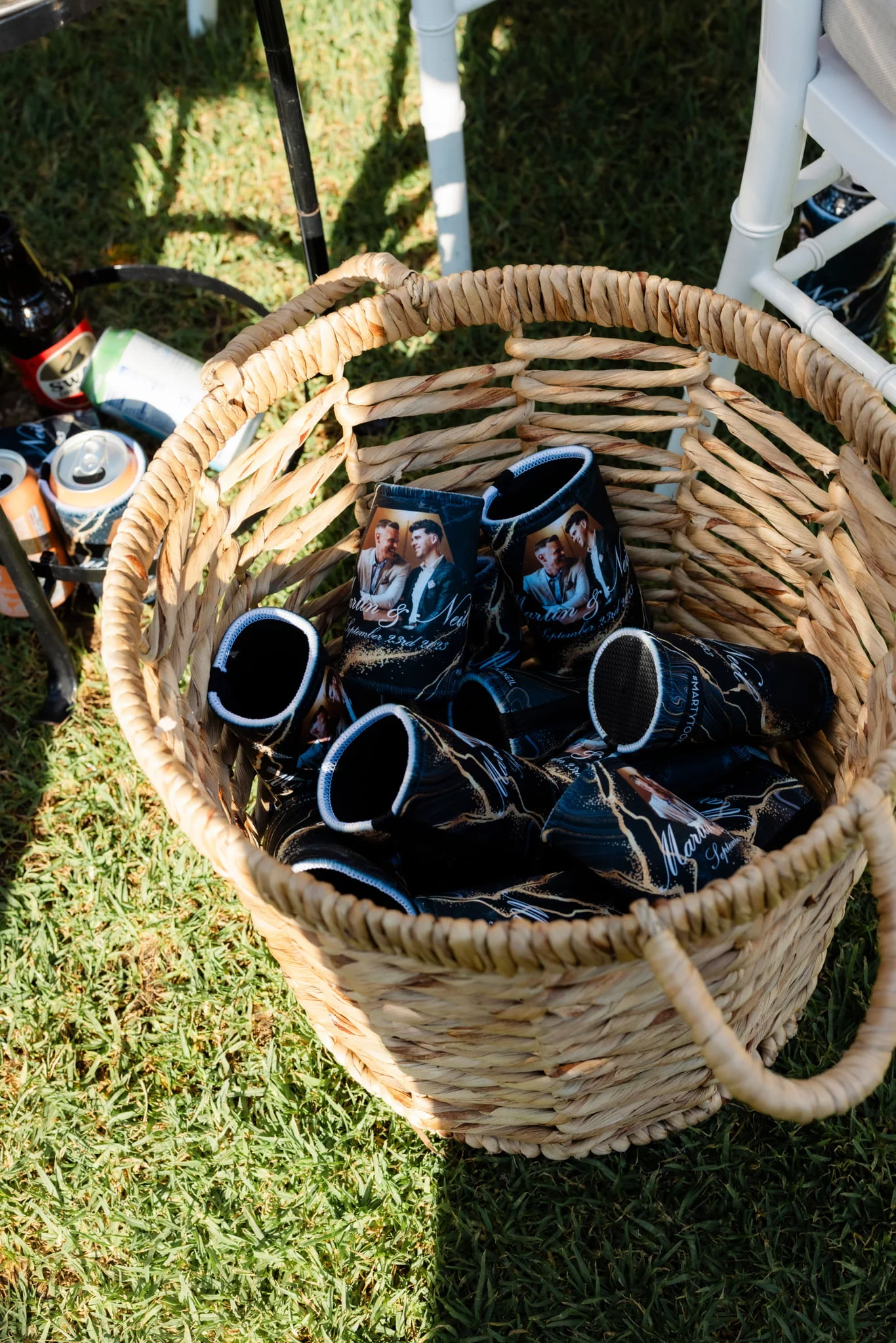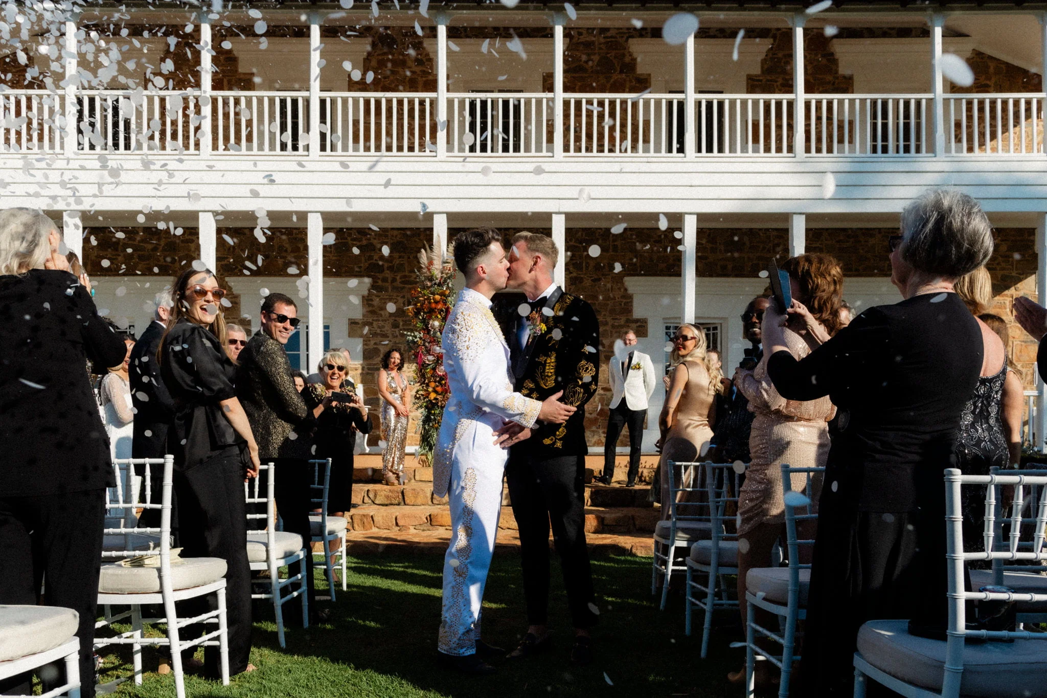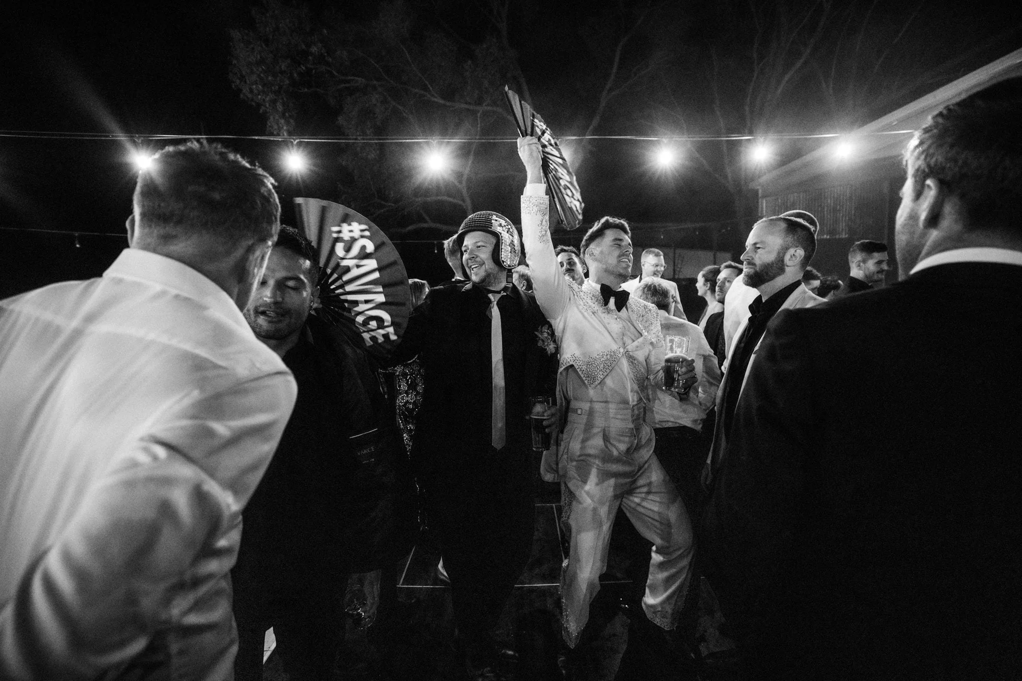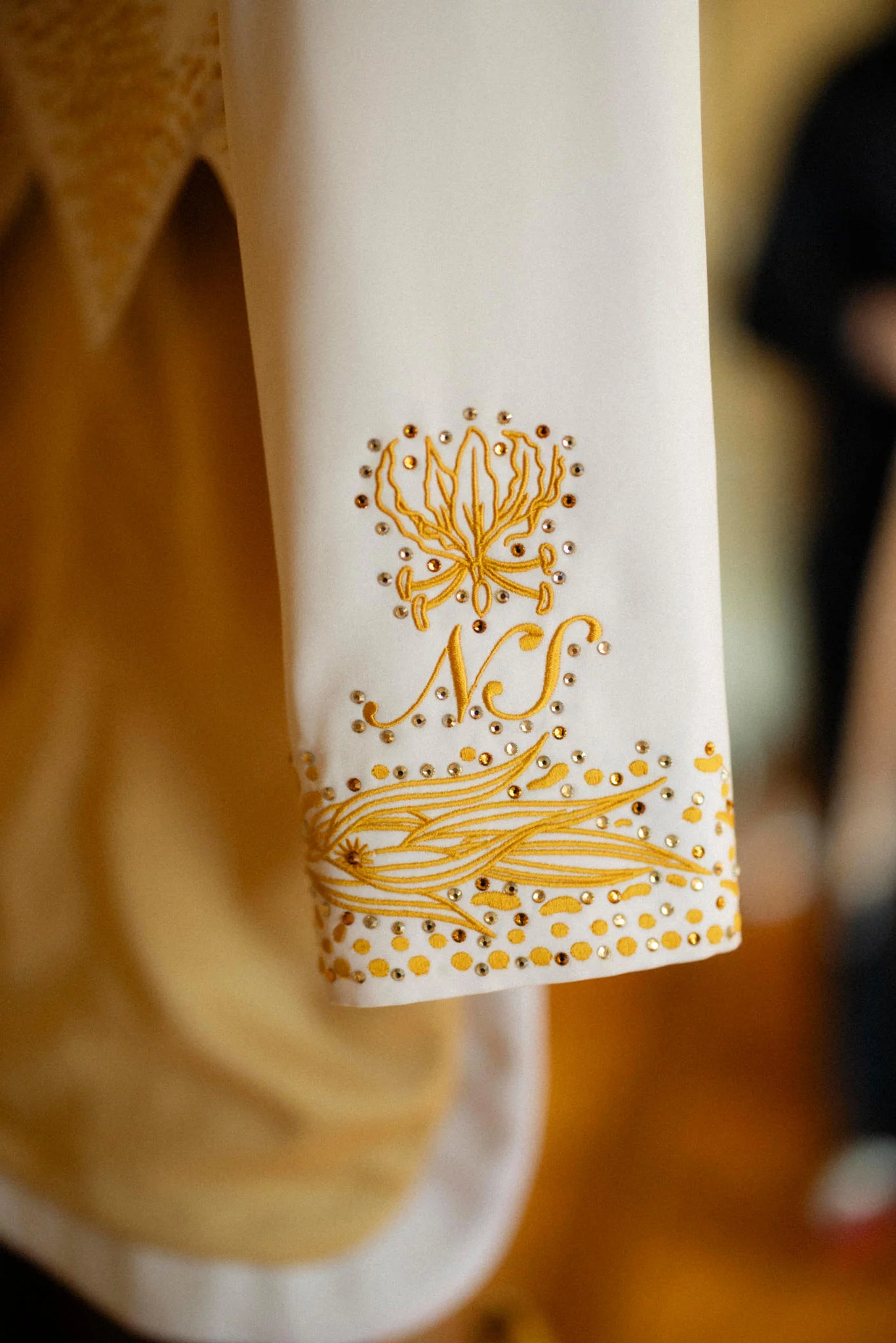 THE SUITS “I had been following our Melbourne suit designer Reigner Clothing on Instagram for years. When we started planning the wedding, I spoke to Neil and told him I wanted a full suit designed and made by Reigner. I never once thought of anyone else dressing me. I was obsessed with the embroidery, the beadwork and the pageantry. The process from start to finish took around a year, this included the design process and making of the suits. I think the suits speak for themselves when you look at the pictures. The thing I loved most about our suits was how much they complimented each other and reflected our personalities.”