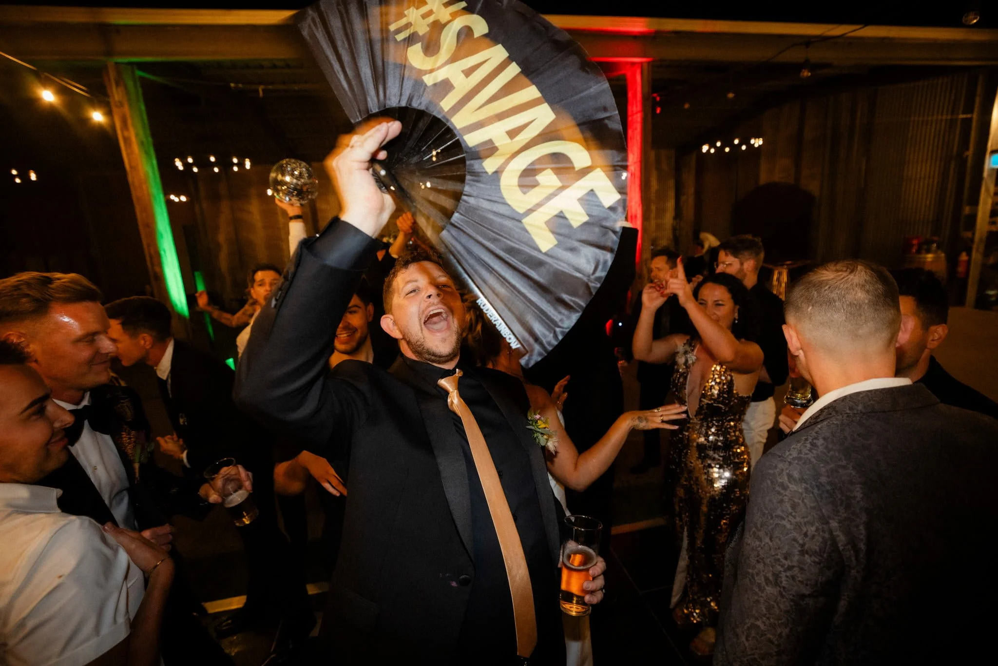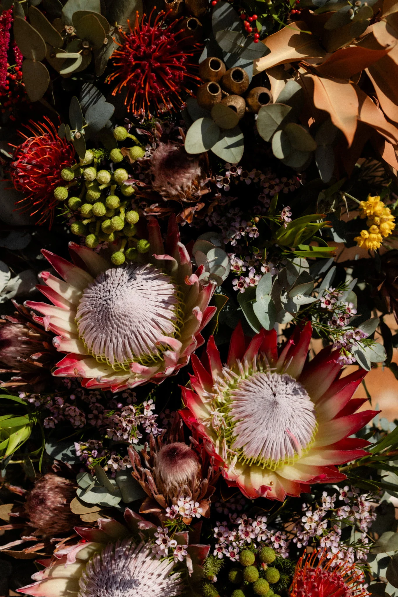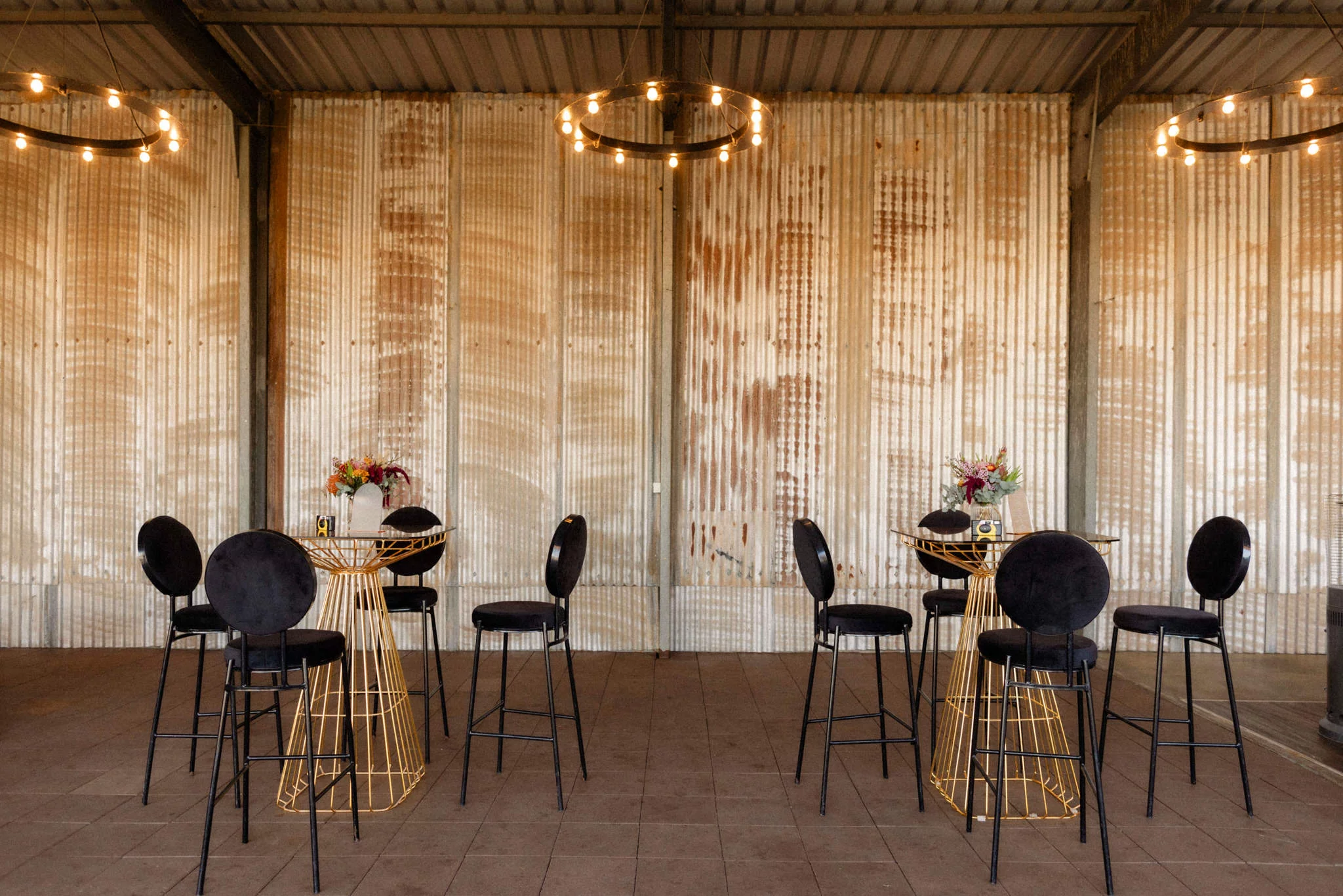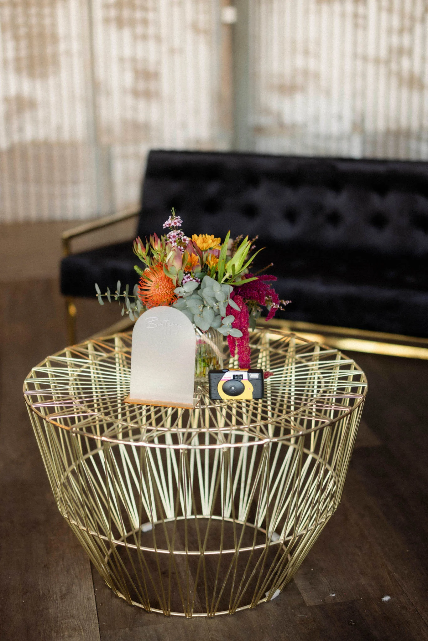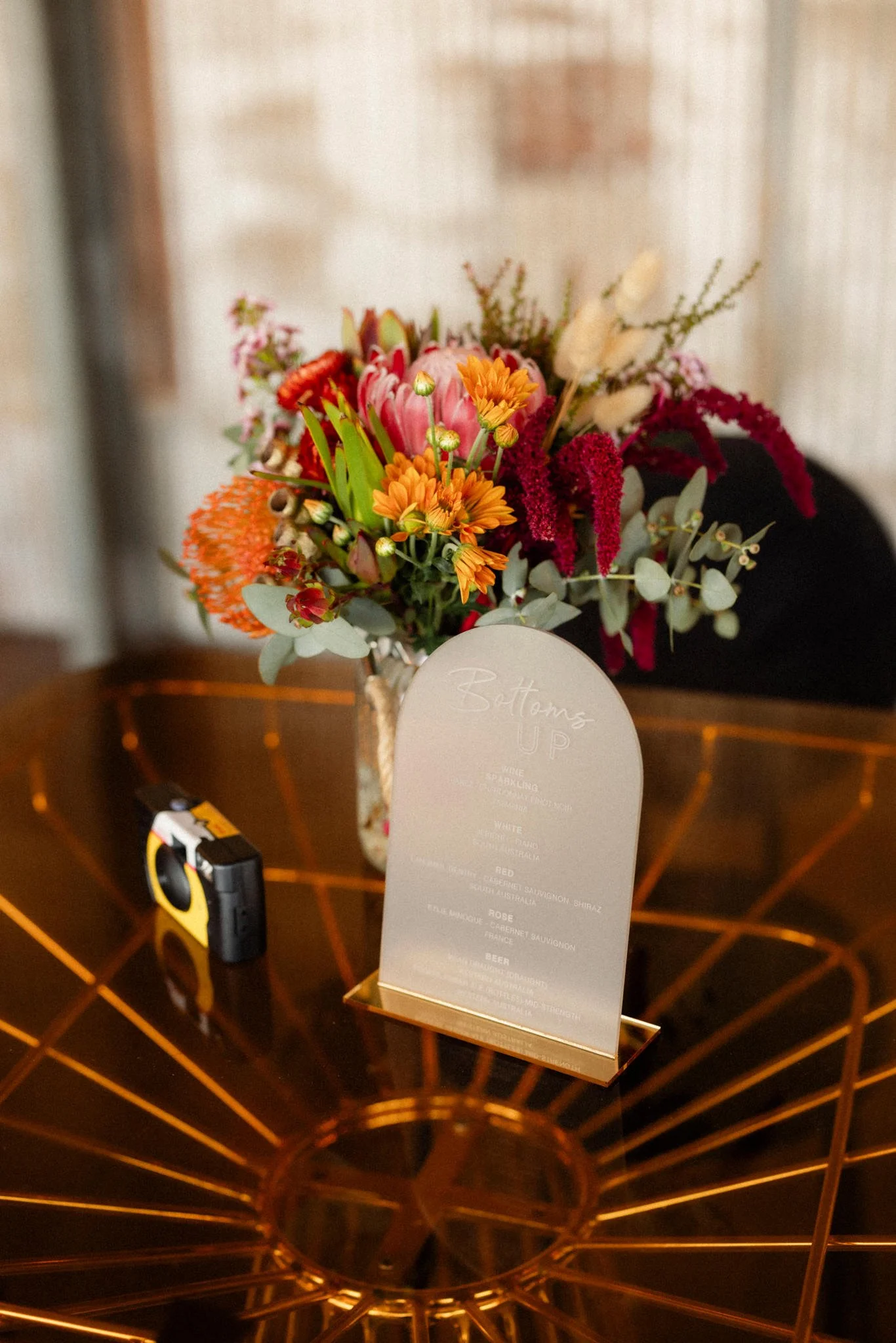 THE VIBE “We wanted the vibe of the day to be really fun, taking traditional elements we both liked and giving them a new fresh twist. Native florals are something we both loved, and the scenery of the place really supported them. Marty’s loves a theme so much so he forcibly made all of our guests stick to a very strict dress code (formal) and colour scheme (black, white and/or gold). This created so much discussion between our guests. Mainly because they knew that if they got it wrong Marty would say something. The colour scheme for our guests helped us pick the colour for everything else, like our hired furniture. The furniture we chose was contemporary and modern as Marty liked the contrast between this and the rustic farm setting of our venue Buckland Estate.”