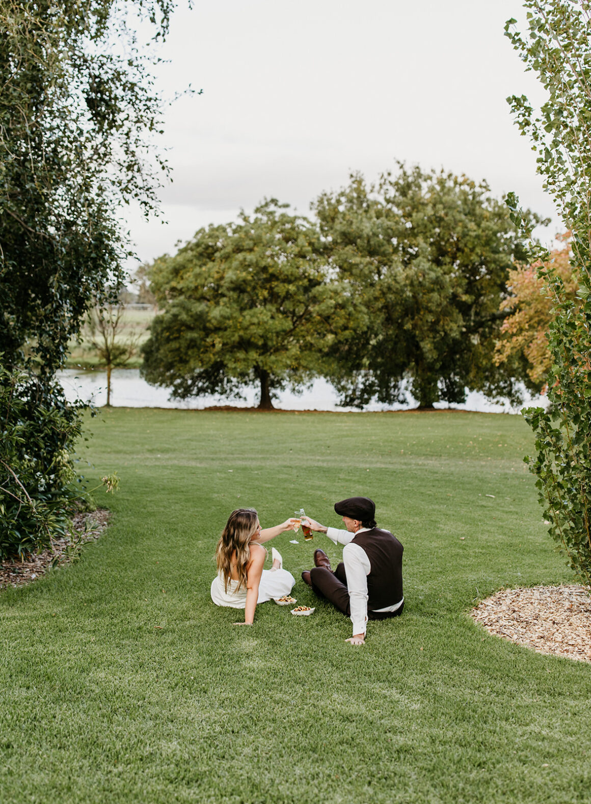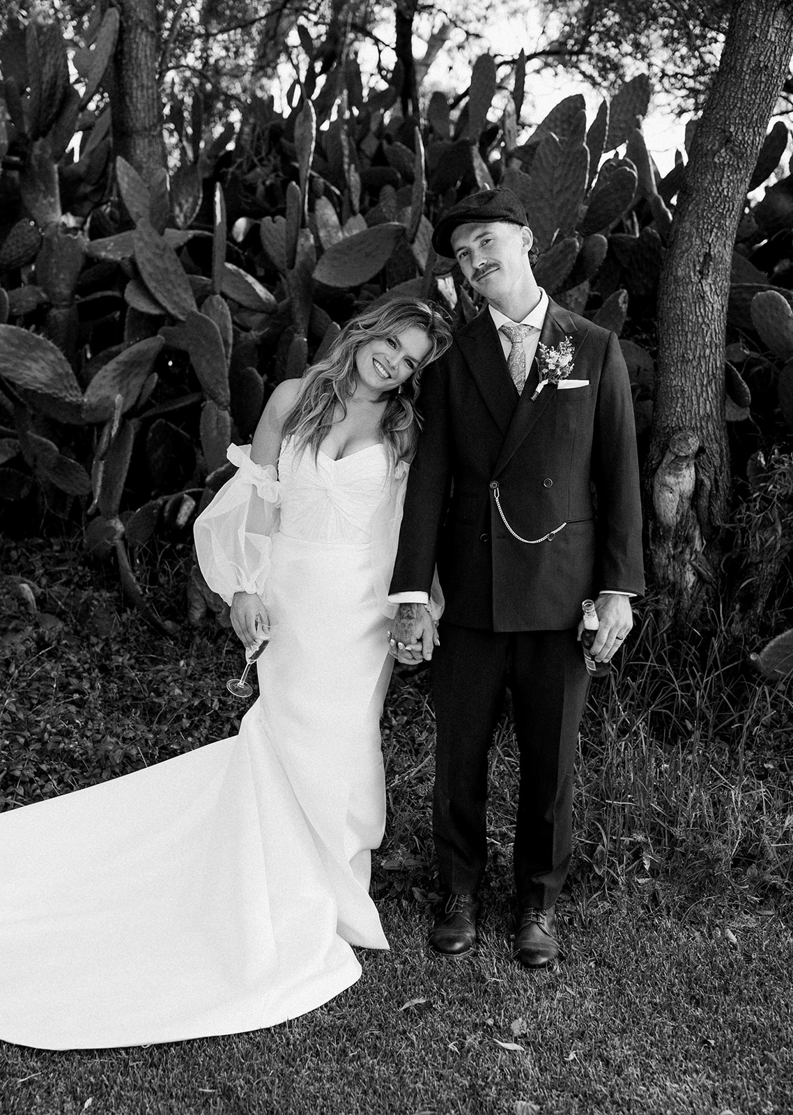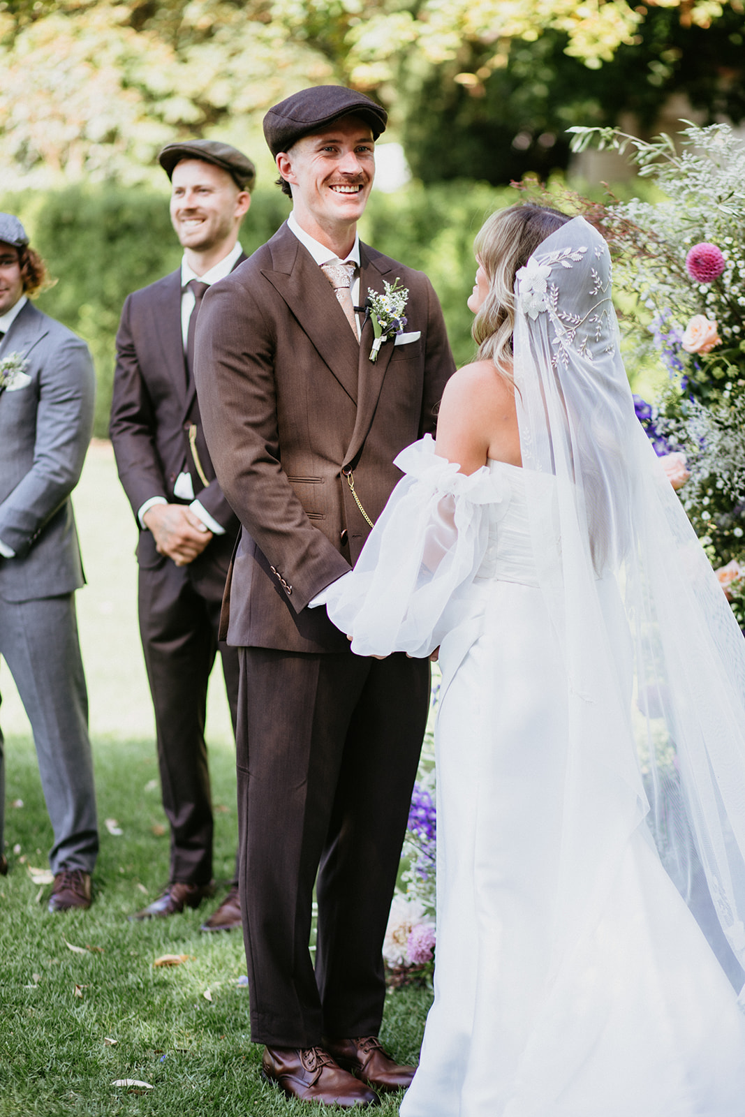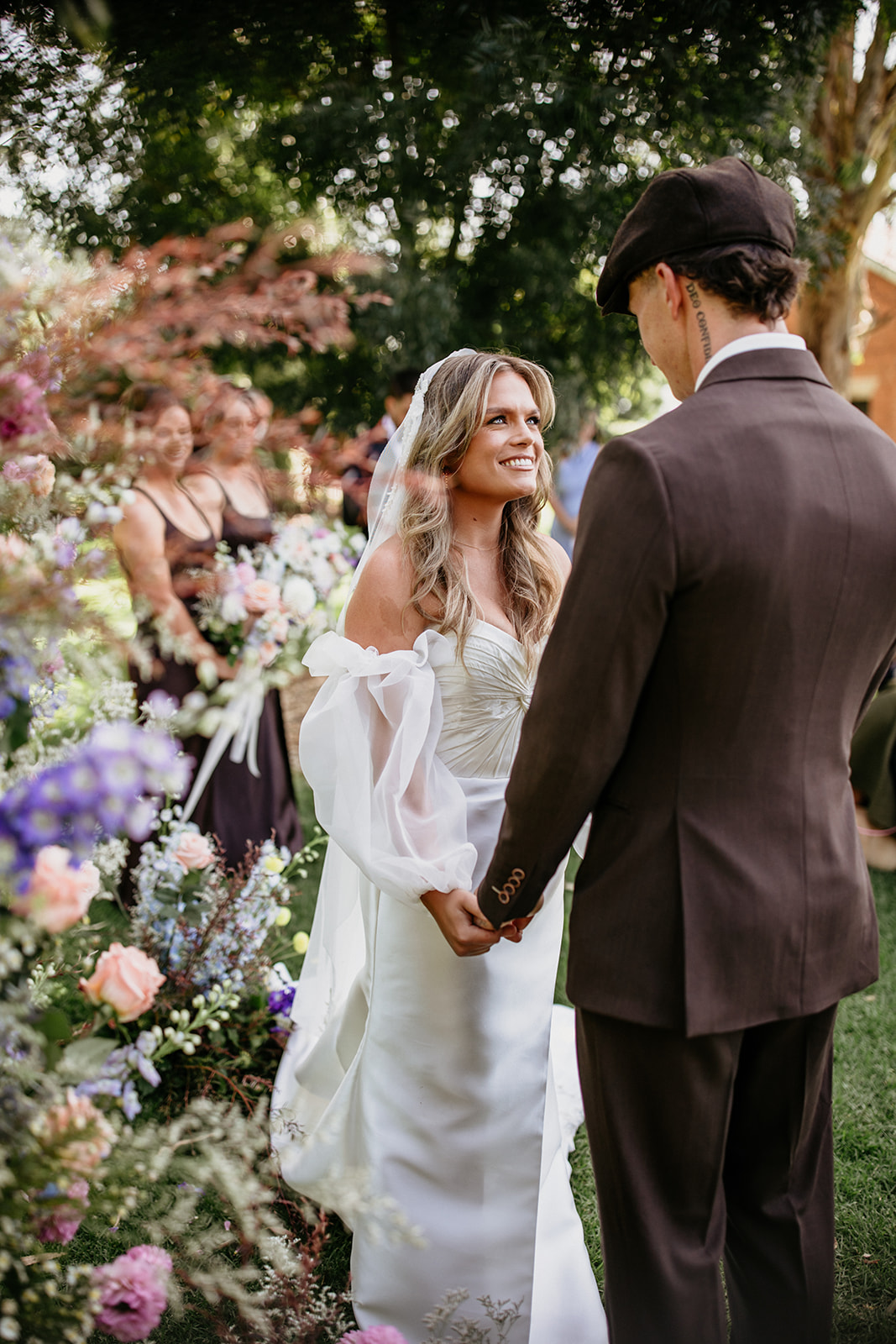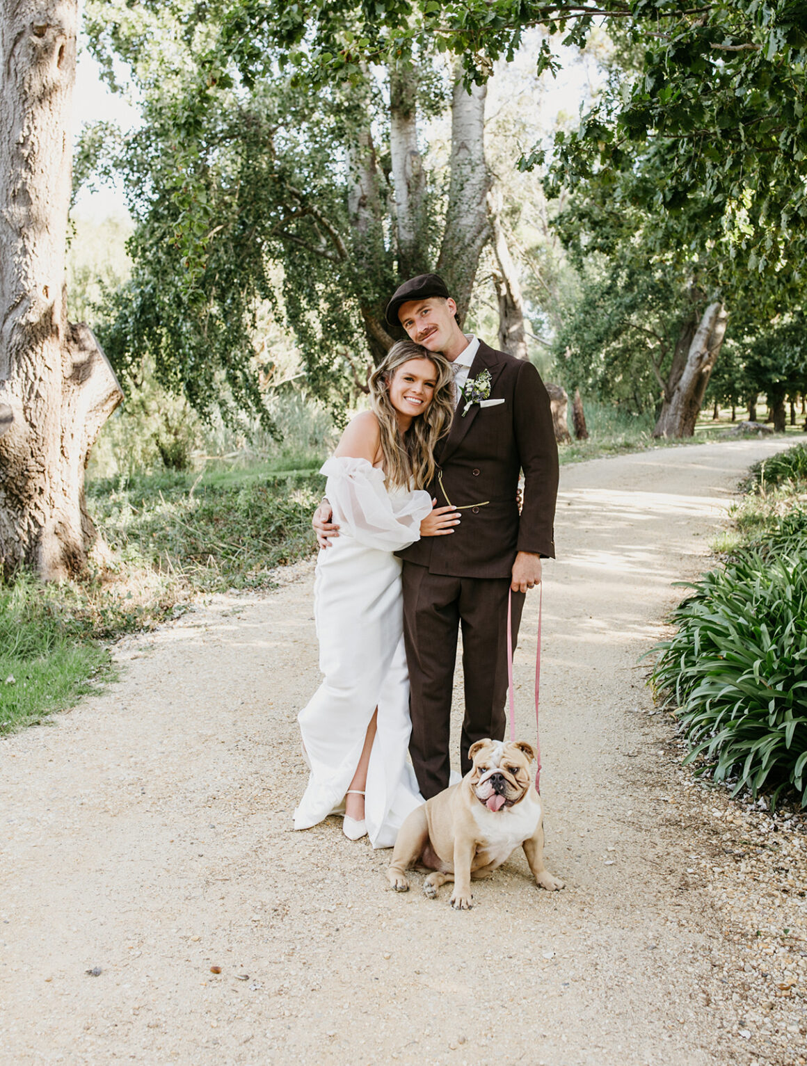 For Nadine and Link, Mewburn Park Homestead was an easy pick. But, when it came to narrowing down a theme, the pair were pulled in a few different directions. “We started with a Woodstock-inspired vibe,” the couple explained. “But when Link fell for the Peaky Blinders look, we knew we had to pivot.” Thankfully Nadine and Link had Lauren from ETC. Wedding Styling in their corner, who was able to create a “wild mash-up” of vibes. “Peaky Blinders/The Gentlemen meets Bridgerton, with just a hint of Woodstock boho. Sounds crazy, but it was perfection and [ETC] absolutely nailed it!”
