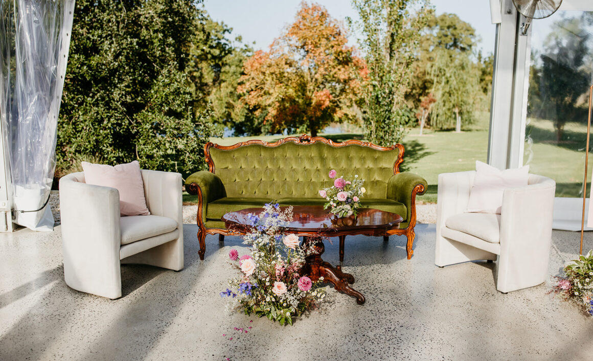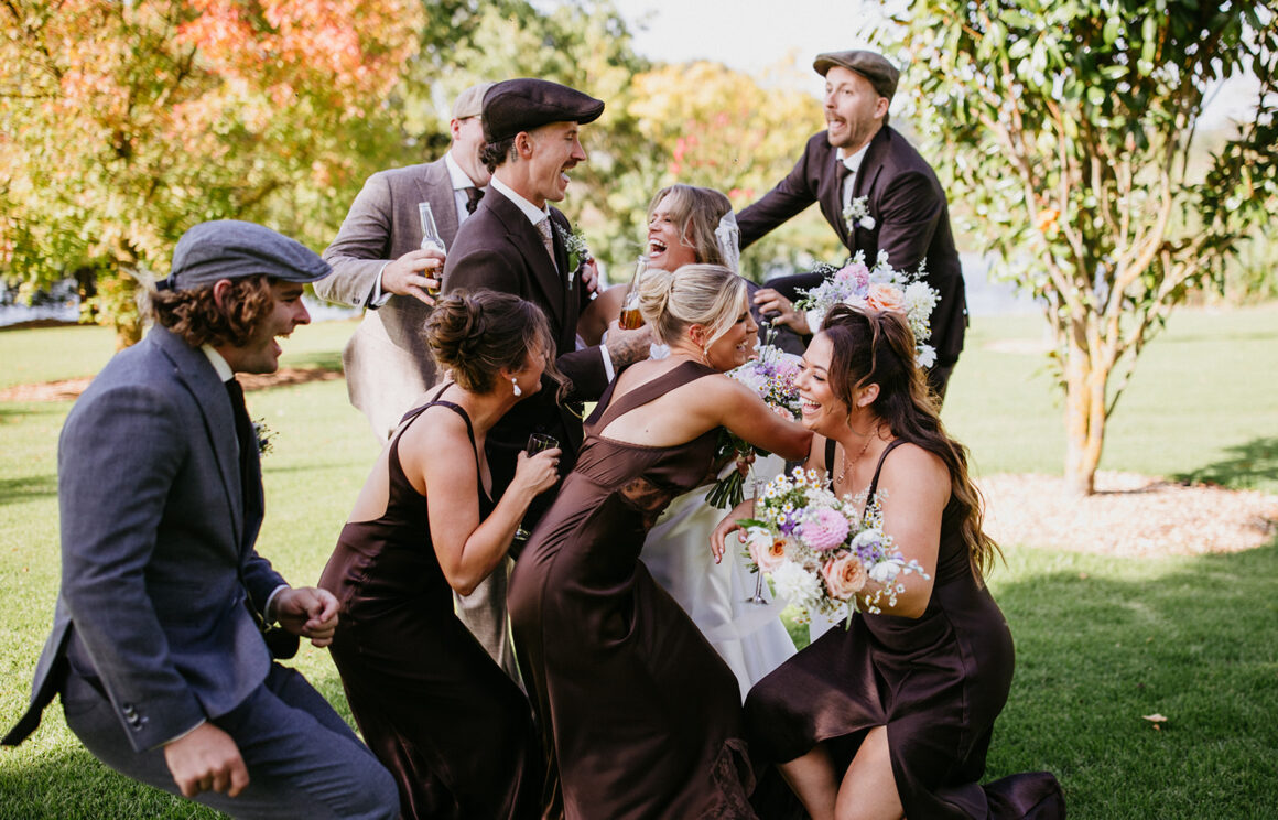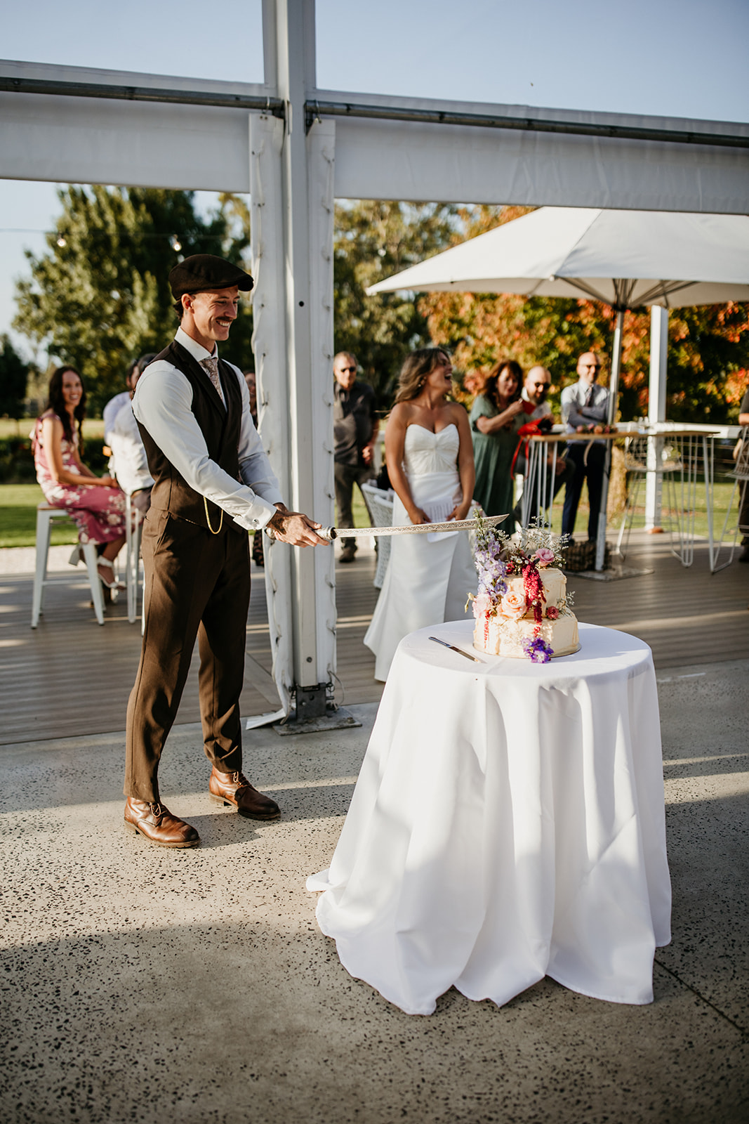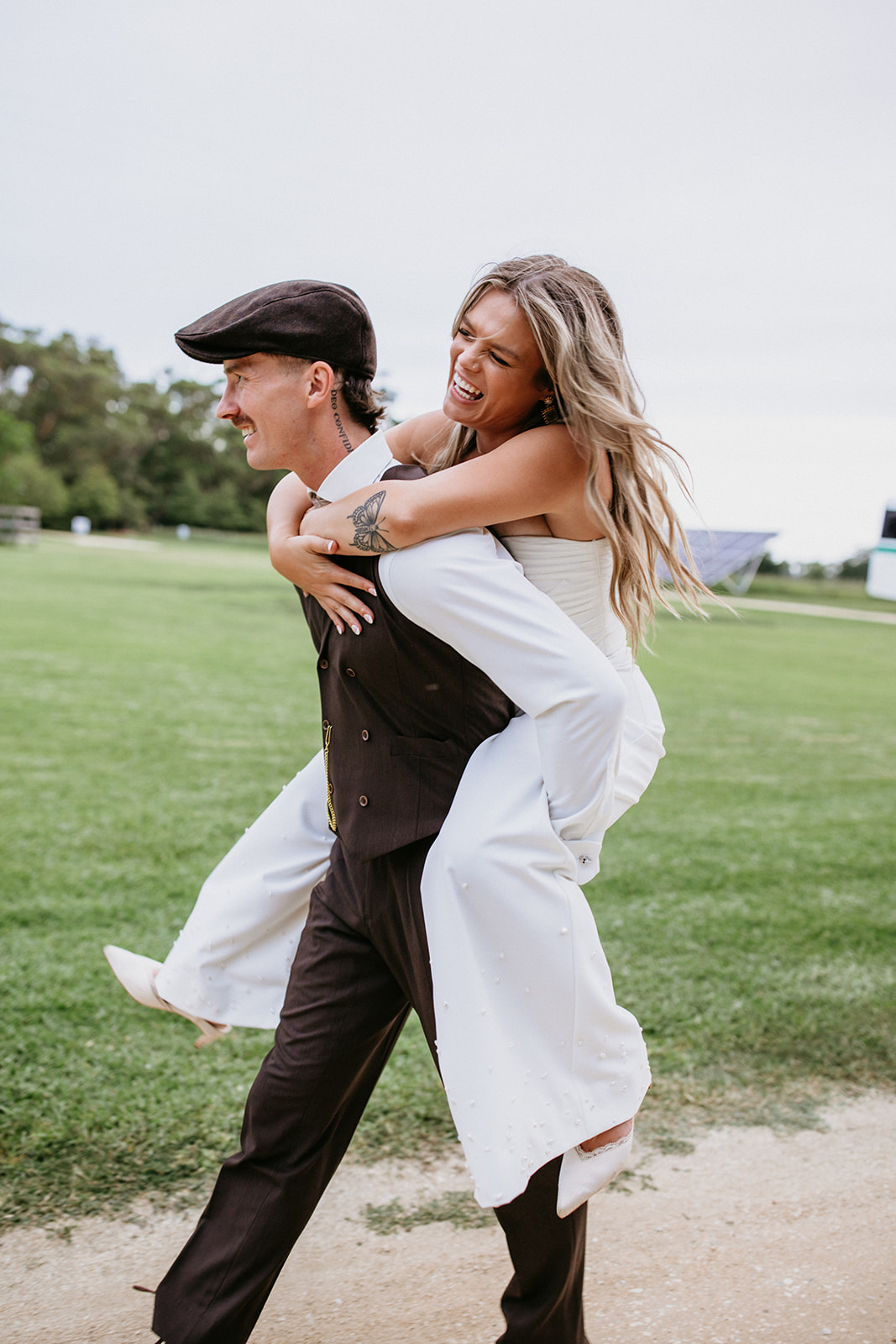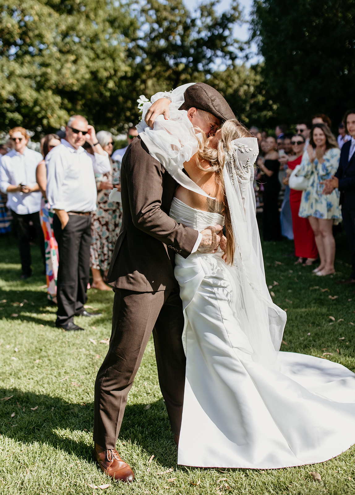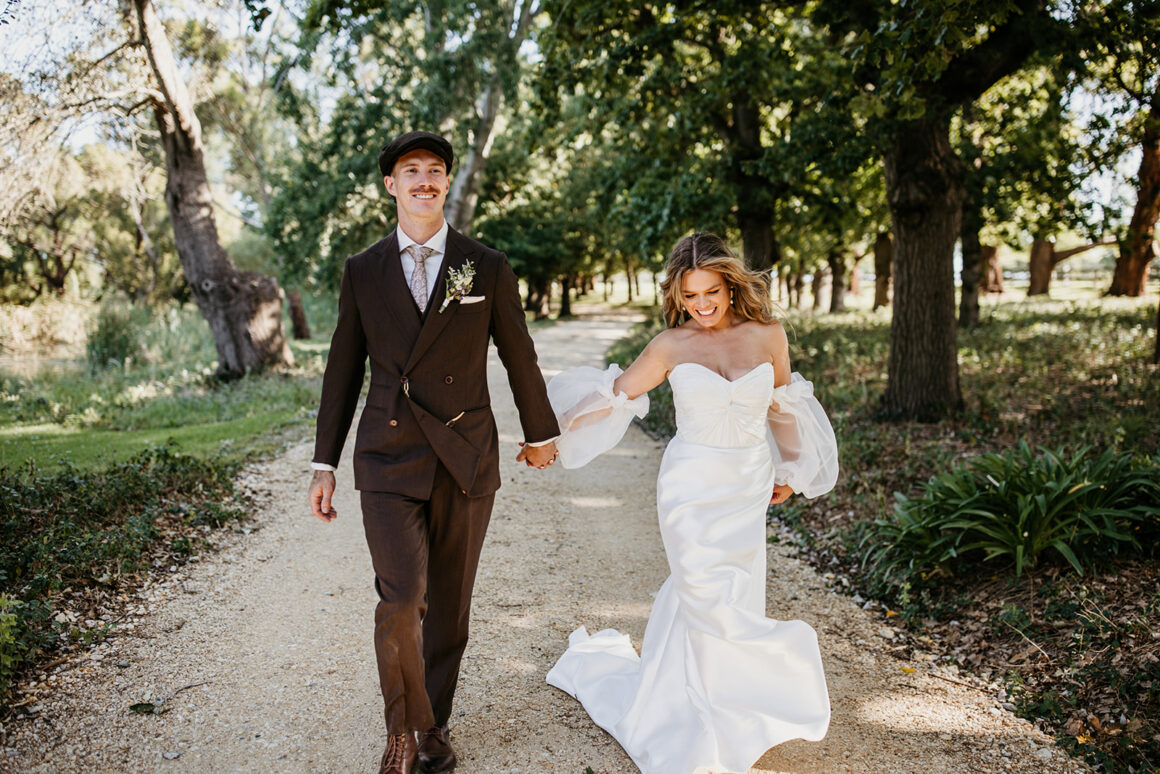 For Nadine and Link, Mewburn Park Homestead was an easy pick. But, when it came to narrowing down a theme, the pair were pulled in a few different directions. “We started with a Woodstock-inspired vibe,” the couple explained. “But when Link fell for the Peaky Blinders look, we knew we had to pivot.” Thankfully Nadine and Link had Lauren from ETC. Wedding Styling in their corner, who was able to create a “wild mash-up” of vibes. “Peaky Blinders/The Gentlemen meets Bridgerton, with just a hint of Woodstock boho. Sounds crazy, but it was perfection and [ETC] absolutely nailed it!”