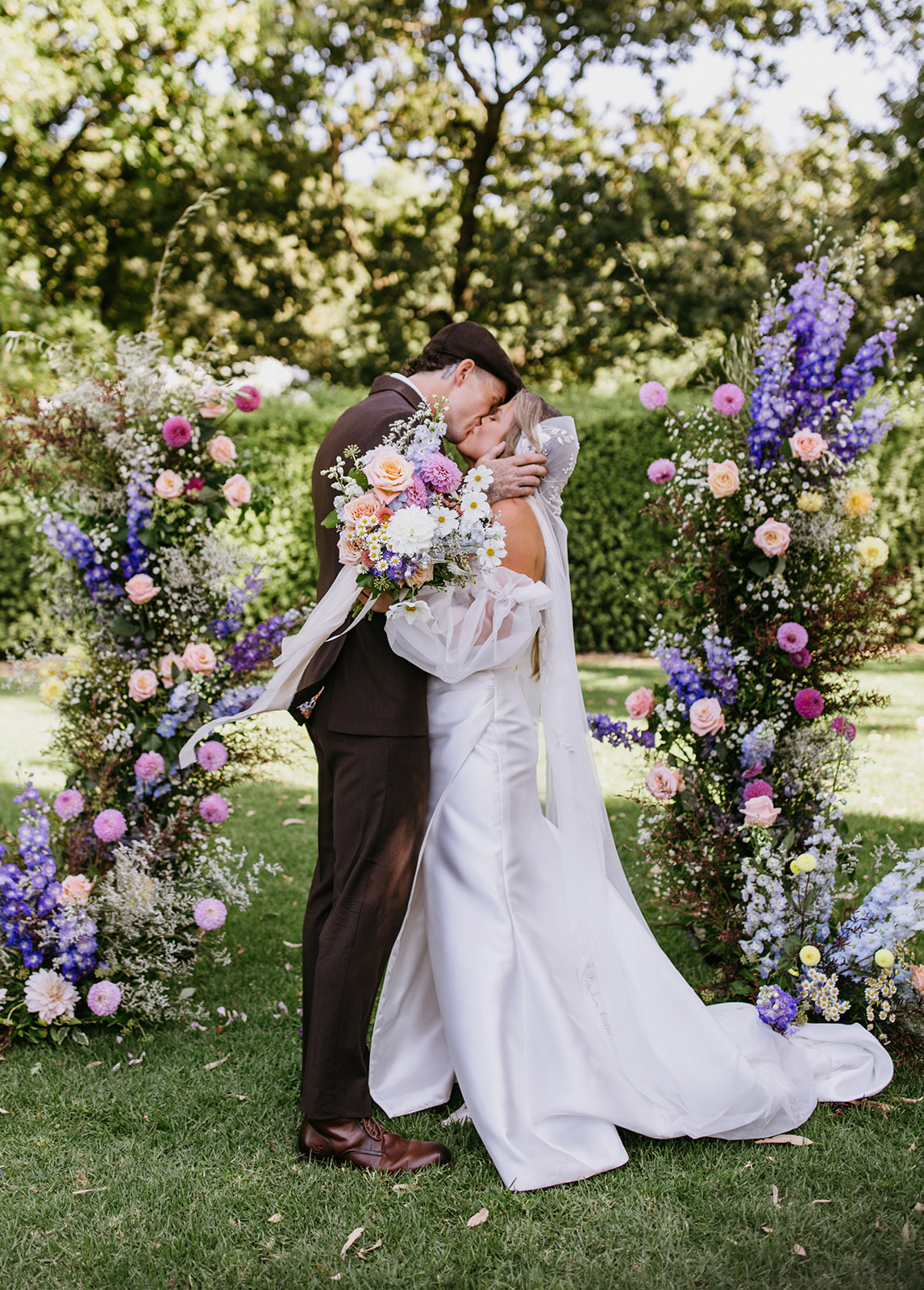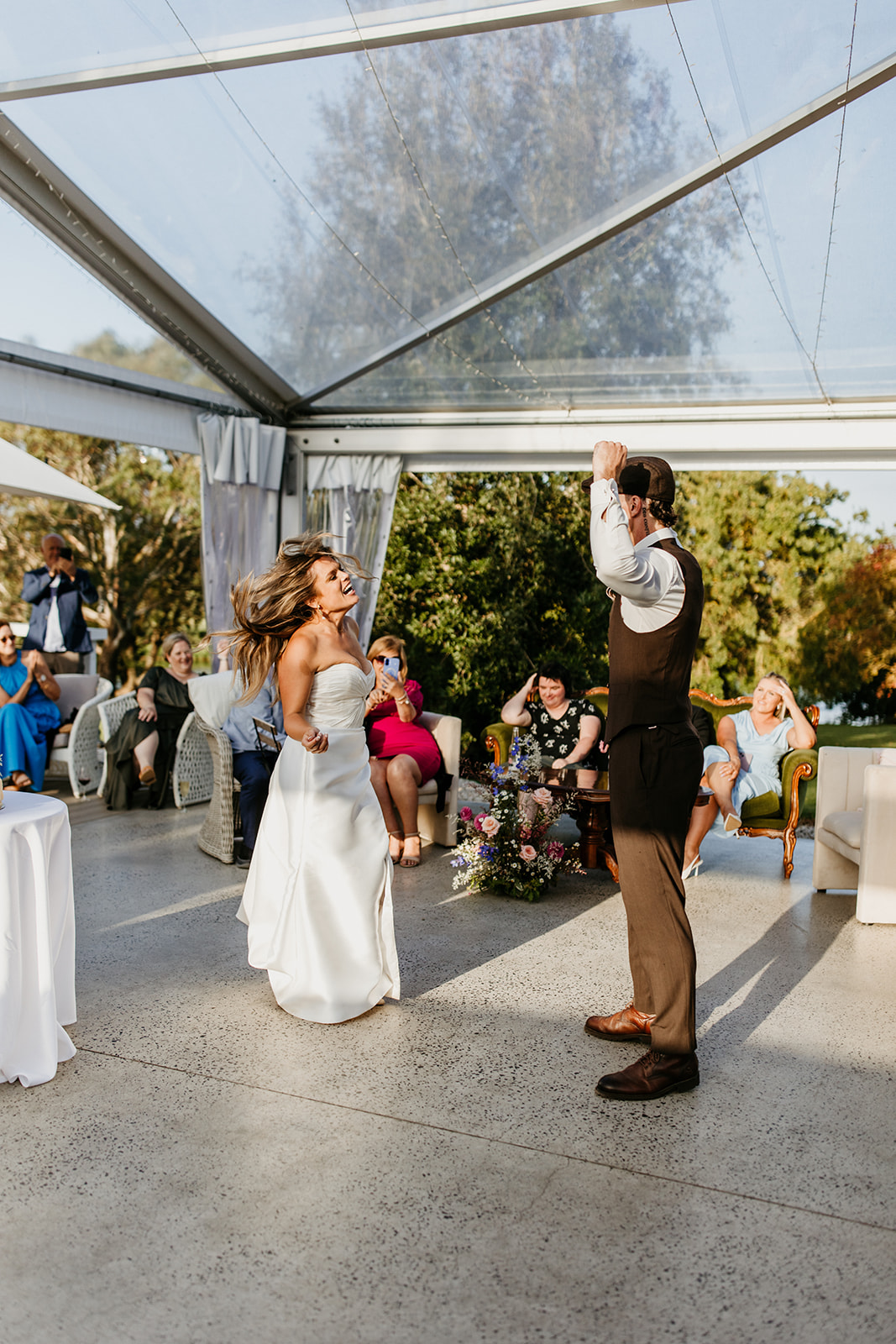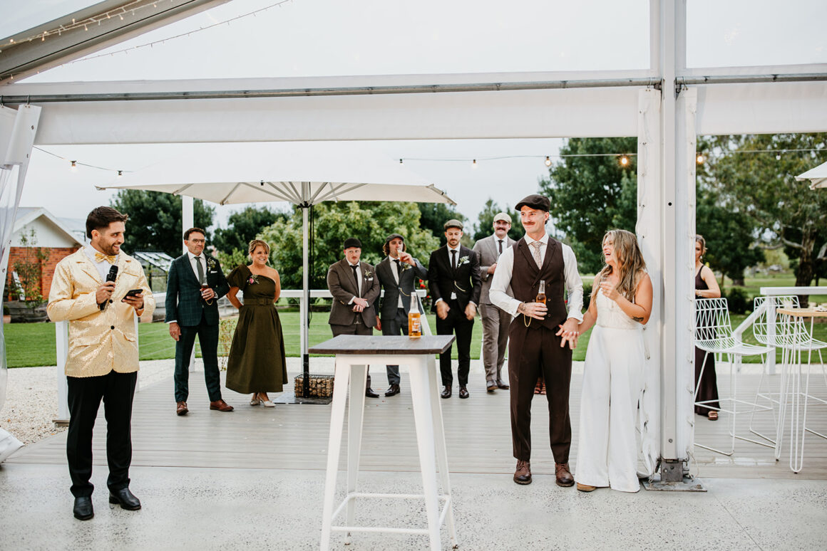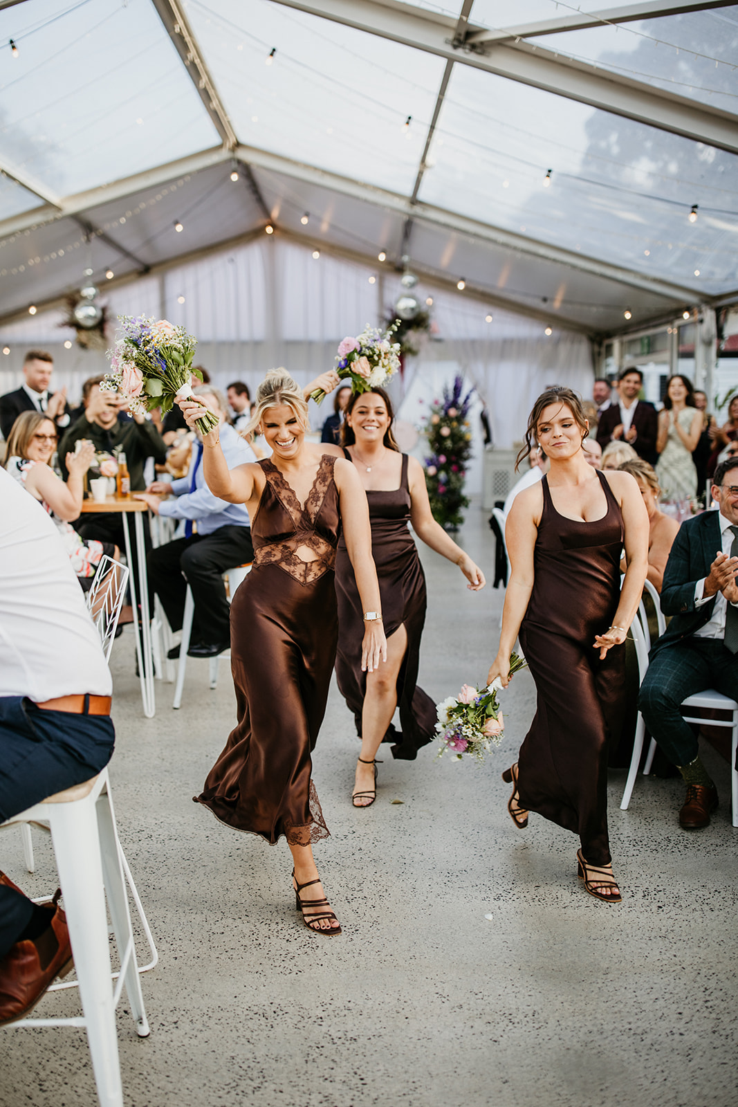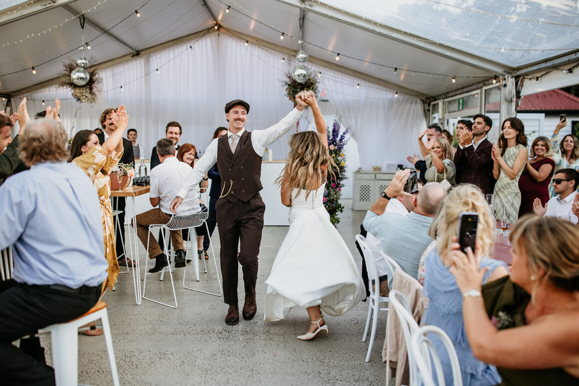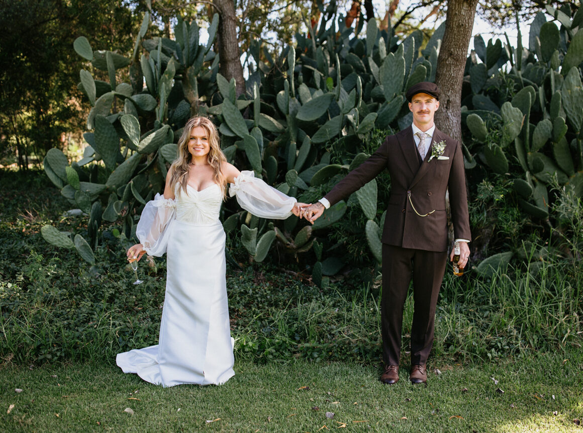 For Nadine and Link, Mewburn Park Homestead was an easy pick. But, when it came to narrowing down a theme, the pair were pulled in a few different directions. “We started with a Woodstock-inspired vibe,” the couple explained. “But when Link fell for the Peaky Blinders look, we knew we had to pivot.” Thankfully Nadine and Link had Lauren from ETC. Wedding Styling in their corner, who was able to create a “wild mash-up” of vibes. “Peaky Blinders/The Gentlemen meets Bridgerton, with just a hint of Woodstock boho. Sounds crazy, but it was perfection and [ETC] absolutely nailed it!”