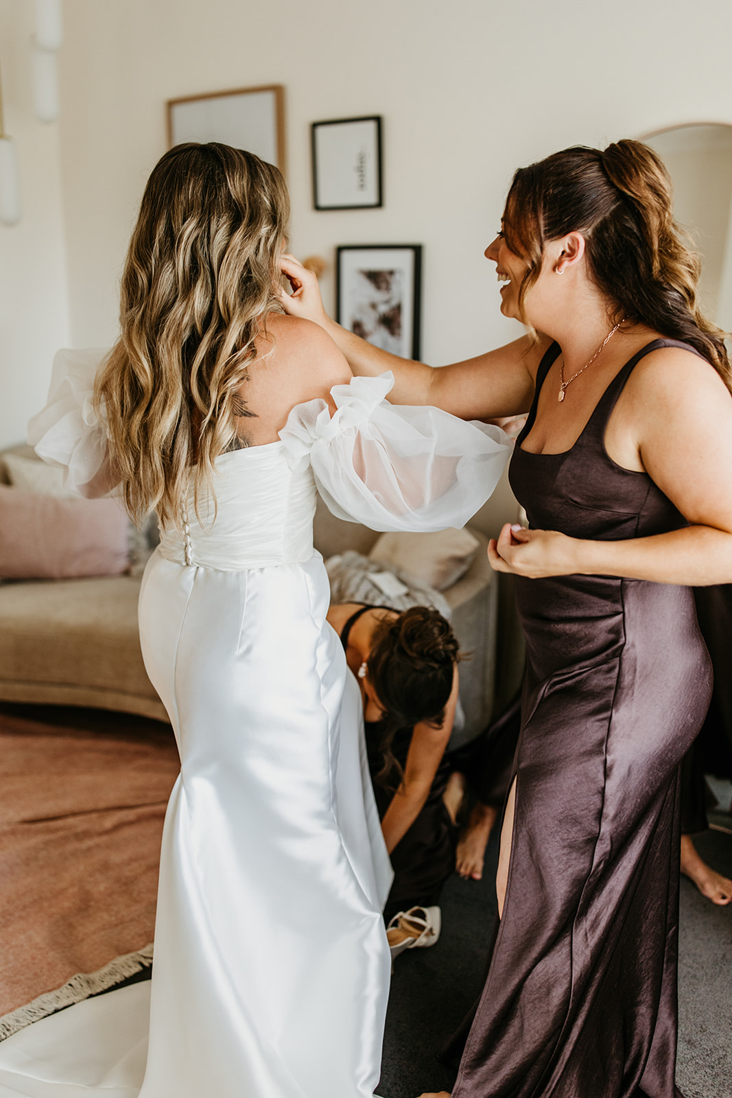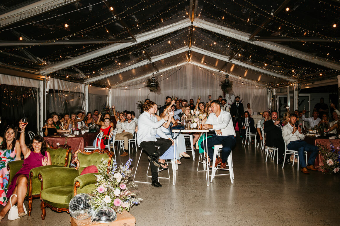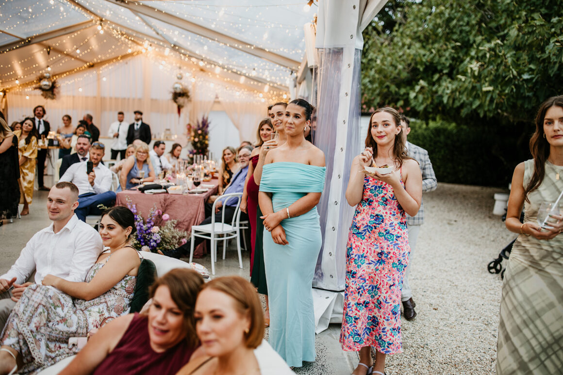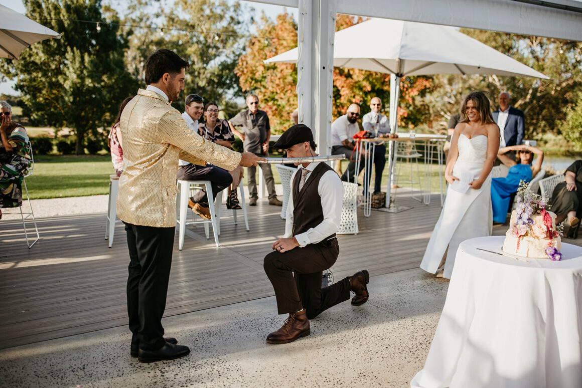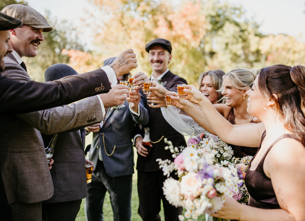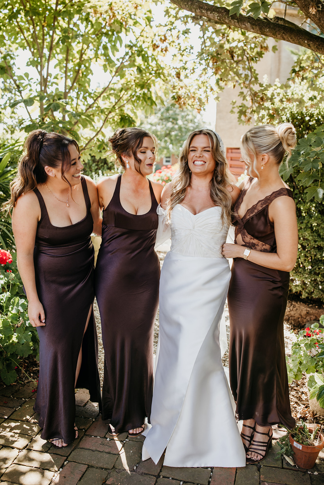 For Nadine and Link, Mewburn Park Homestead was an easy pick. But, when it came to narrowing down a theme, the pair were pulled in a few different directions. “We started with a Woodstock-inspired vibe,” the couple explained. “But when Link fell for the Peaky Blinders look, we knew we had to pivot.” Thankfully Nadine and Link had Lauren from ETC. Wedding Styling in their corner, who was able to create a “wild mash-up” of vibes. “Peaky Blinders/The Gentlemen meets Bridgerton, with just a hint of Woodstock boho. Sounds crazy, but it was perfection and [ETC] absolutely nailed it!”
