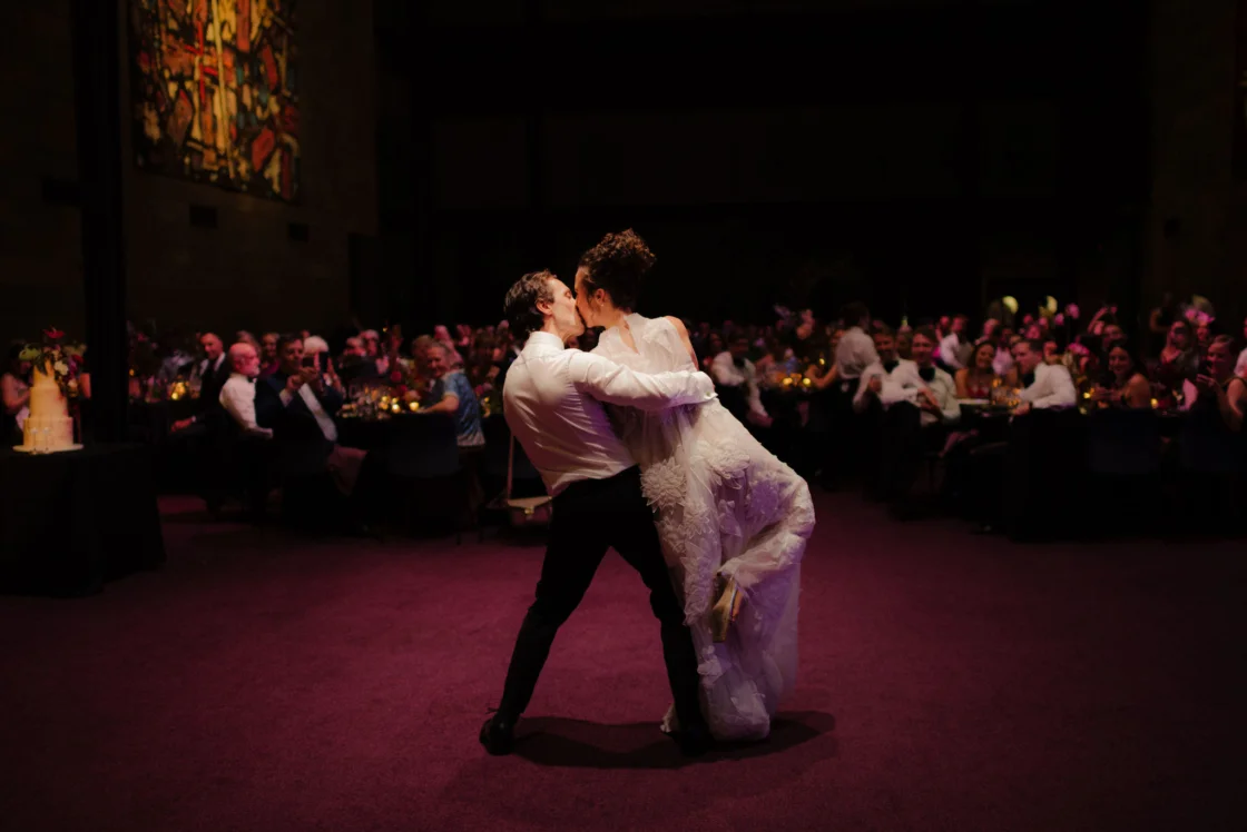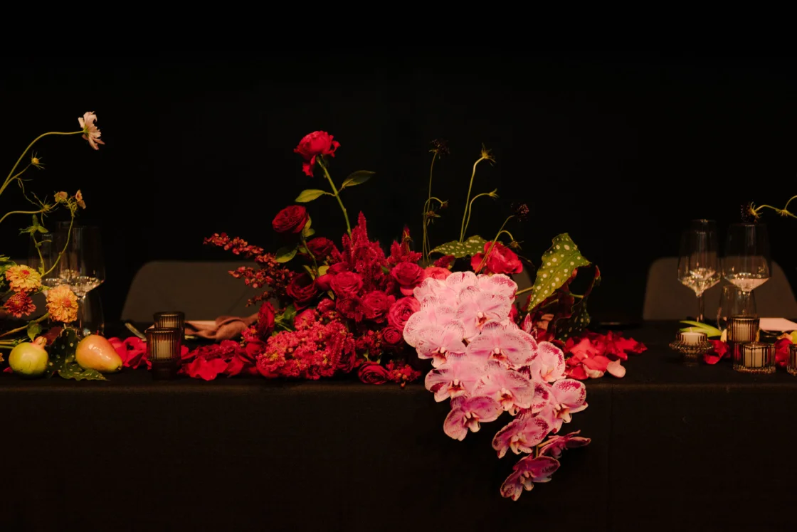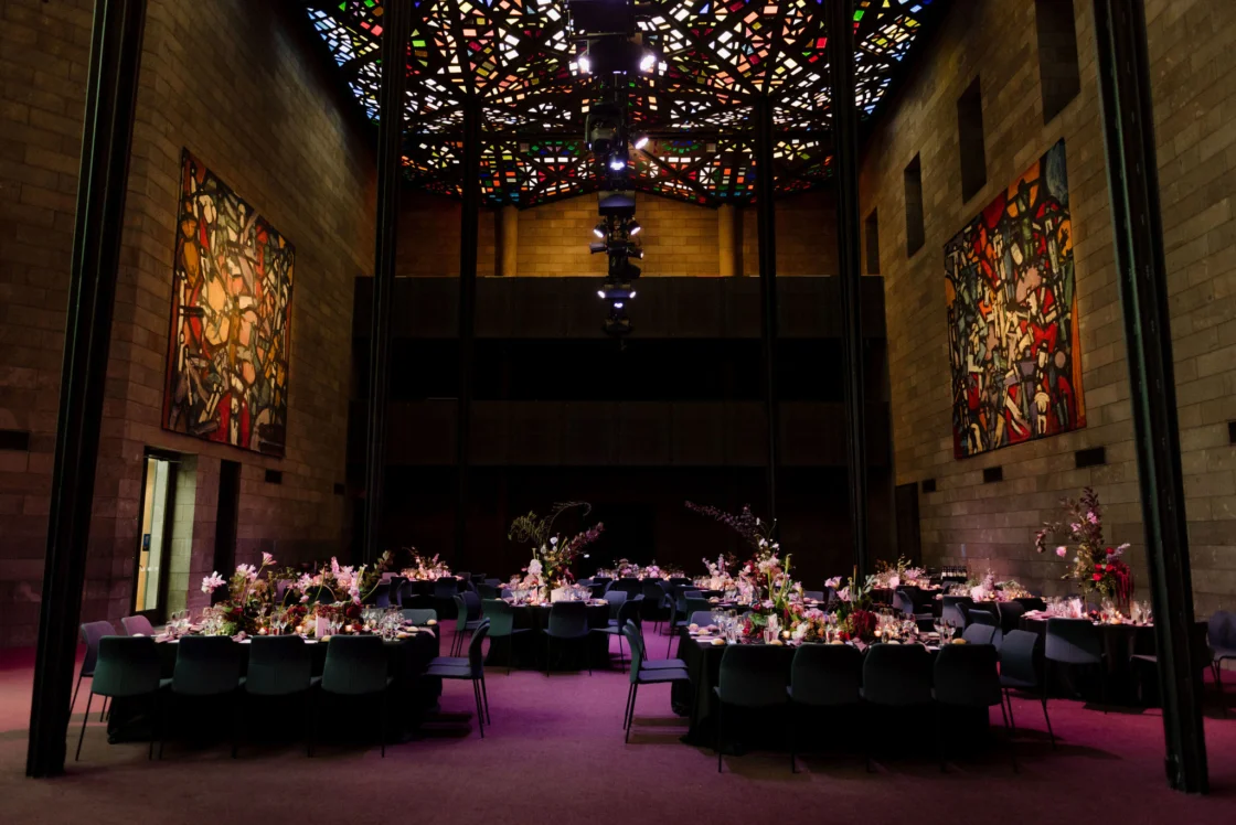 THE INSPO “The stained glass roof and the carpet of the Great Hall (NGV) – I wanted them to sing. Which is why we went with a romantic, moody theme with reference to Renaissance & Dutch still life paintings of Flower art. It was pretty overwhelming seeing the great hall for the first time (flowers, cake, table settings, place cards, napkins), this was something I was dreaming up for 18 months (and rescheduled three times). I didn’t have a stylist making decisions for me, I didn’t have a showroom to see what the table layout would look like, it was all in my head and seeing it come together was incredible.”