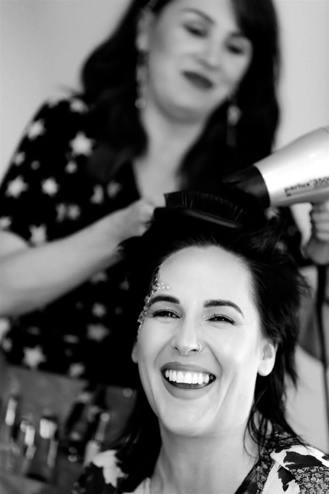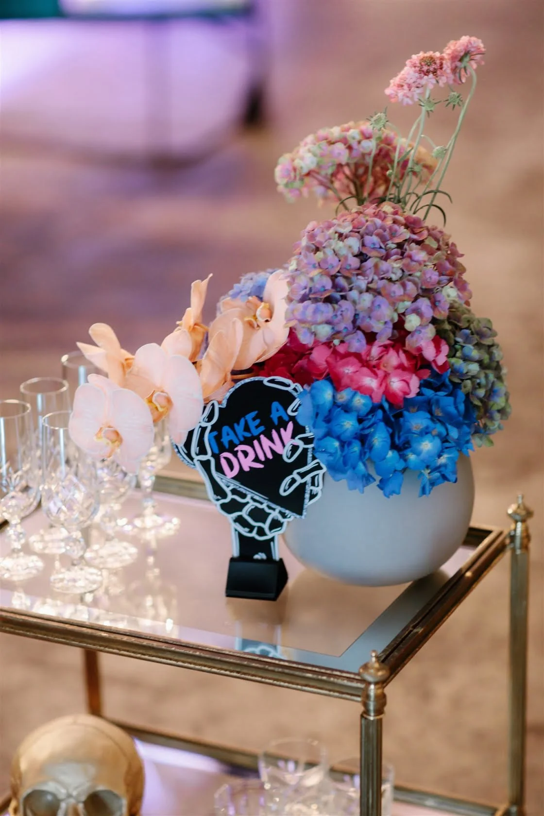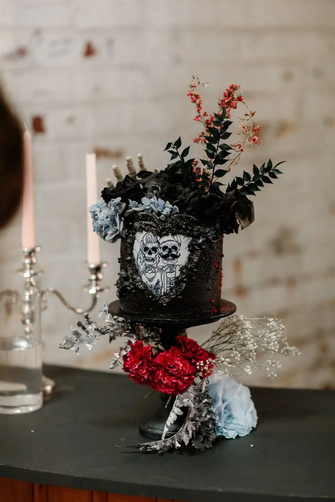 FAVE DETAILS “I was obsessed with the flowers [by Babiana Botanic]! They were just magic. Our bright pink neon upside down cross at the head of the table was nuts and the blue and pink velvet touches were amazing. We had a ‘love motel’ bed with a projector in the background playing an old 80s skateboard movie, there was also a retro sitting area with a vintage sink with ice and bubbly wine in it also. On the wall was another neon sign saying ‘it was all a dream’. Our cake was black with a skeleton hand coming out of it. It was divine. The food!! Aghh unbelievable! A modern take on junk food with fried chicken and mash and gravy and tacos and mini burgers. We also had a tattooist set up behind the ceremony with a flash sheet displayed in an old television set. Our daughters covered themselves in the stick-on ones and most of the vendors got their first tattoos!”