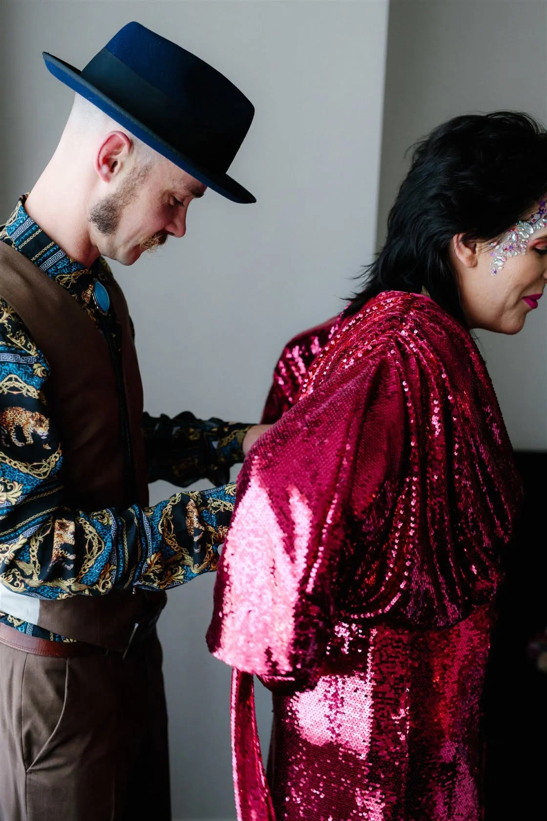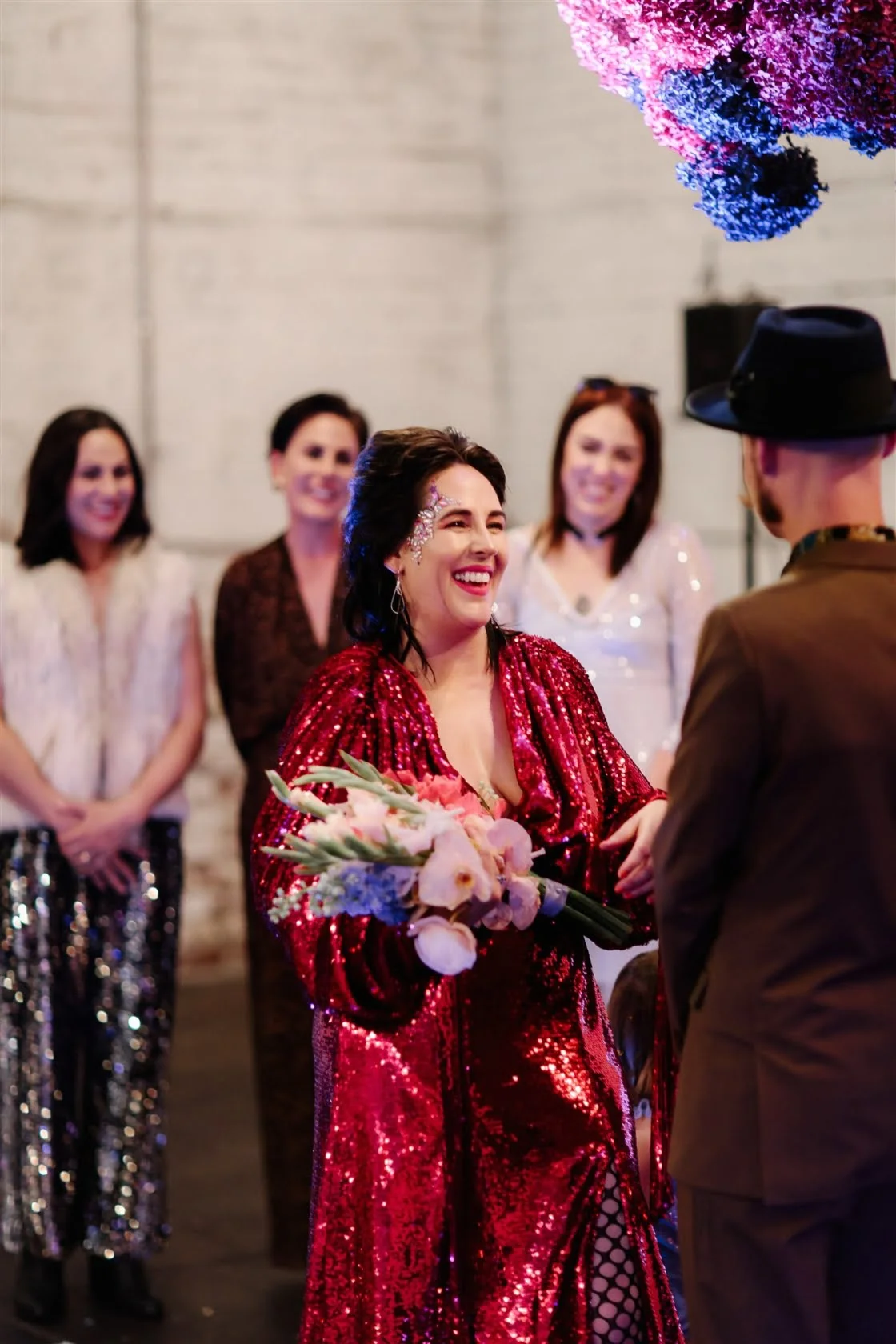 Winning at life by winning this wedding, Pepe and Sam tied the knot in front of 30 of their nearest and dearest and lucky they did, as even though they’ve been together for eight years, got engaged after just eight months and have two kids together, they had no plans to ever marry. Photographer Oli of Briars Atlas explains, “the key vendors were a group of Mallrats called The Matrimonials. We formed a music-less band, and came together to offer a wedding package as a wild and creative kickstart to the year.” Safe to say you nailed it, guys. A few of our fave vendors, Nat Sproal Celebrant, Good Day Club and Babiana Botanic were involved, too, and you can see it all below…