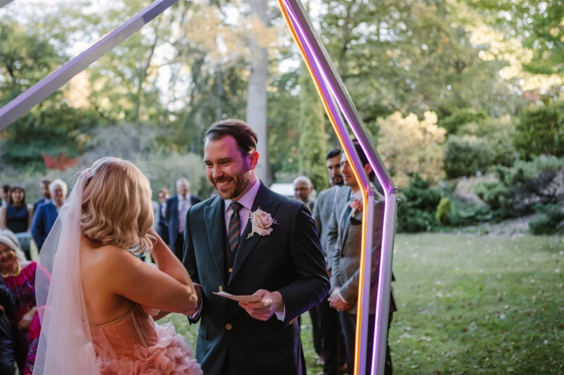 FAVE DETAILS “The video game arcade station! We both like playing video games and it was something we really connected over early on, so getting to play a round of Street Fighter on our wedding night was something we really wanted to make happen. Also, my dress because I felt like such a dream wearing it [and] the neon arbour. Our good friends at Custom Neon hooked us up with a strip of neon rope that we attached to a frame. We then had it moved to the reception for the dance floor where it really added to the vibe!”