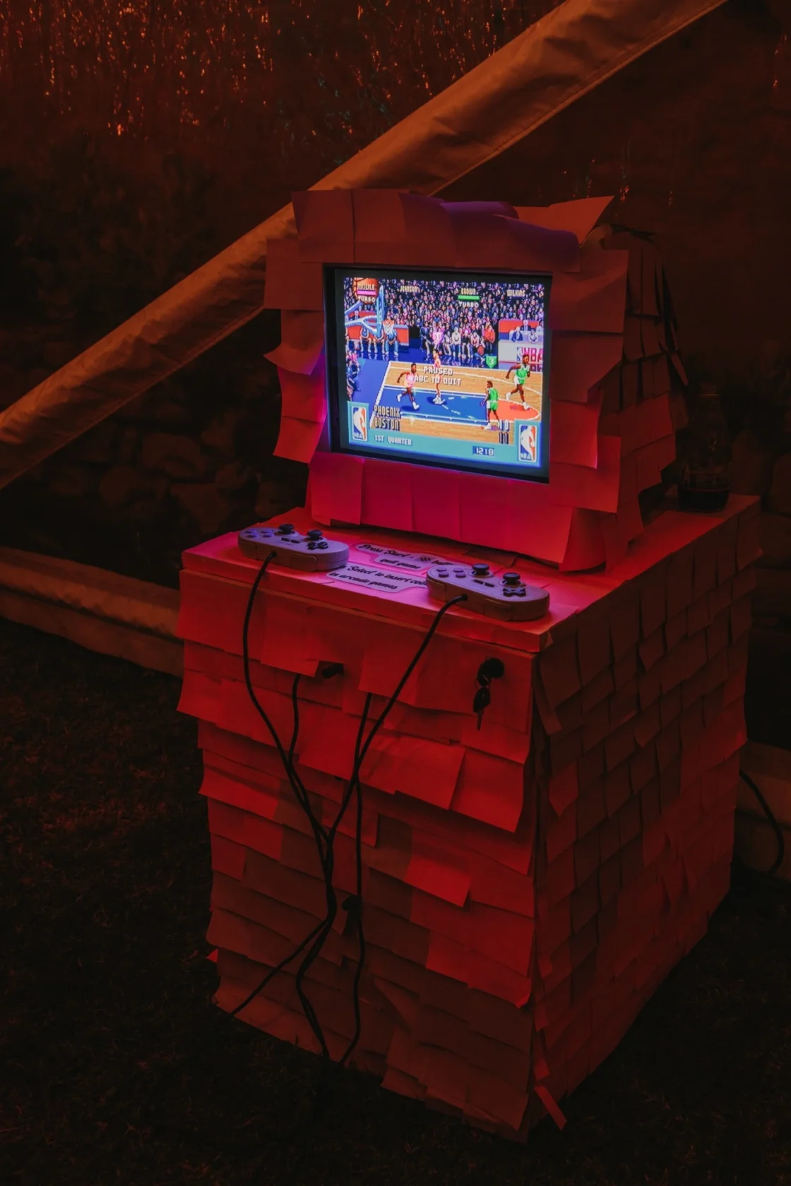 DIY “We hot glued about 10 disco balls of various sizes together, with floral foam in the centre. We then stuck fresh and dried florals into the foam so it looked like a little flower disco ball explosion. Disco ball place cards, streamers, arcade game set up, the invitations, seating chart, welcome signs, candles etc.”