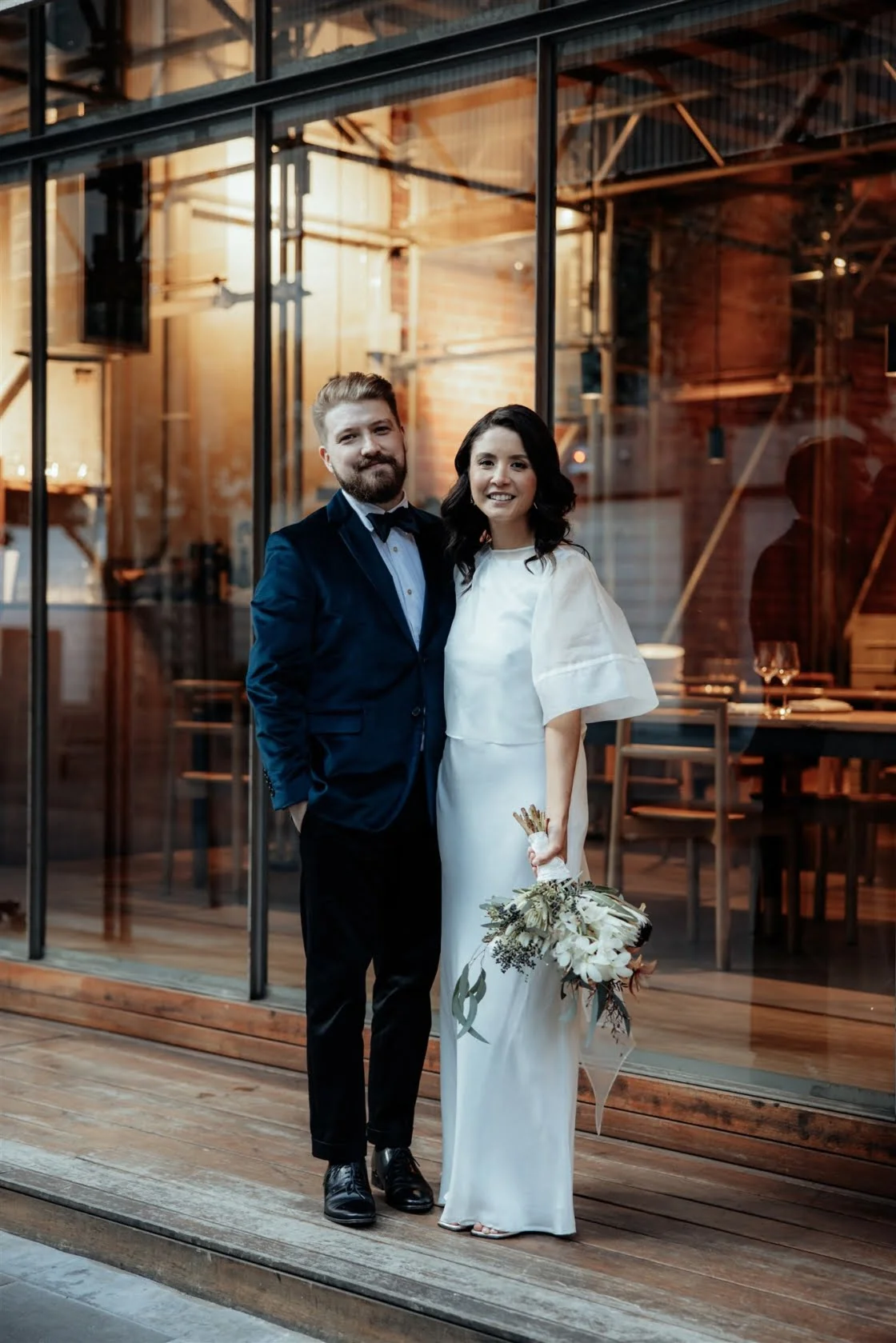 THE INSPO “We wanted the overall feeling for the day to be casual and relaxed. Longsong is a stunning space, and we knew that we didn’t need to have too many extra things in the space to make it special. We did away with a few traditional elements to keep it casual; no entrance, no first dance, no cake. We chose to have only our brother and sister as our bridal party. It was also important to us to try and be sustainable in our approach to planning the wedding when we could. We chose a florist local to us in Footscray (Lilac and The Cat) who focuses on locally grown and sourced flowers and sustainable flower design. We also hired recycled bottles from the florist as vases which looked great.”