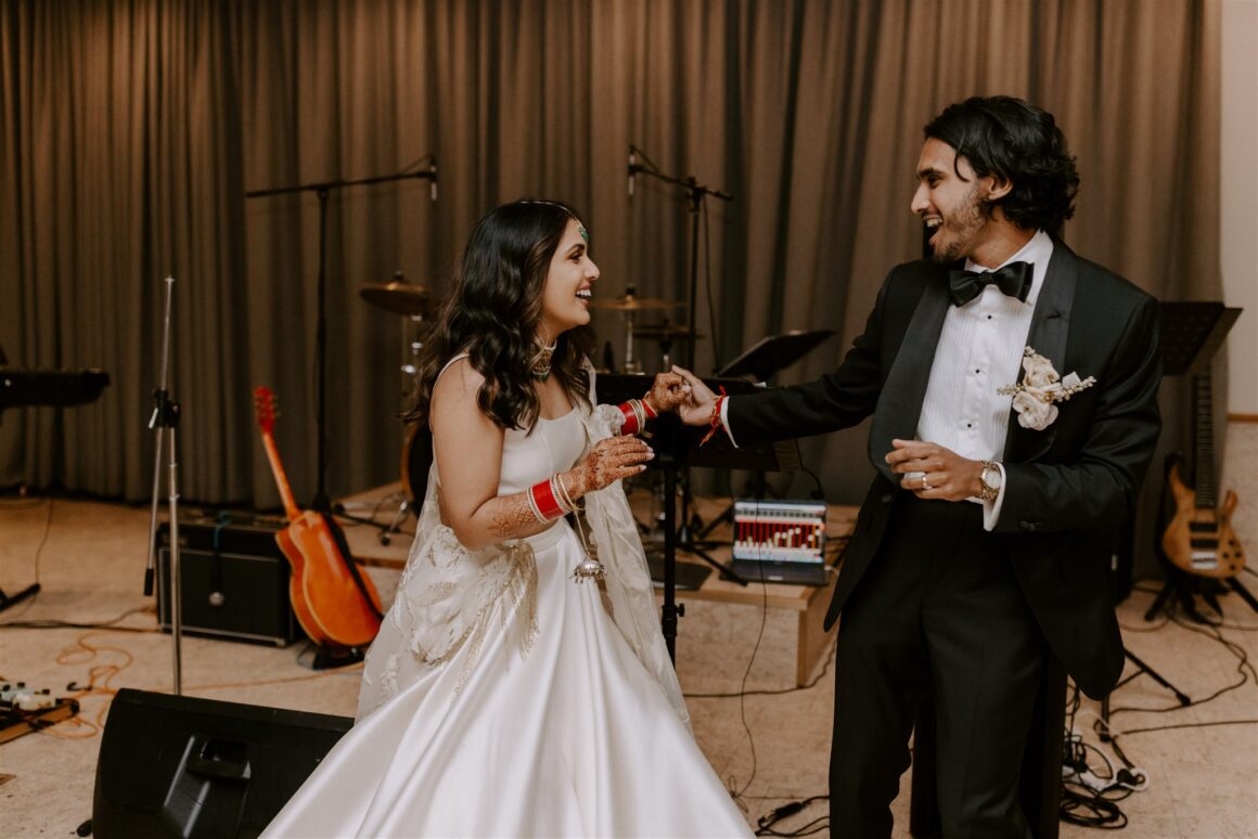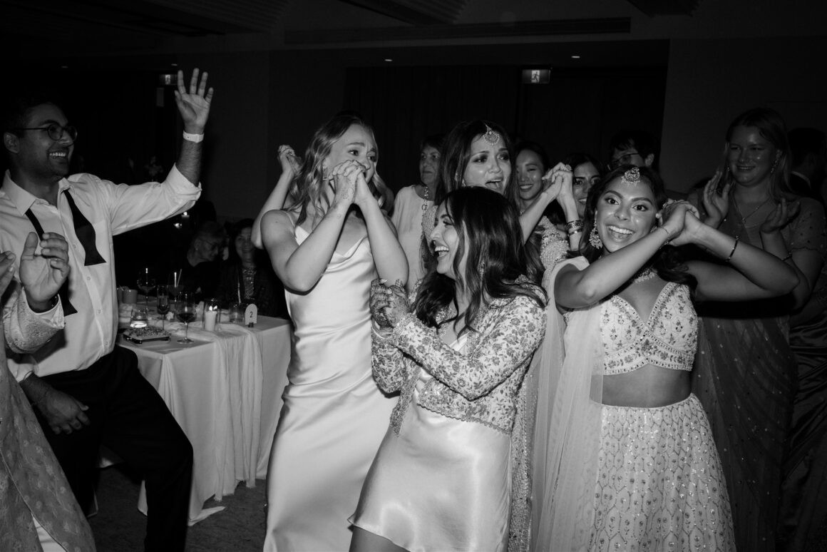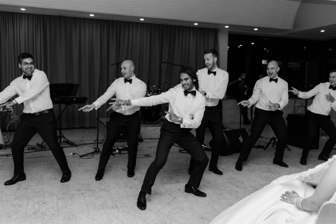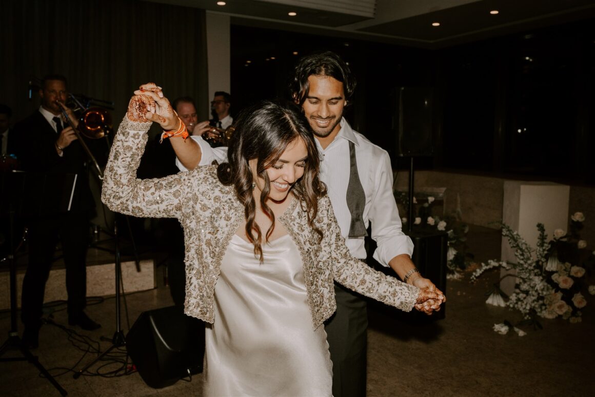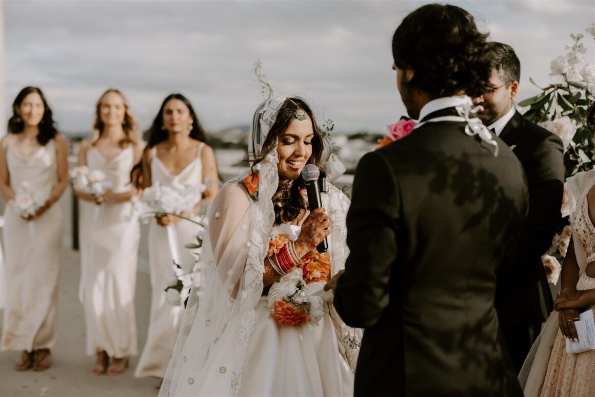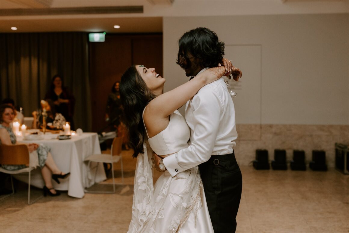 “We had a first look about an hour before the ceremony began. It was just the two of us (and our photographer Janneke and videographer Luke) while we read our vows to each other. It was nice to share more intimate and calm moments together beforehand. The second special memory was sitting down to do the Hindu blessing, we looked out and saw a sea of our favourite people – words cannot describe the happiness that we felt in that moment. We were really lucky to have family come all the way from various parts of the world to celebrate us. Last and definitely not least, Gihan, the groomsmen, our MC and my brother prepared a dance to surprise me at the reception. Gihan made a mix of all my favourite songs and instagram reels, and incorporated lots of my own, “cool” dance moves of the day!”