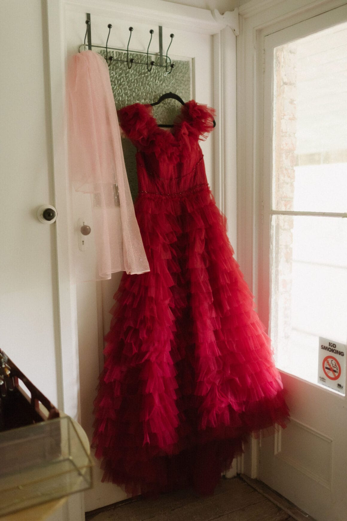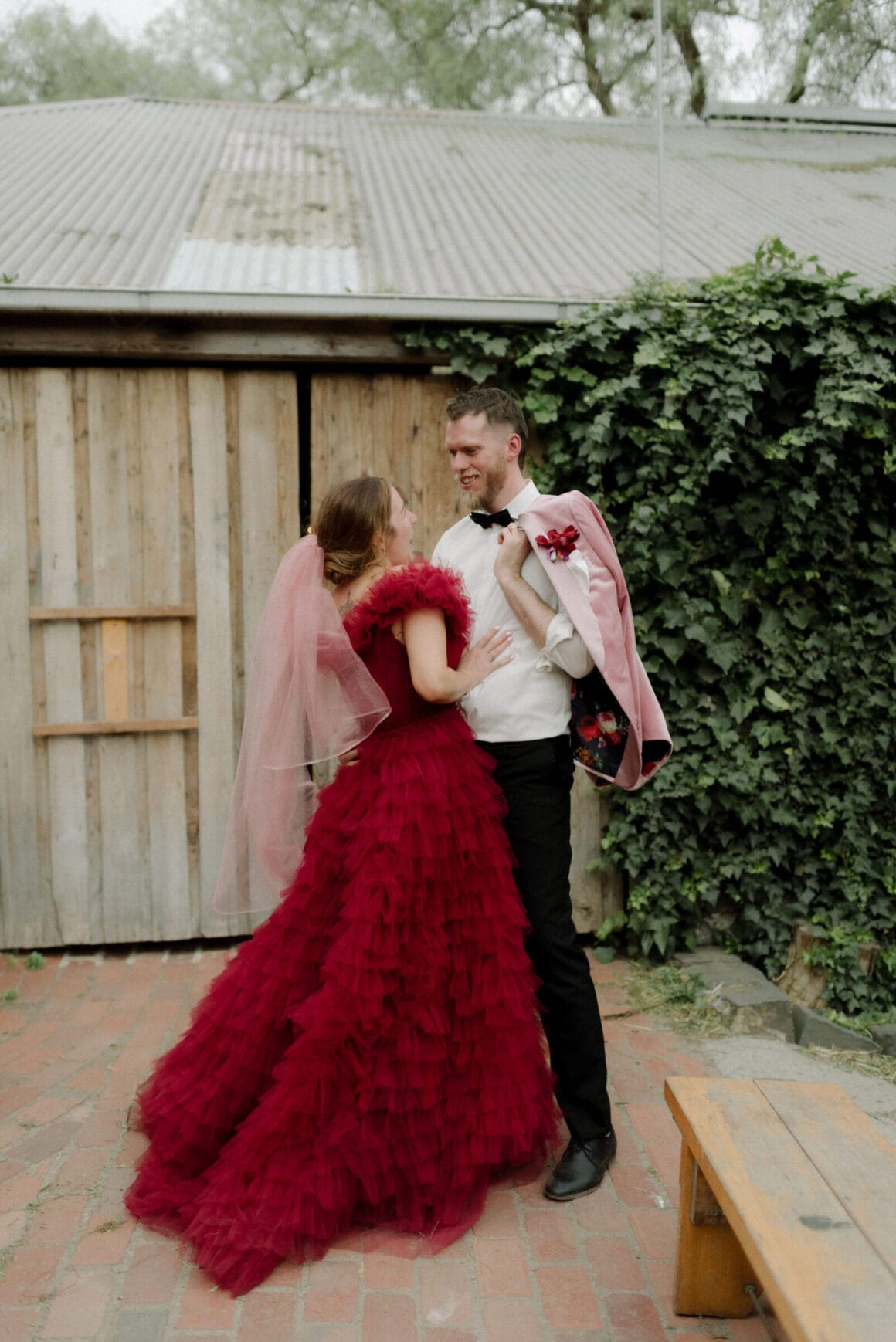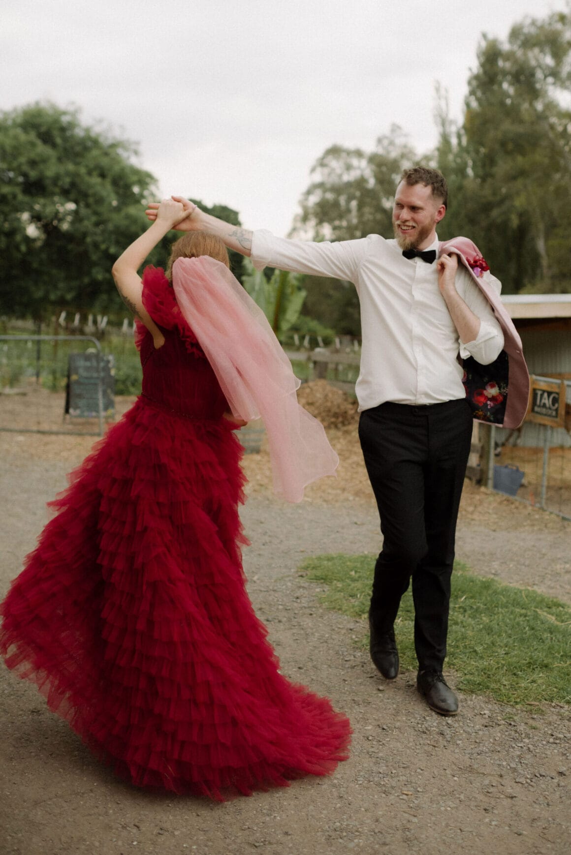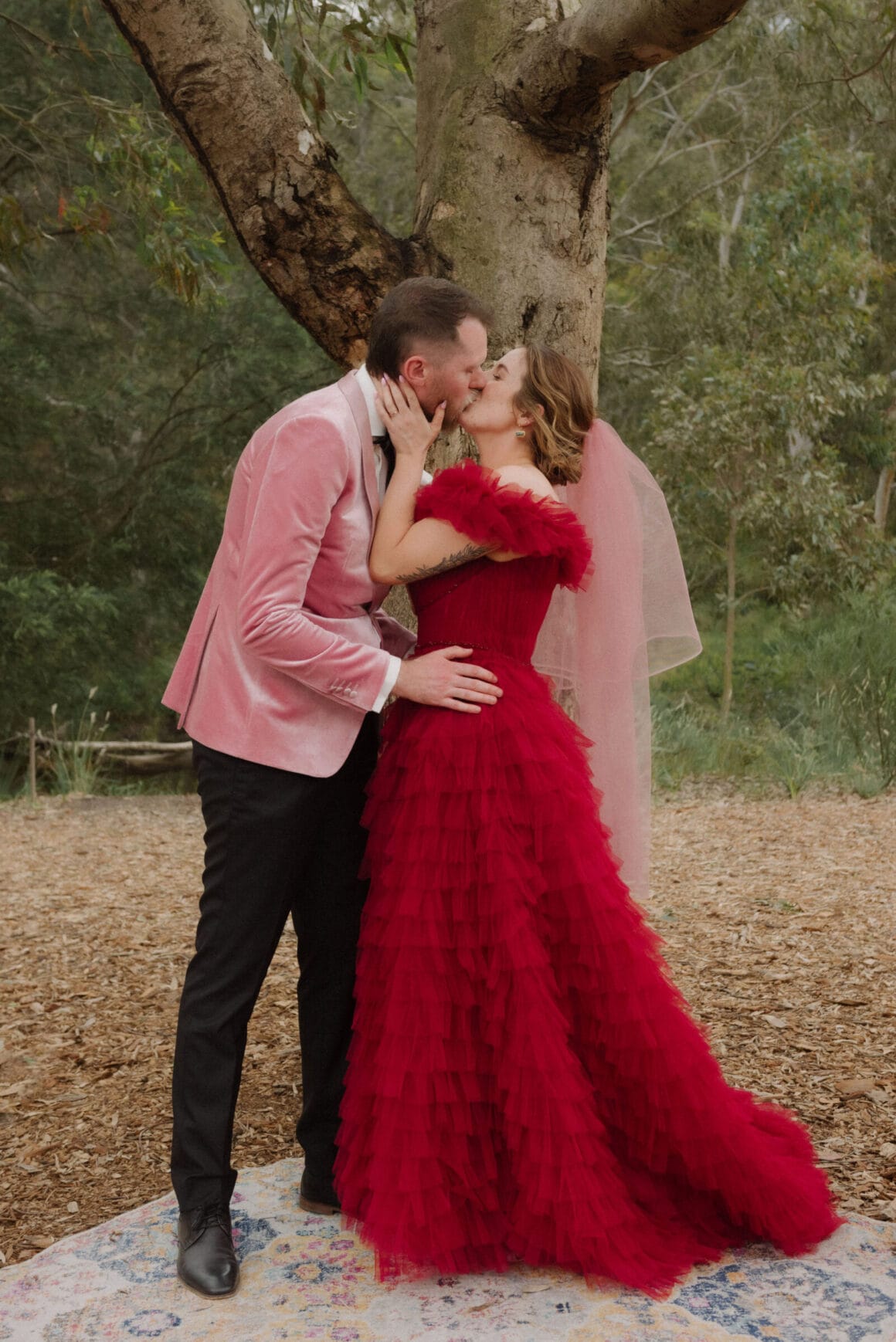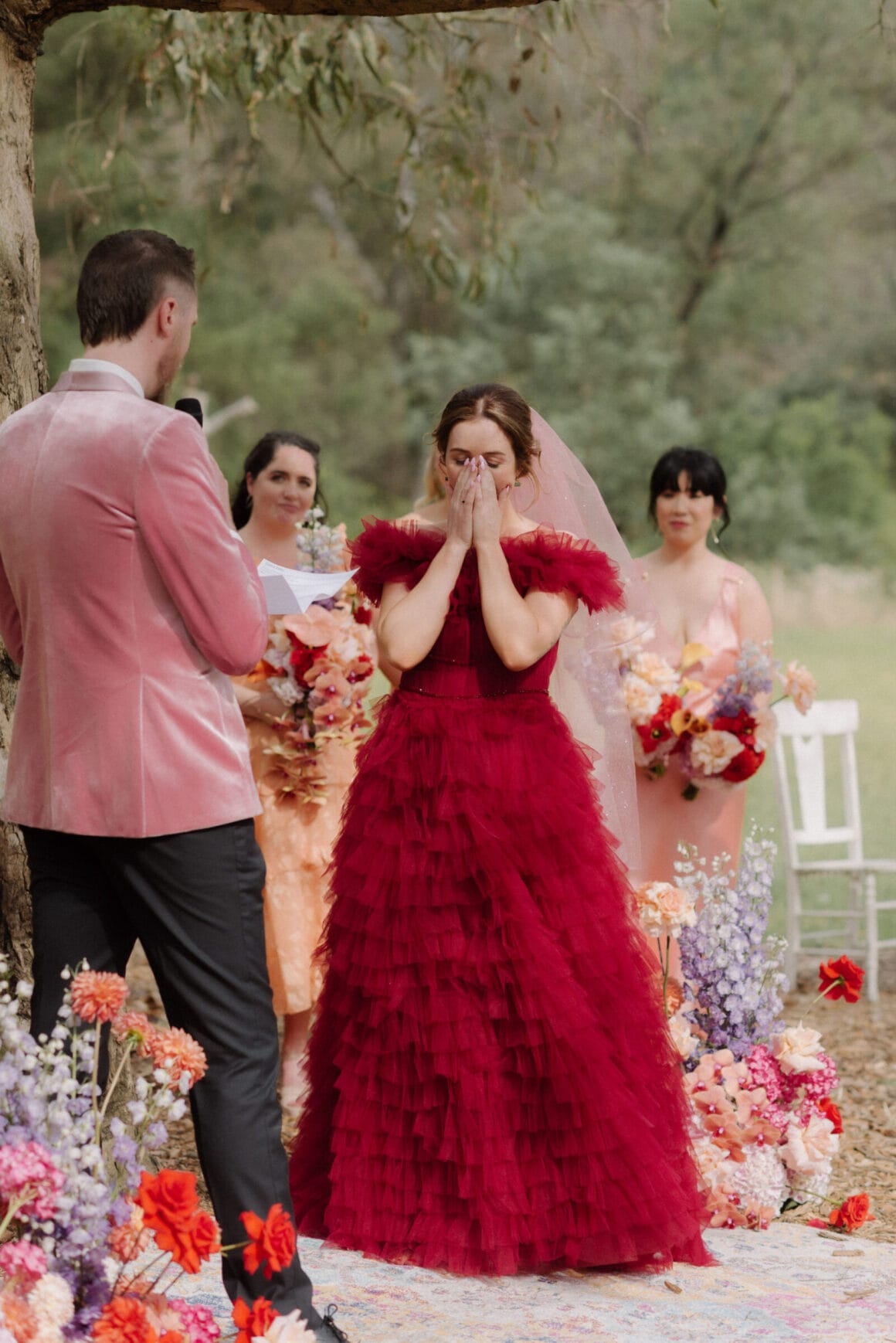 THE GOWNS “I wouldn’t usually class myself as an extra person, but I definitely went big on my wedding day with three dresses. The ceremony dress was a surprise find – I was just trying on dresses for fun when I slipped into an explosion of maroon tulle. I hadn’t planned on wearing colour, but the moment I saw myself in it, my whole face lit up. It was less rational decision and more pure, unfiltered joy. But I also had this inkling that my mum would love the challenge of making a wedding dress for her only daughter (her mum had made hers too). So, despite living in New Zealand, she made three separate trips to Melbourne, adapted some patterns she already had, and we hit up a bunch of fabric shops. With only a few meltdowns along the way, in literal weeks she somehow whipped up the most stunning white ‘first look’ dress, hunched over a makeshift trestle table using a borrowed sewing machine in the corner of our kitchen (I made a lot of witty references to Rumpelstiltskin). It felt so special wearing something she’d made, and it photographed beautifully. Then, because two dresses weren’t enough, I had a third.”