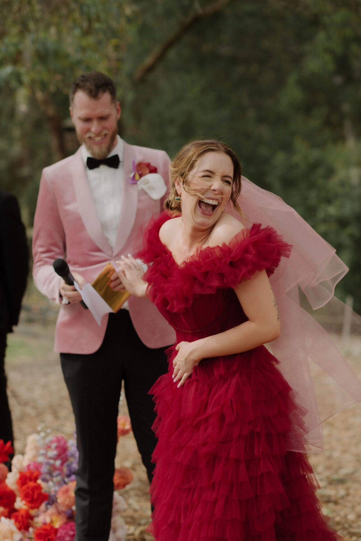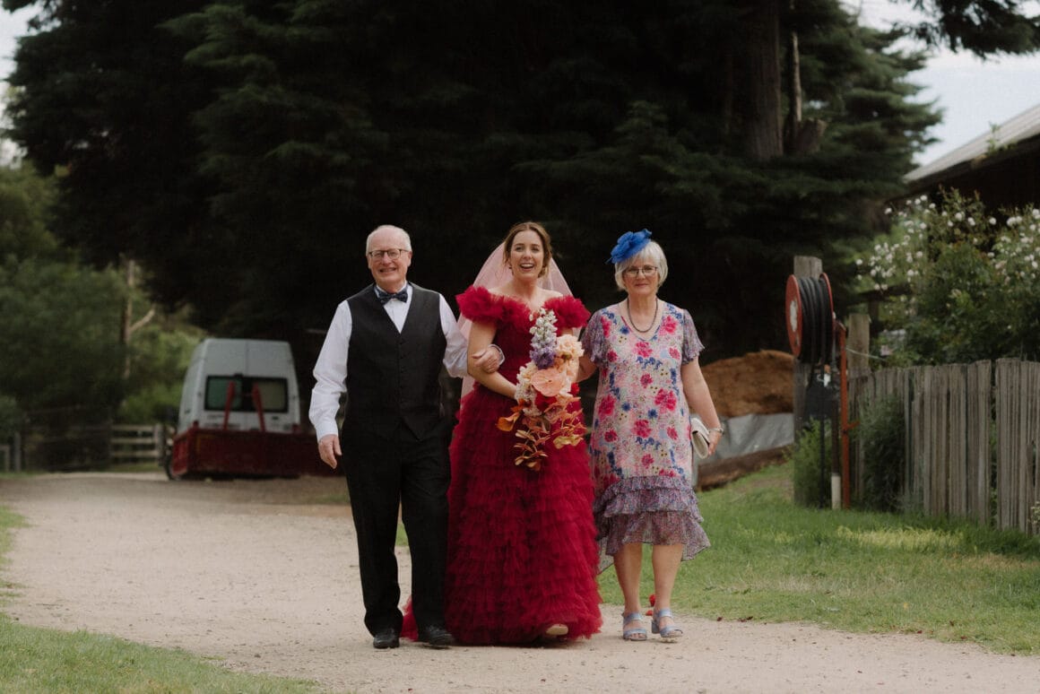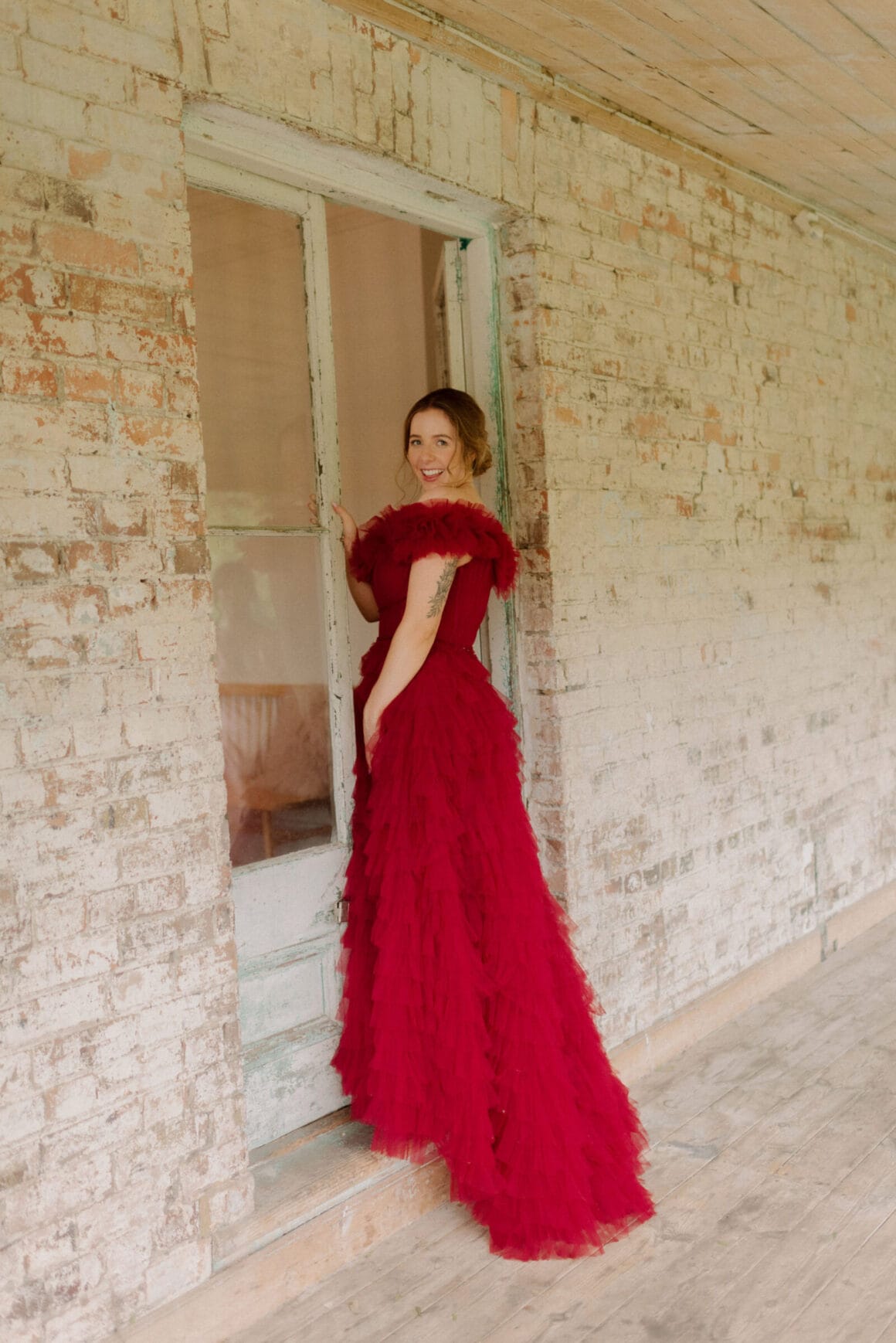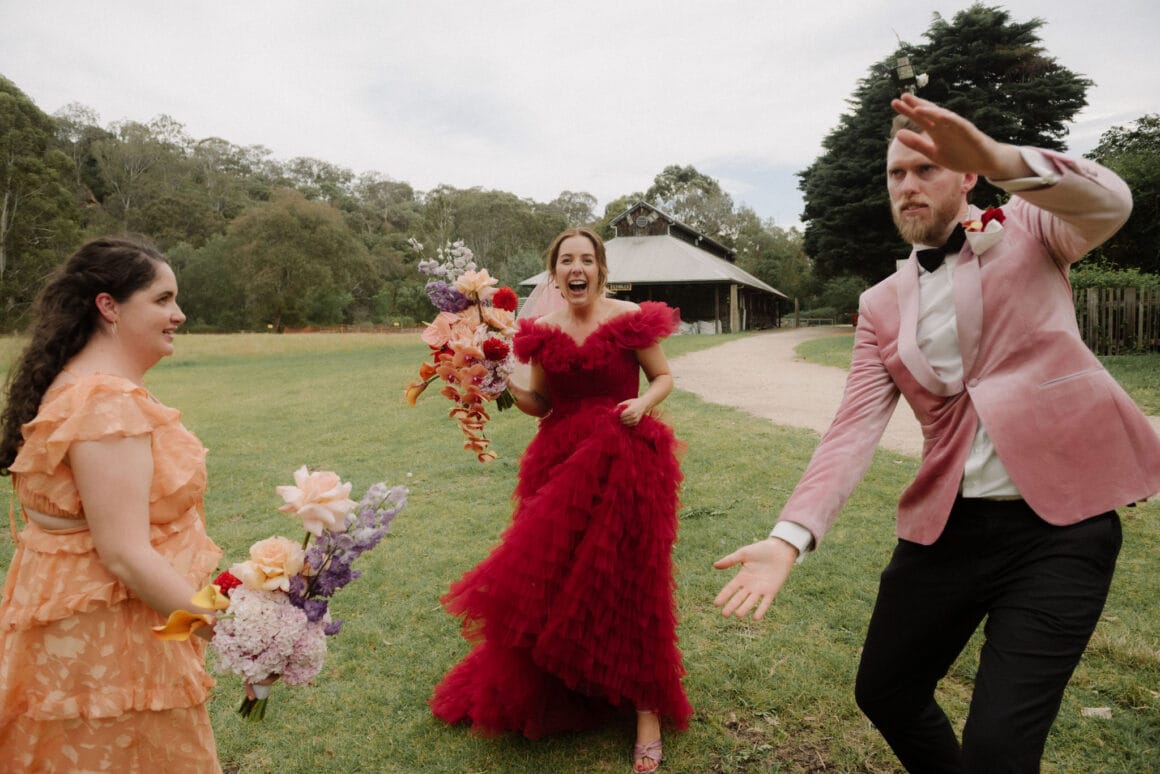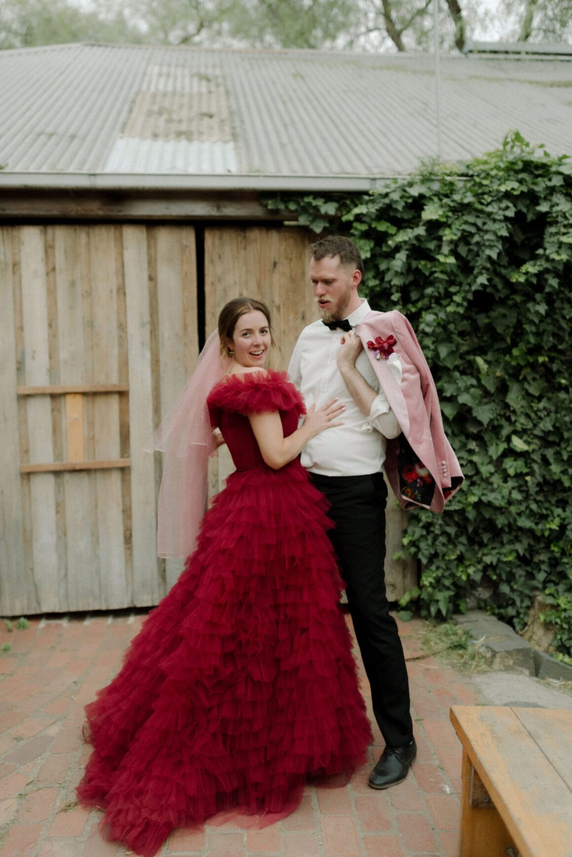 THE GOWNS “I wouldn’t usually class myself as an extra person, but I definitely went big on my wedding day with three dresses. The ceremony dress was a surprise find – I was just trying on dresses for fun when I slipped into an explosion of maroon tulle. I hadn’t planned on wearing colour, but the moment I saw myself in it, my whole face lit up. It was less rational decision and more pure, unfiltered joy. But I also had this inkling that my mum would love the challenge of making a wedding dress for her only daughter (her mum had made hers too). So, despite living in New Zealand, she made three separate trips to Melbourne, adapted some patterns she already had, and we hit up a bunch of fabric shops. With only a few meltdowns along the way, in literal weeks she somehow whipped up the most stunning white ‘first look’ dress, hunched over a makeshift trestle table using a borrowed sewing machine in the corner of our kitchen (I made a lot of witty references to Rumpelstiltskin). It felt so special wearing something she’d made, and it photographed beautifully. Then, because two dresses weren’t enough, I had a third.”