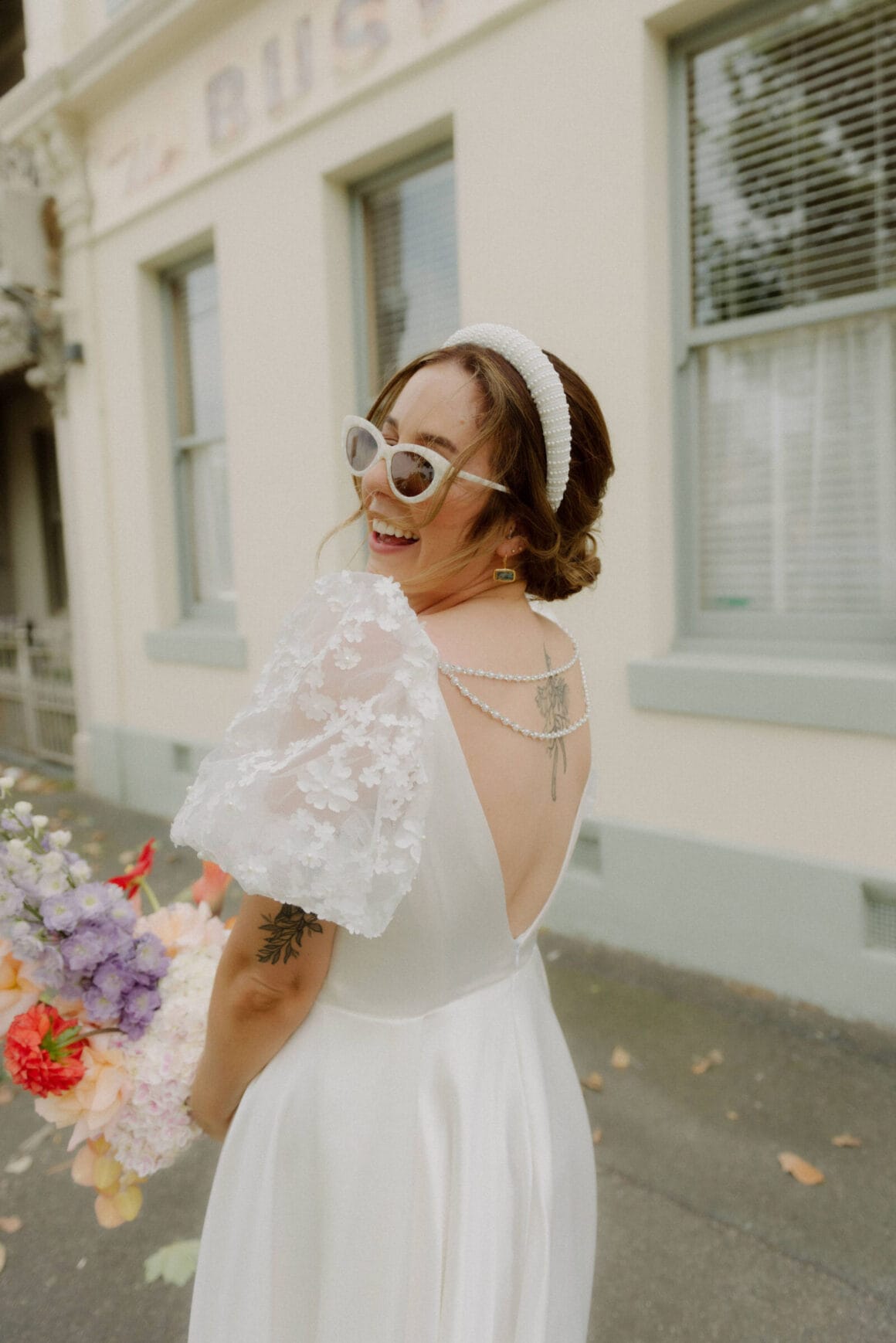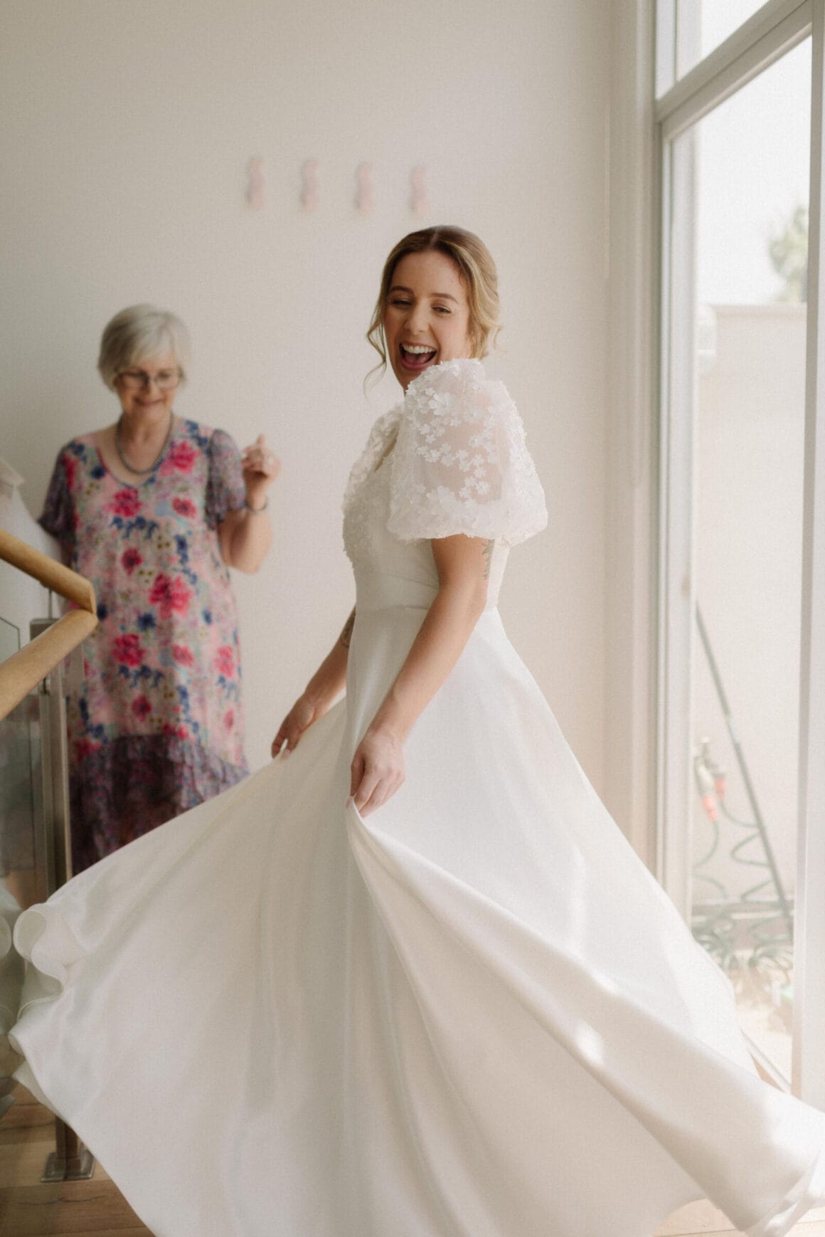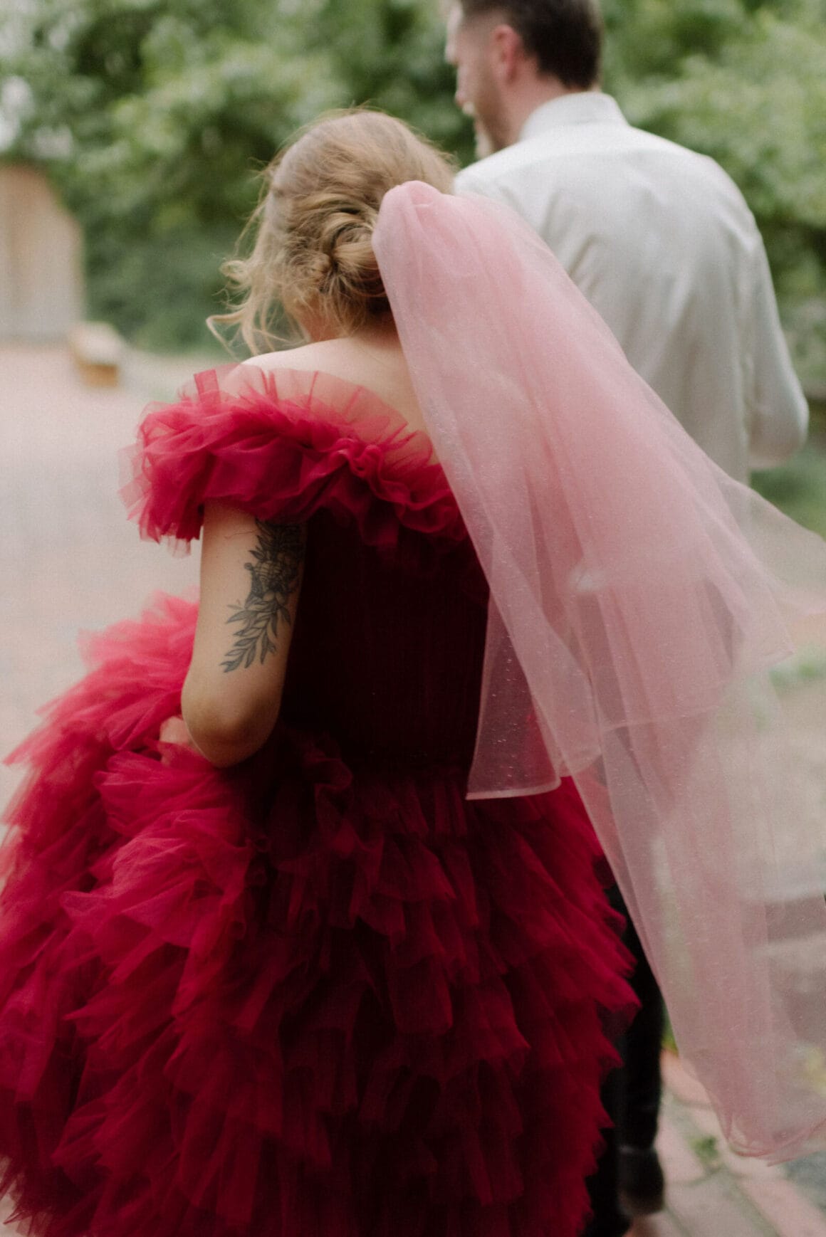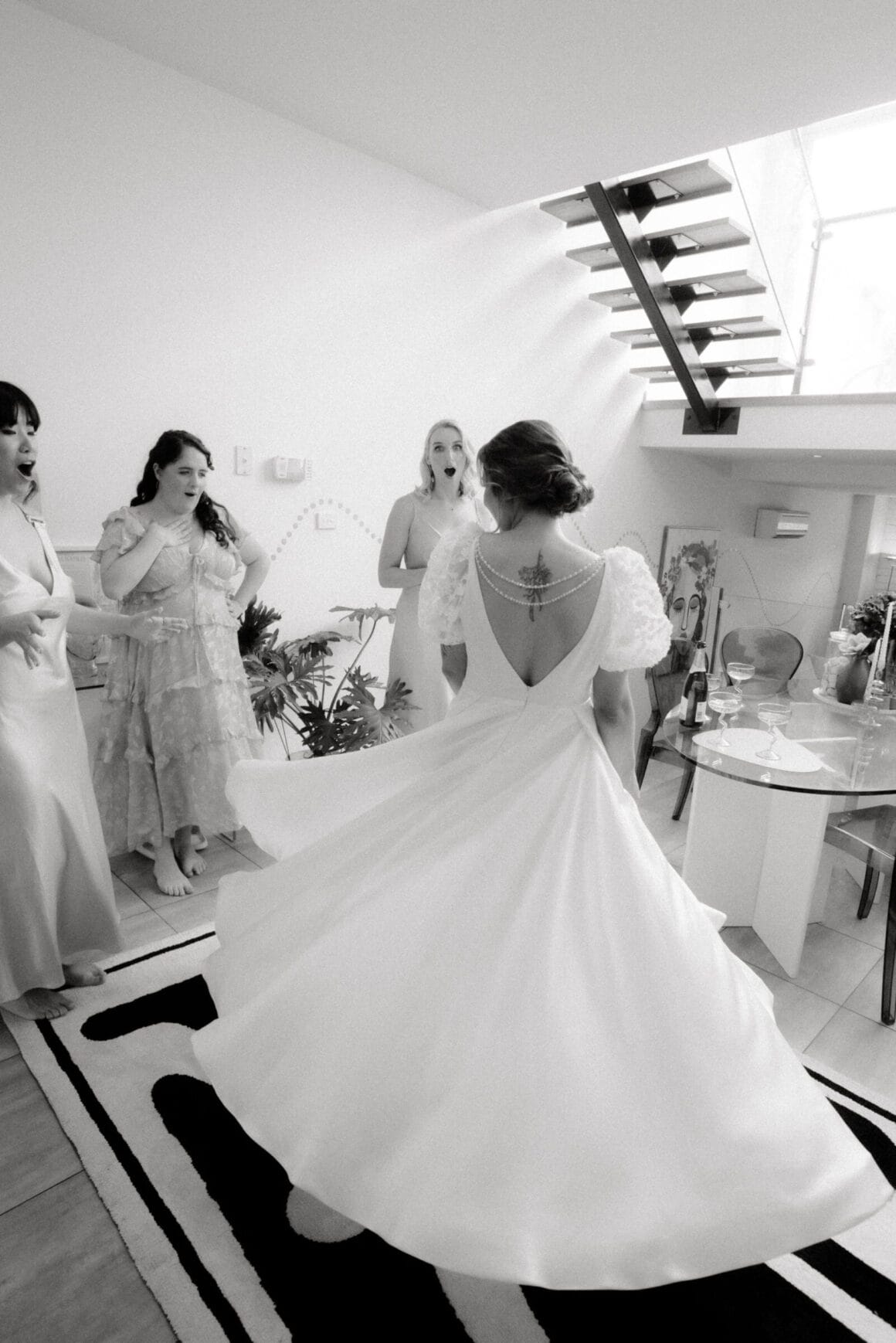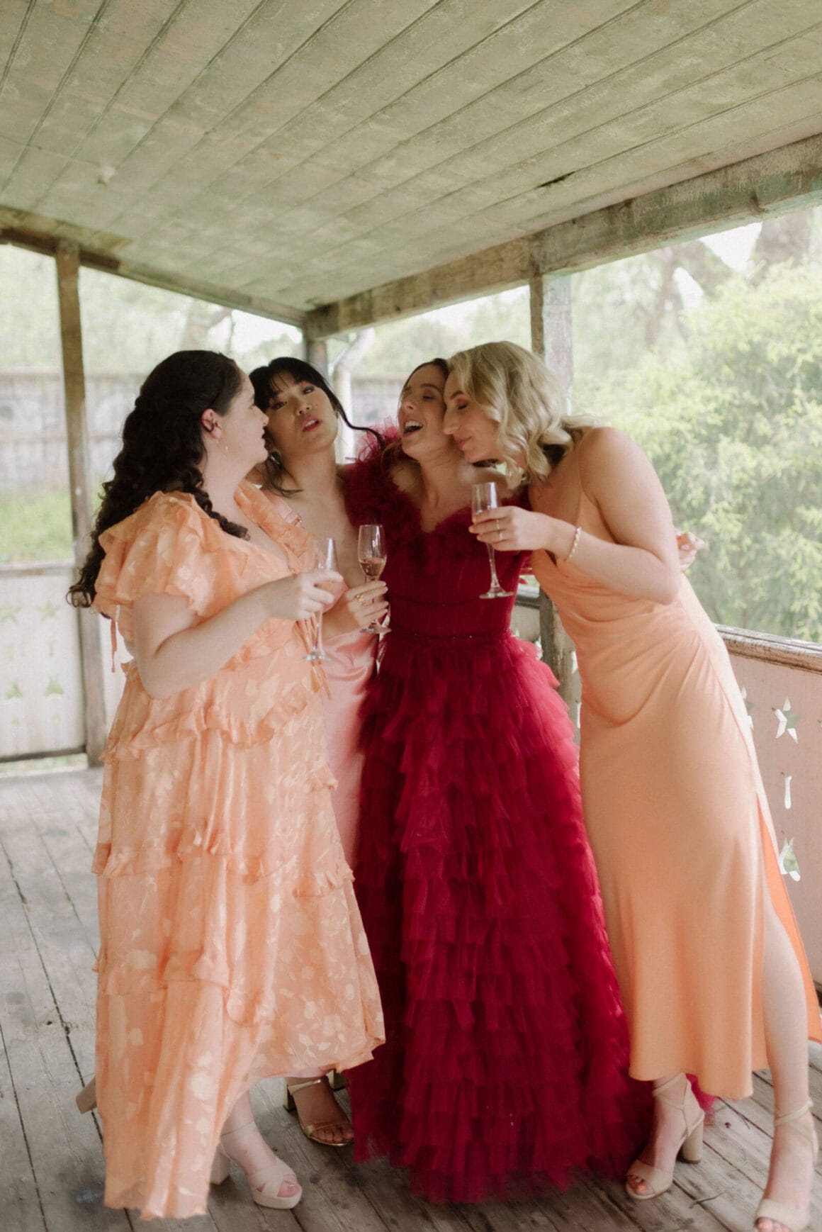 THE GOWNS “I wouldn’t usually class myself as an extra person, but I definitely went big on my wedding day with three dresses. The ceremony dress was a surprise find – I was just trying on dresses for fun when I slipped into an explosion of maroon tulle. I hadn’t planned on wearing colour, but the moment I saw myself in it, my whole face lit up. It was less rational decision and more pure, unfiltered joy. But I also had this inkling that my mum would love the challenge of making a wedding dress for her only daughter (her mum had made hers too). So, despite living in New Zealand, she made three separate trips to Melbourne, adapted some patterns she already had, and we hit up a bunch of fabric shops. With only a few meltdowns along the way, in literal weeks she somehow whipped up the most stunning white ‘first look’ dress, hunched over a makeshift trestle table using a borrowed sewing machine in the corner of our kitchen (I made a lot of witty references to Rumpelstiltskin). It felt so special wearing something she’d made, and it photographed beautifully. Then, because two dresses weren’t enough, I had a third.”