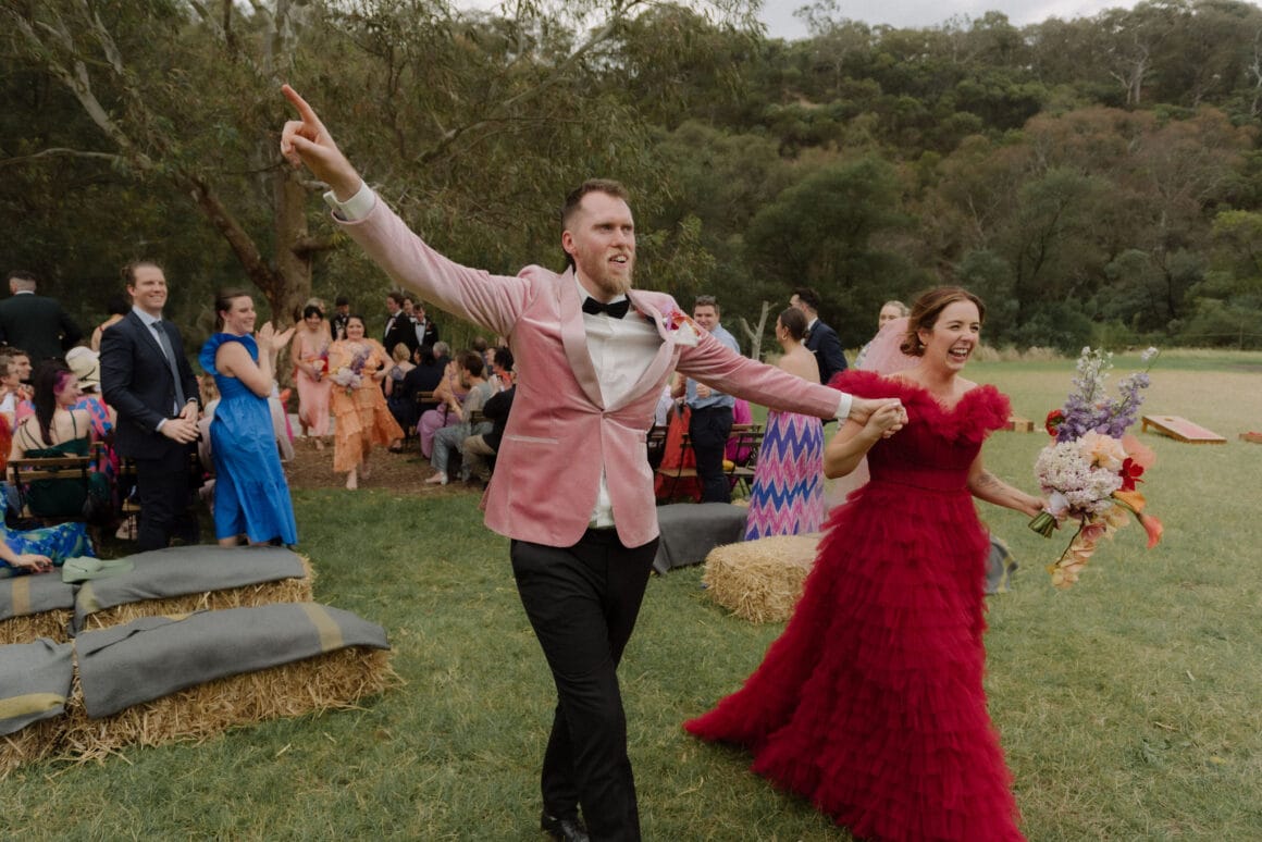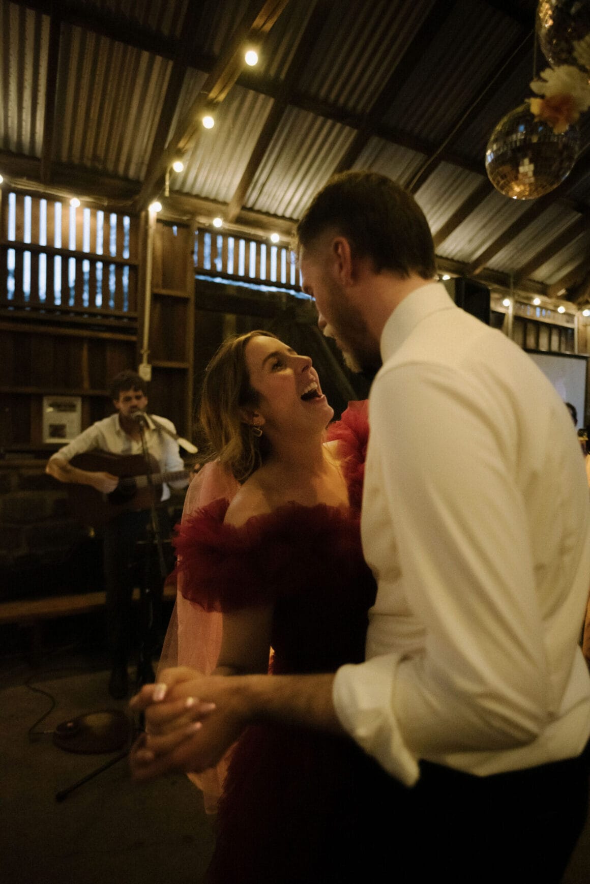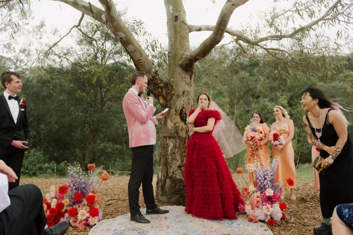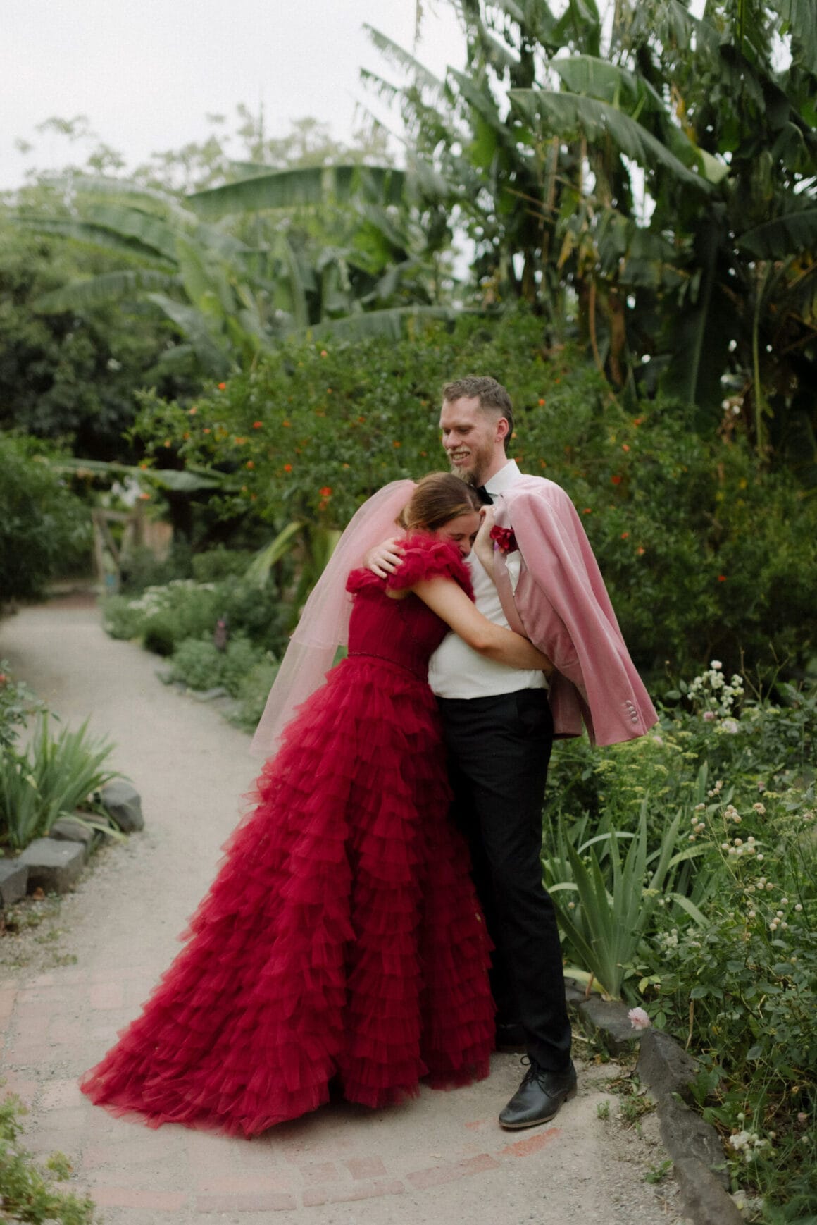 Three amazing gowns, including a fab red bridal dress, and the wisest words we ever did hear when it comes to planning: “The best advice we received was from my (Sarah’s) older brother who said: ‘if it’s not a fuck yes, it’s a no.’ We applied this to everything, from vendor selection to font choice, and it saved us from too much overthinking.”