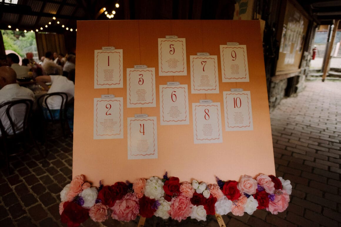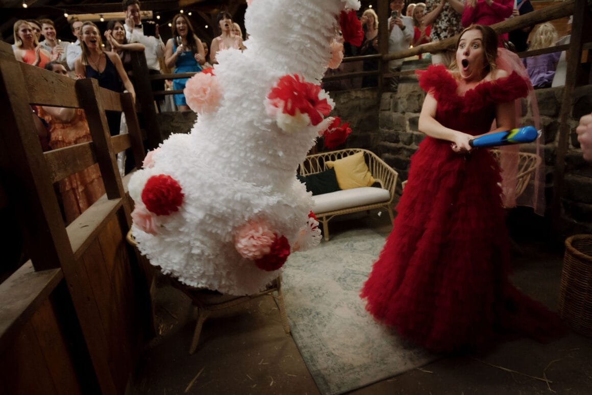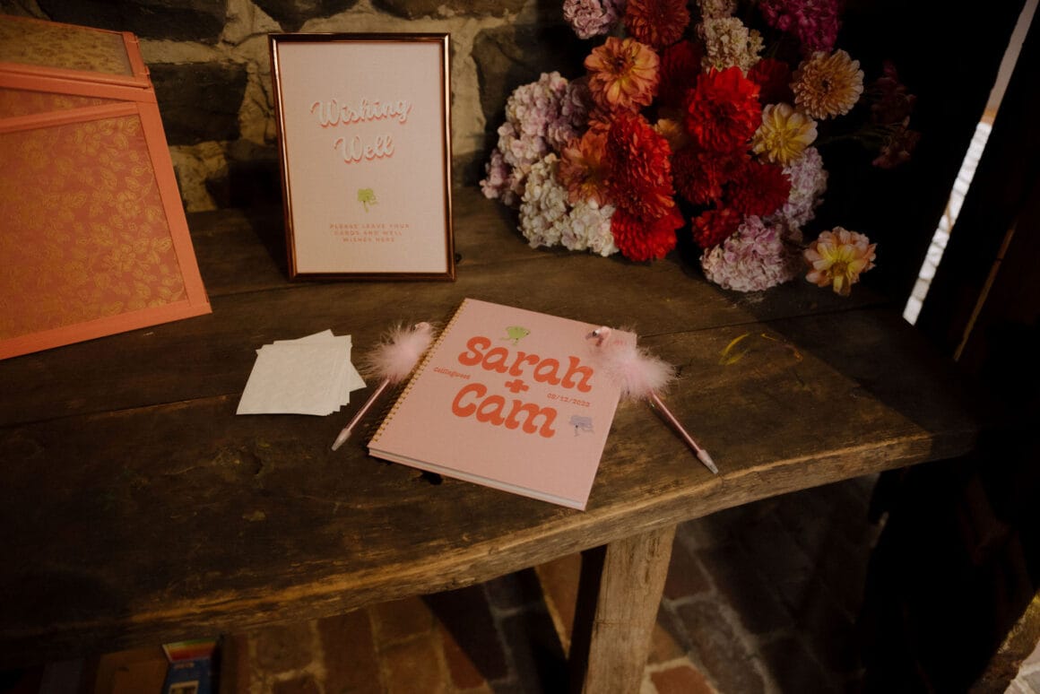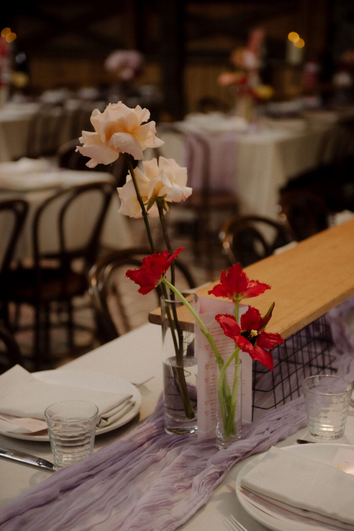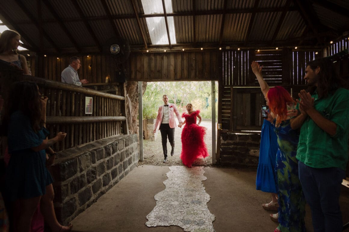 Three amazing gowns, including a fab red bridal dress, and the wisest words we ever did hear when it comes to planning: “The best advice we received was from my (Sarah’s) older brother who said: ‘if it’s not a fuck yes, it’s a no.’ We applied this to everything, from vendor selection to font choice, and it saved us from too much overthinking.”