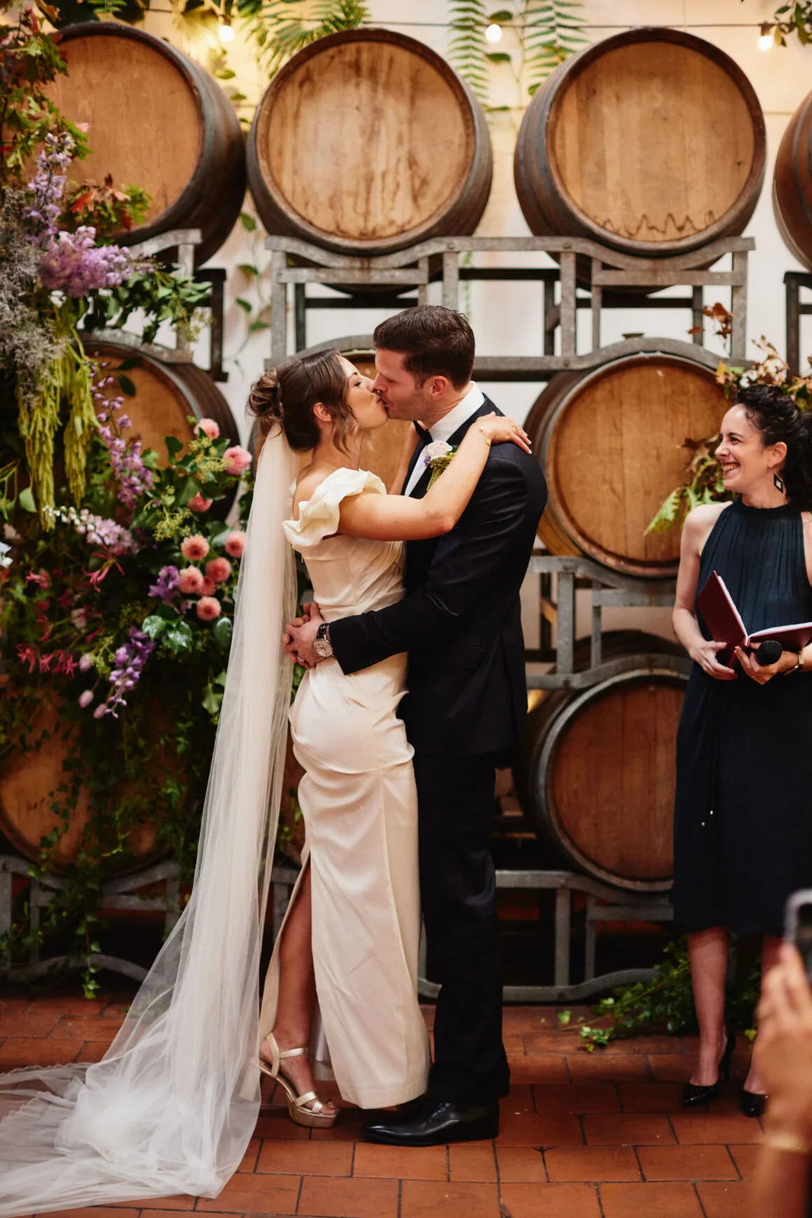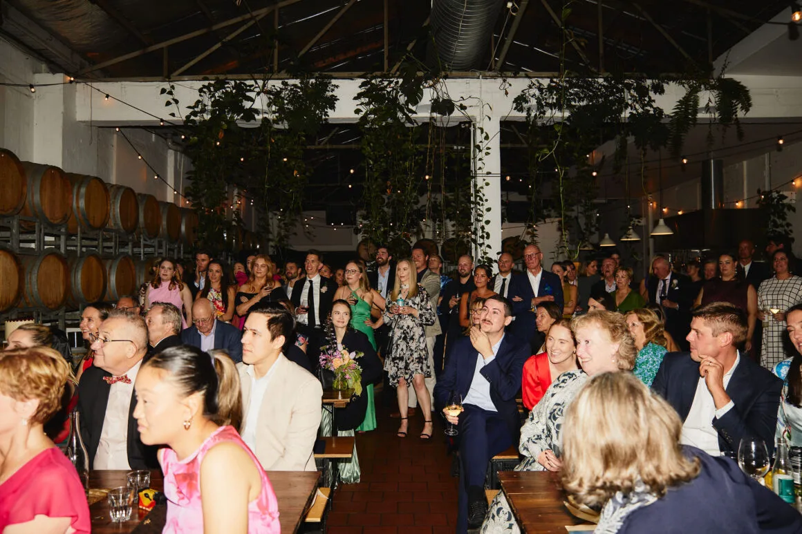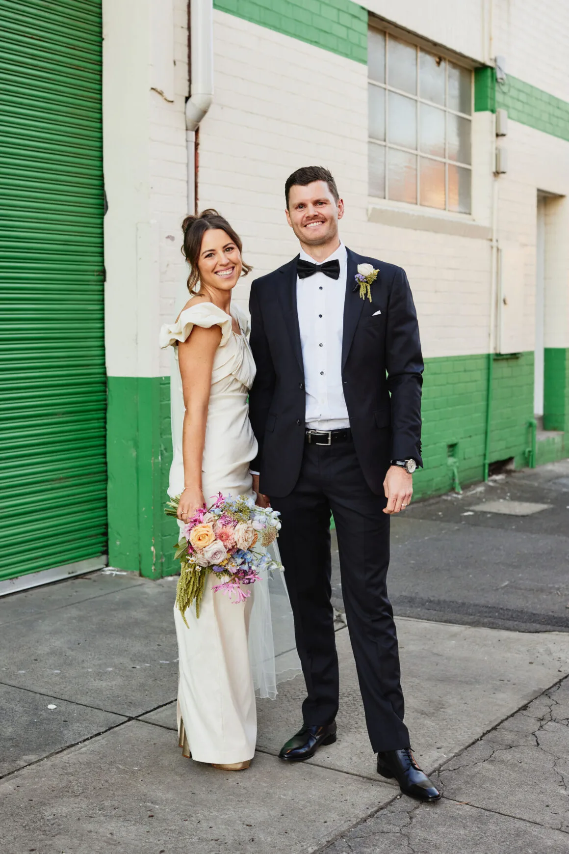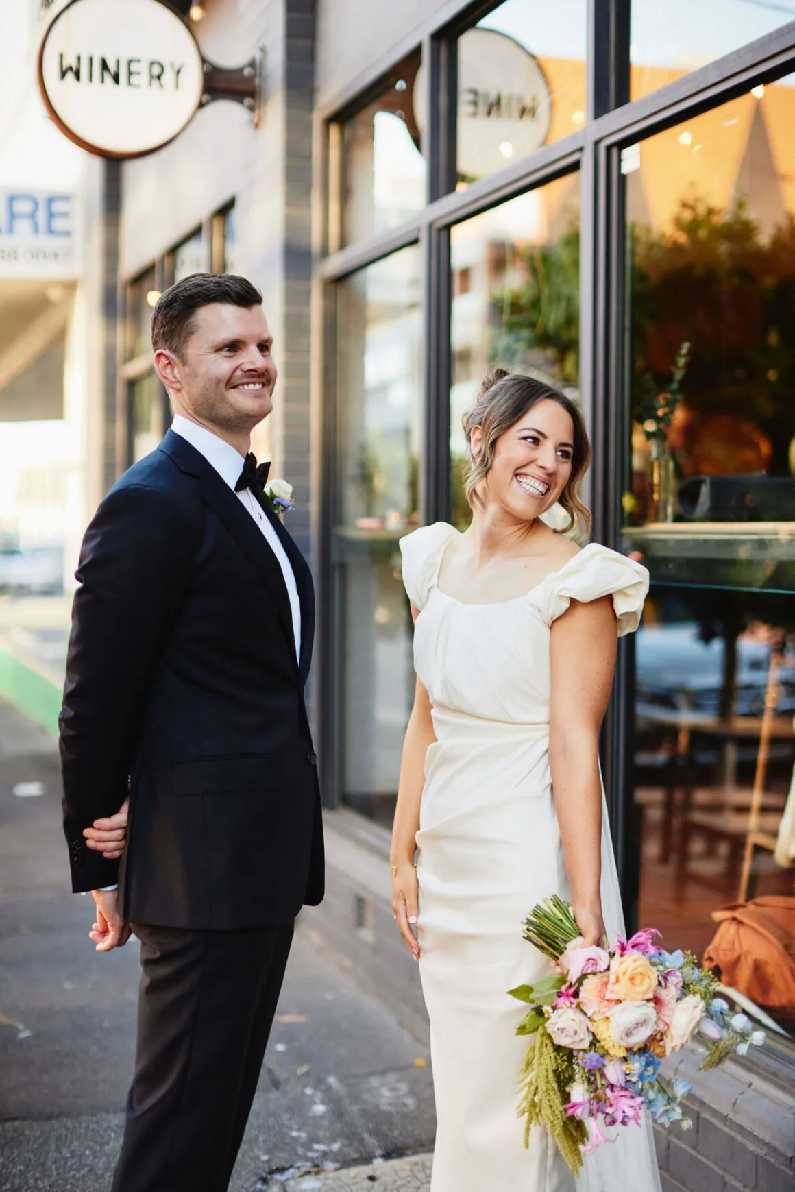 Sarah, a food technologist and Tim, a chef, cooked up a real treat with their simple and relaxed Melbourne wedding. Seasoned foodie pros, the pair had catered many a matrimony through Tim’s company, Merrymaker. In fact, Tim had initially planned on handling their wedding eats himself! The search for a suitable venue brought Sarah and Tim to uber-cool urban winery, Noisy Ritual, but upon learning that the Brunswick locale’s BYO food policy was no longer in place, they were secretly kinda relieved to have the task taken off the groom’s plate! Clearly, it was fate and “an easy yes,” as the bride recalls.