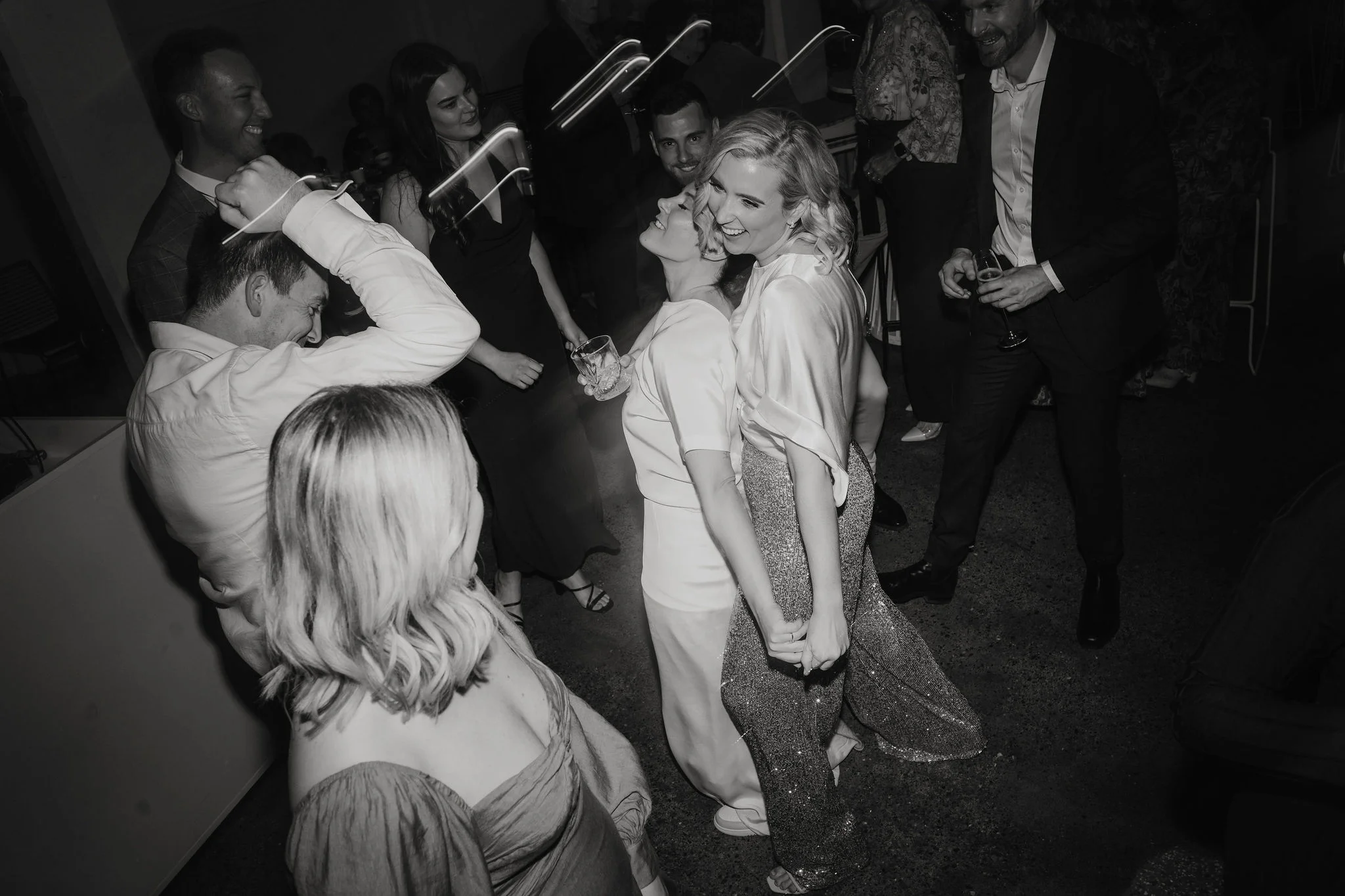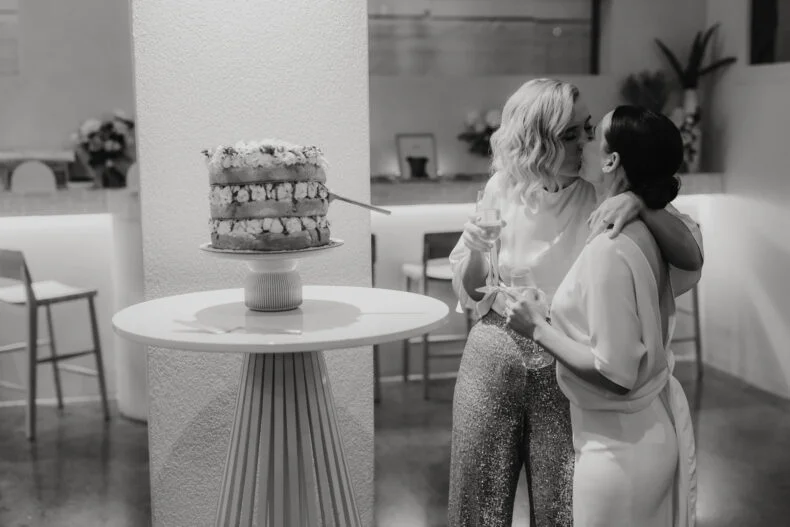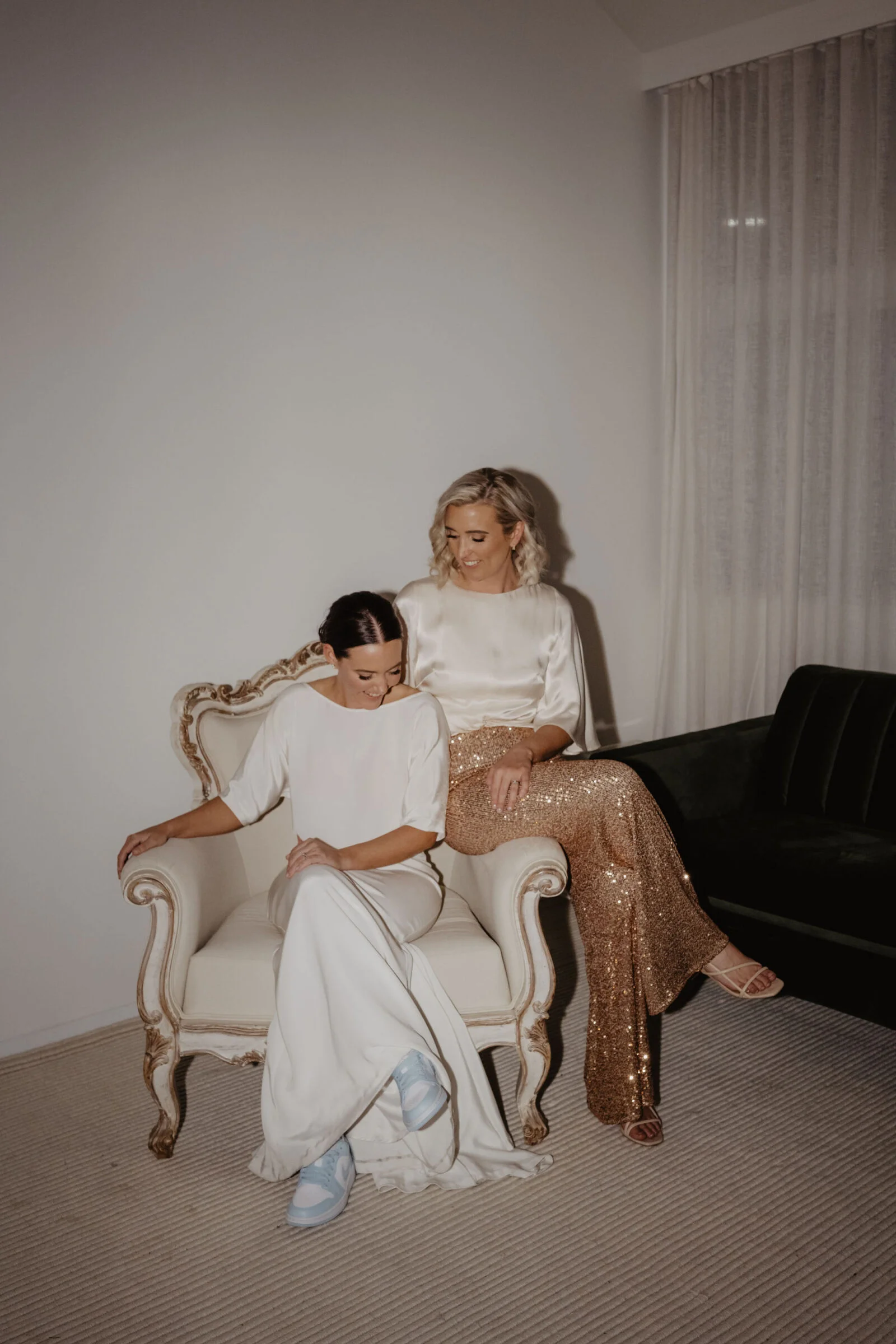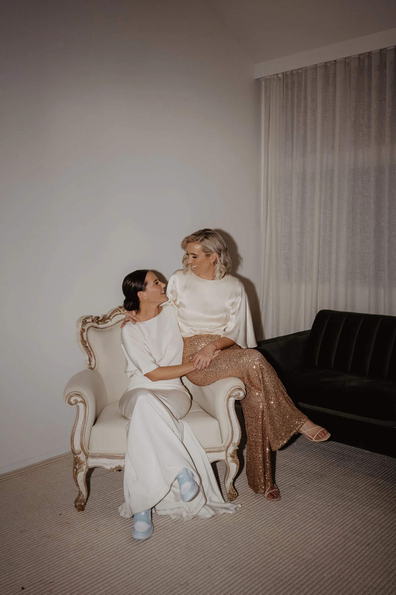THE OUTFITS Shan: “We decided to go to each other’s bridal appointments because the only opinion that mattered to both of us was the other person’s. We also found this very useful to ensure we didn’t clash and complimented each other’s styles. Funny story… I purchased a dress not long after we were engaged. However, when the dress arrived, about four months before the wedding, the lace was damaged and could not be repaired. It was very stressful, but the lovely team at LUV Bridal came to my rescue. I knew that I didn’t want to wear a dress all night and wanted an amazing reception outfit to change into. Yes, the dress was beautiful, but I wanted to dance and move with ease. I found some FABULOUS gold sequin pants that were absolutely perfect to dance and party in. Cass: “I did quite a lot of research in the lead-up and knew exactly what I wanted. Shan forced me to try on A LOT of other dresses just to make sure I was sure. But when I tried on the Lola Varma Delphine skirt and Val top, I knew this was the one for me. The Jordans I wore at the reception were a fun touch. I wanted to be comfortable and be able to dance the night away.”