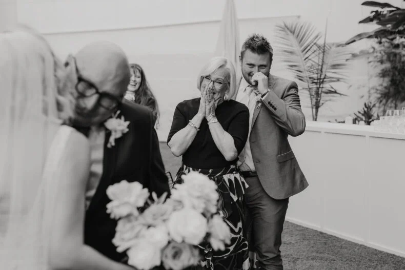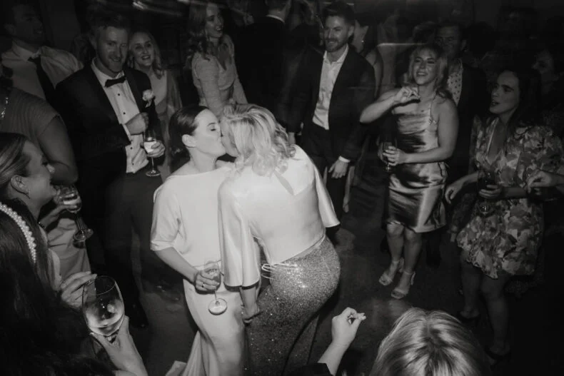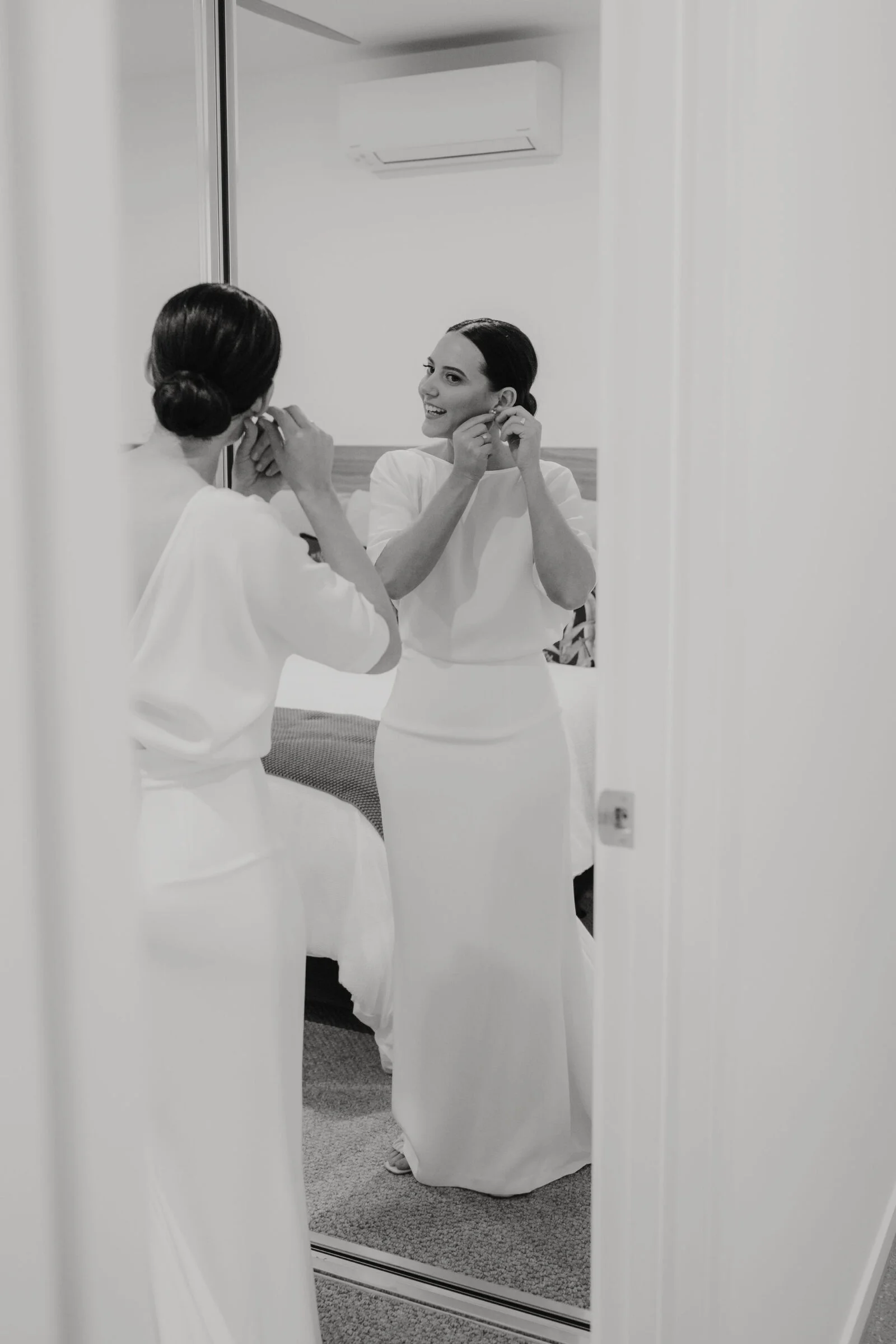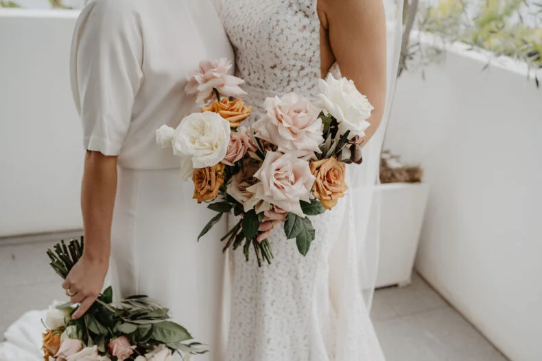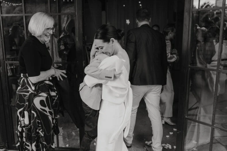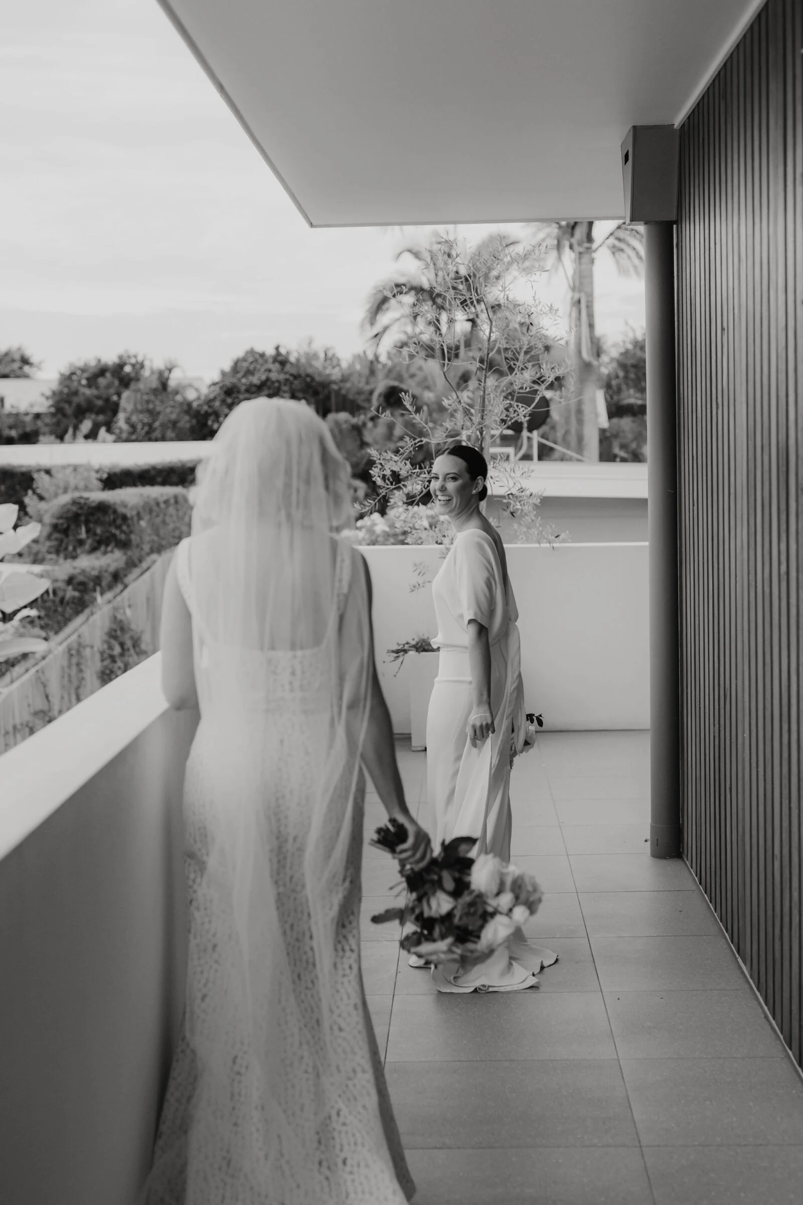 THE OUTFITS Shan: “We decided to go to each other’s bridal appointments because the only opinion that mattered to both of us was the other person’s. We also found this very useful to ensure we didn’t clash and complimented each other’s styles. Funny story… I purchased a dress not long after we were engaged. However, when the dress arrived, about four months before the wedding, the lace was damaged and could not be repaired. It was very stressful, but the lovely team at LUV Bridal came to my rescue. I knew that I didn’t want to wear a dress all night and wanted an amazing reception outfit to change into. Yes, the dress was beautiful, but I wanted to dance and move with ease. I found some FABULOUS gold sequin pants that were absolutely perfect to dance and party in. Cass: “I did quite a lot of research in the lead-up and knew exactly what I wanted. Shan forced me to try on A LOT of other dresses just to make sure I was sure. But when I tried on the Lola Varma Delphine skirt and Val top, I knew this was the one for me. The Jordans I wore at the reception were a fun touch. I wanted to be comfortable and be able to dance the night away.”