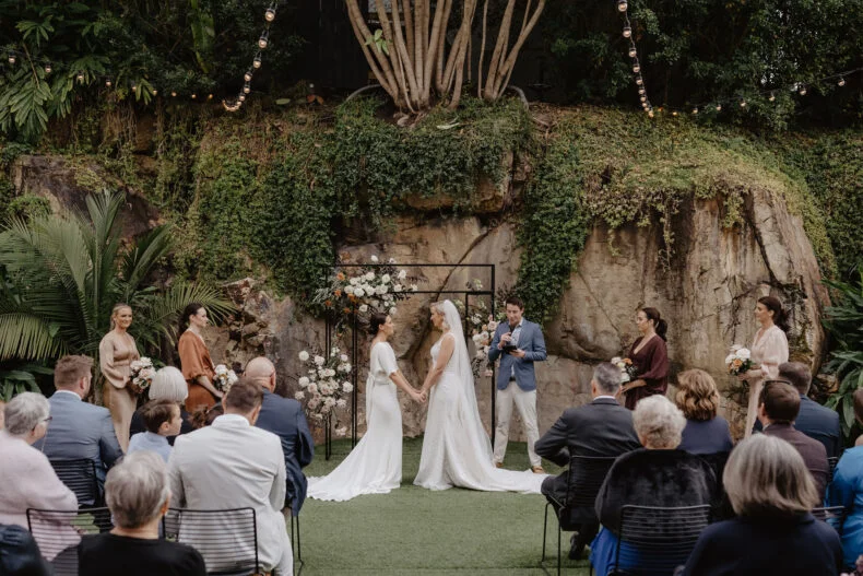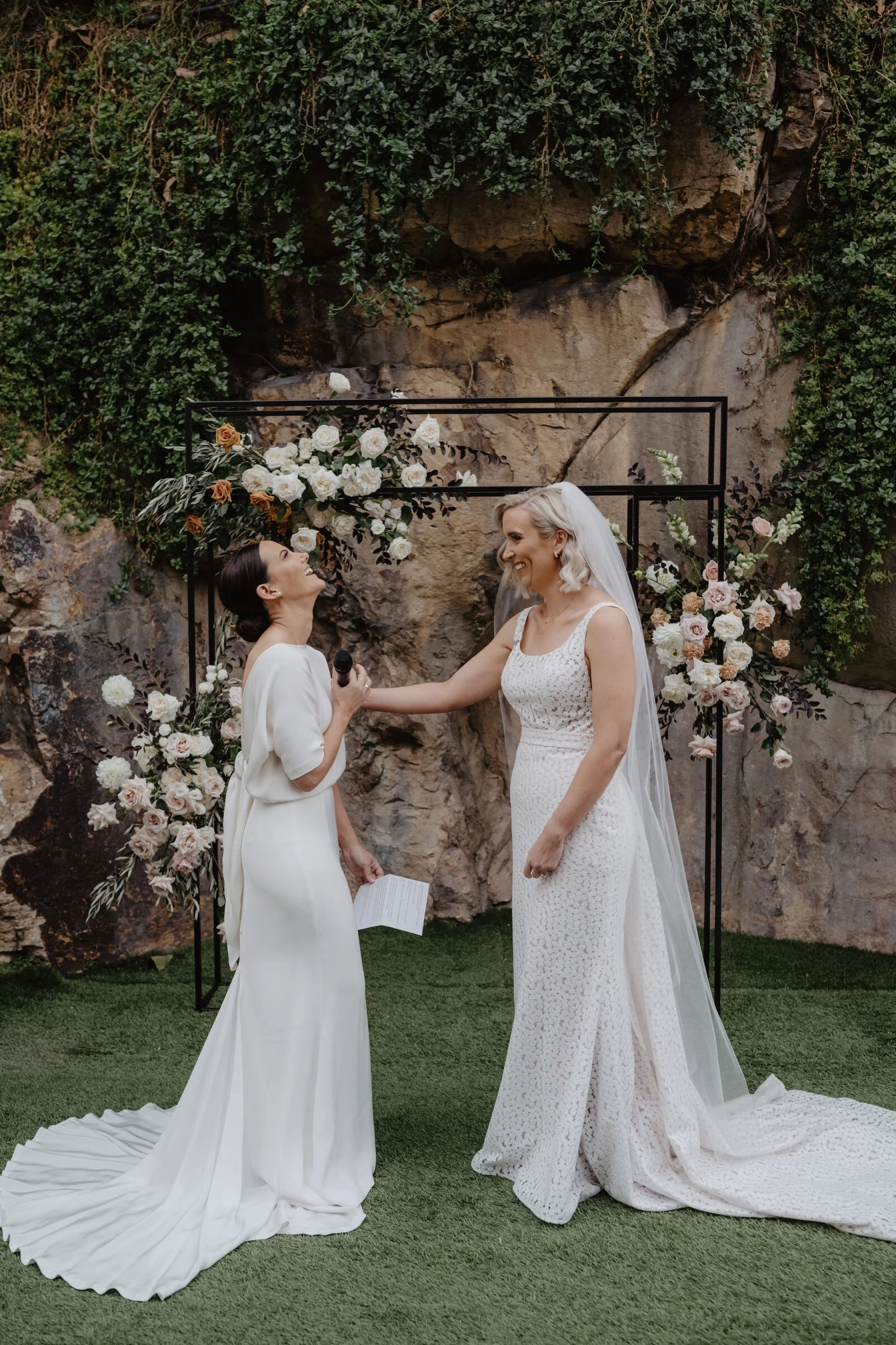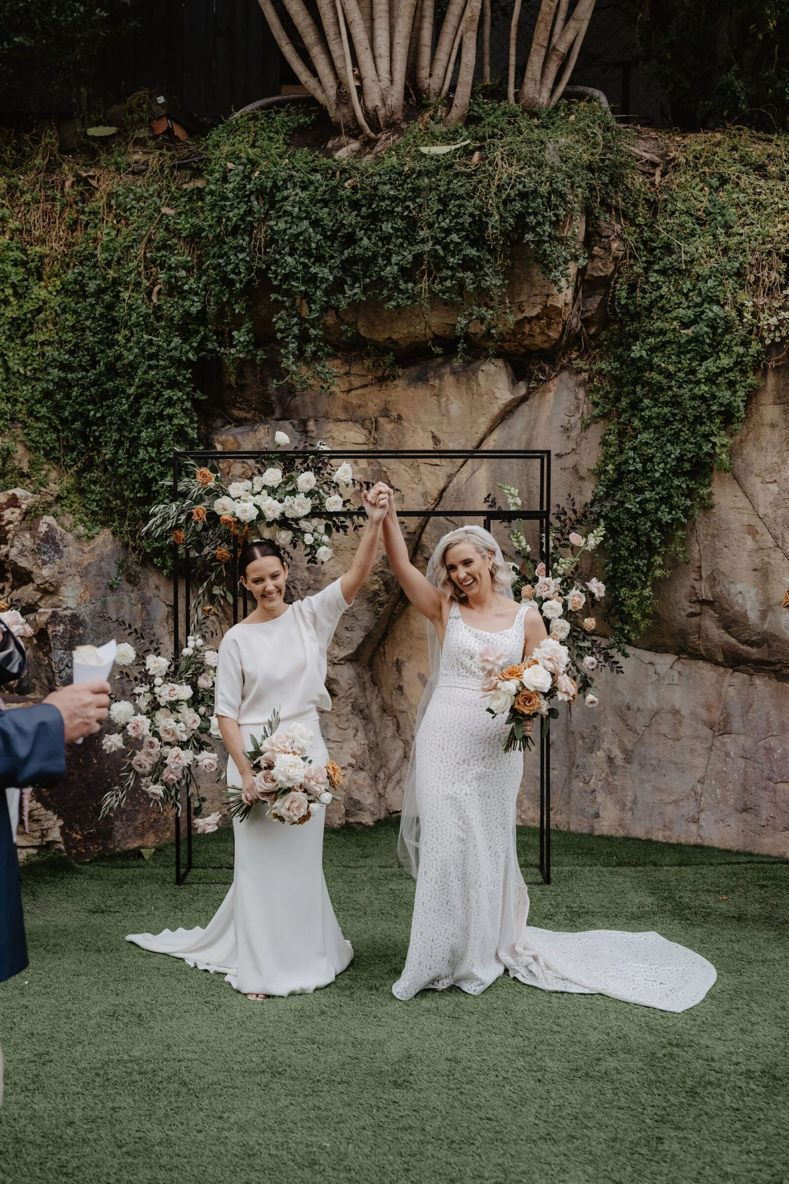Shan and Cass crafted the perfect wedding that was them to a tee. From getting ready together, to their aisle entrance and outfit changes, this day was absolutely and totally theirs. “We wanted to include our fathers in walking us down the aisle, but rather than them ‘giving us away’ (as we are strong independent women), they walked us halfway down, before Cass and I walked the rest of the way together,” the newlyweds shared with us. Yas gals! Here. For. It. Locking in Taylor Kezia for snaps, Gwen Flower Co for blooms, Bared Footwear for heels, LUV Bridal for Shan’s dress and Cut a Rug to supply the tunes, were all very clever moves, too. Scroll down for this pair’s incred day…