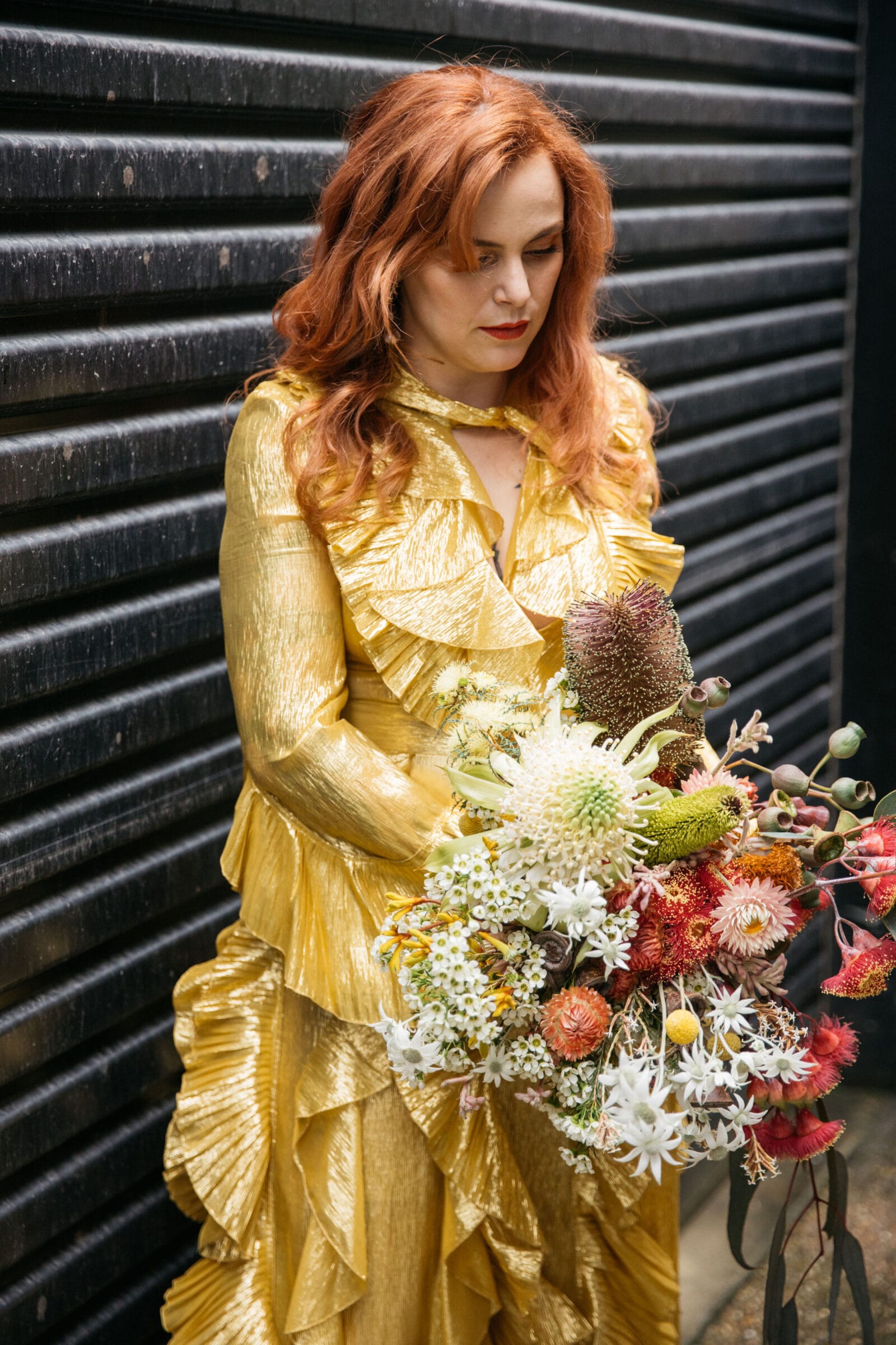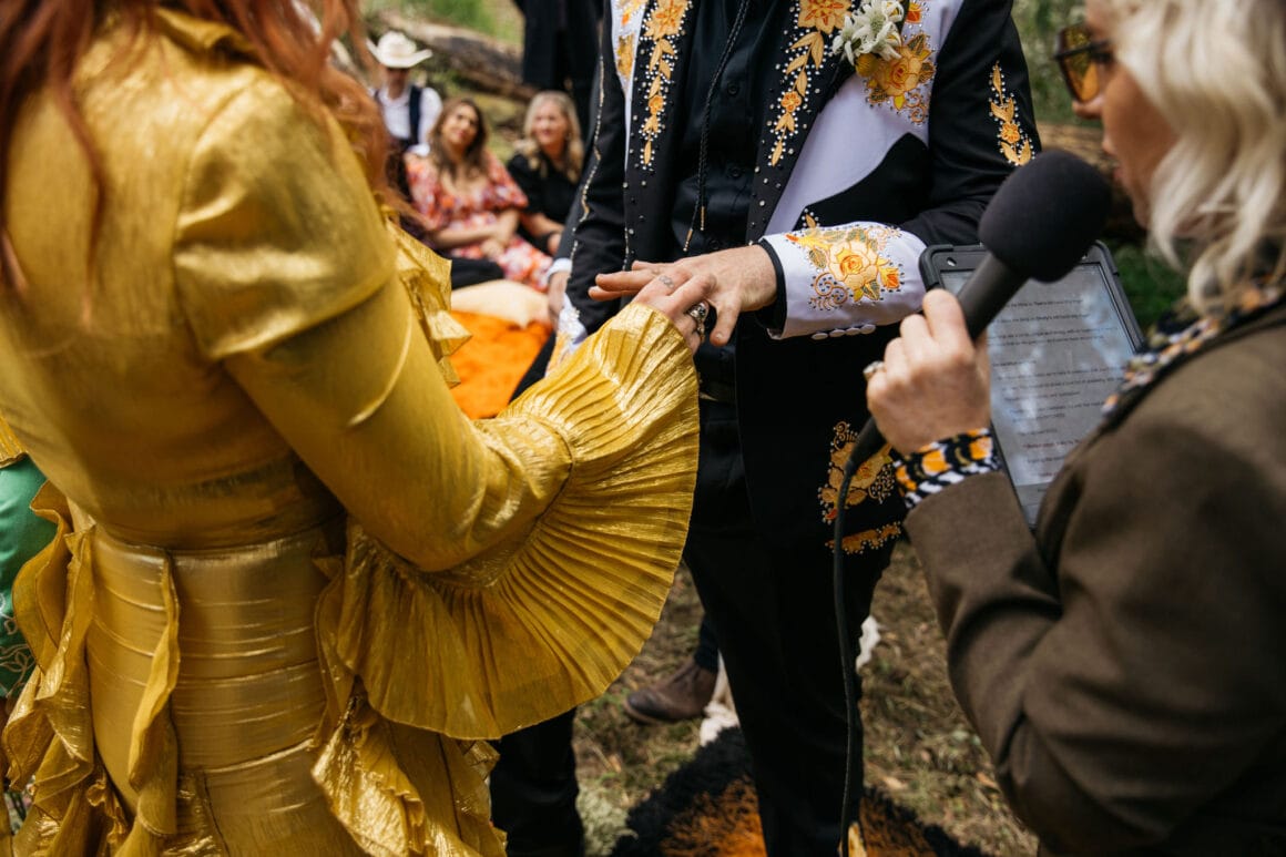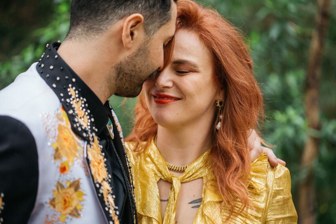 Safe to say Shelly and Tom’s vibrant backyard nuptials knocked us right off our chairs. Before you say anything, we know EXACTLY what you’re about to ask, and the answer is vintage Gucci. Yep, glowy, golden, fit-for-a-goddess vintage Gucci! That’s what Shelly was rocking when she and Tom (in one-of-a-kind Reigner) tied the knot. What a good-lookin’ pair.