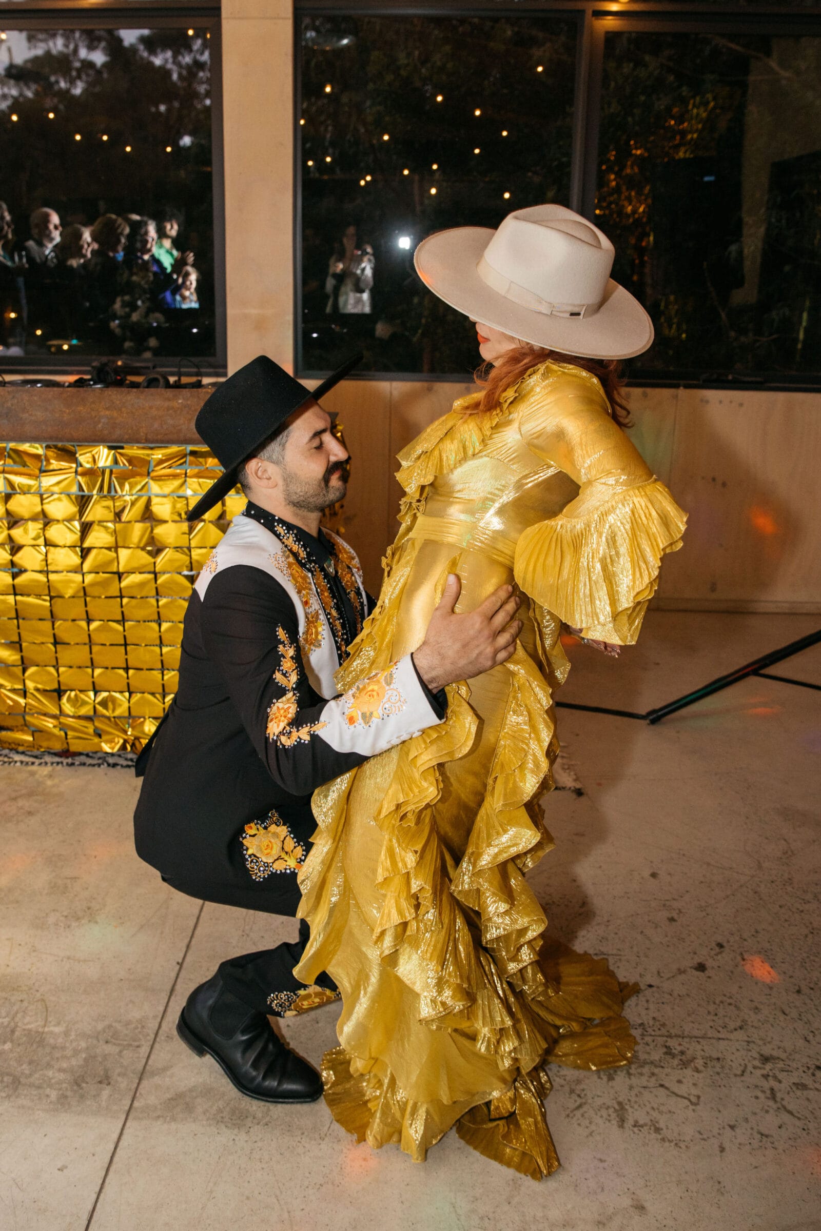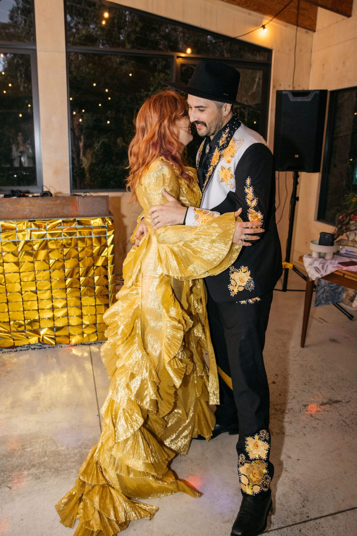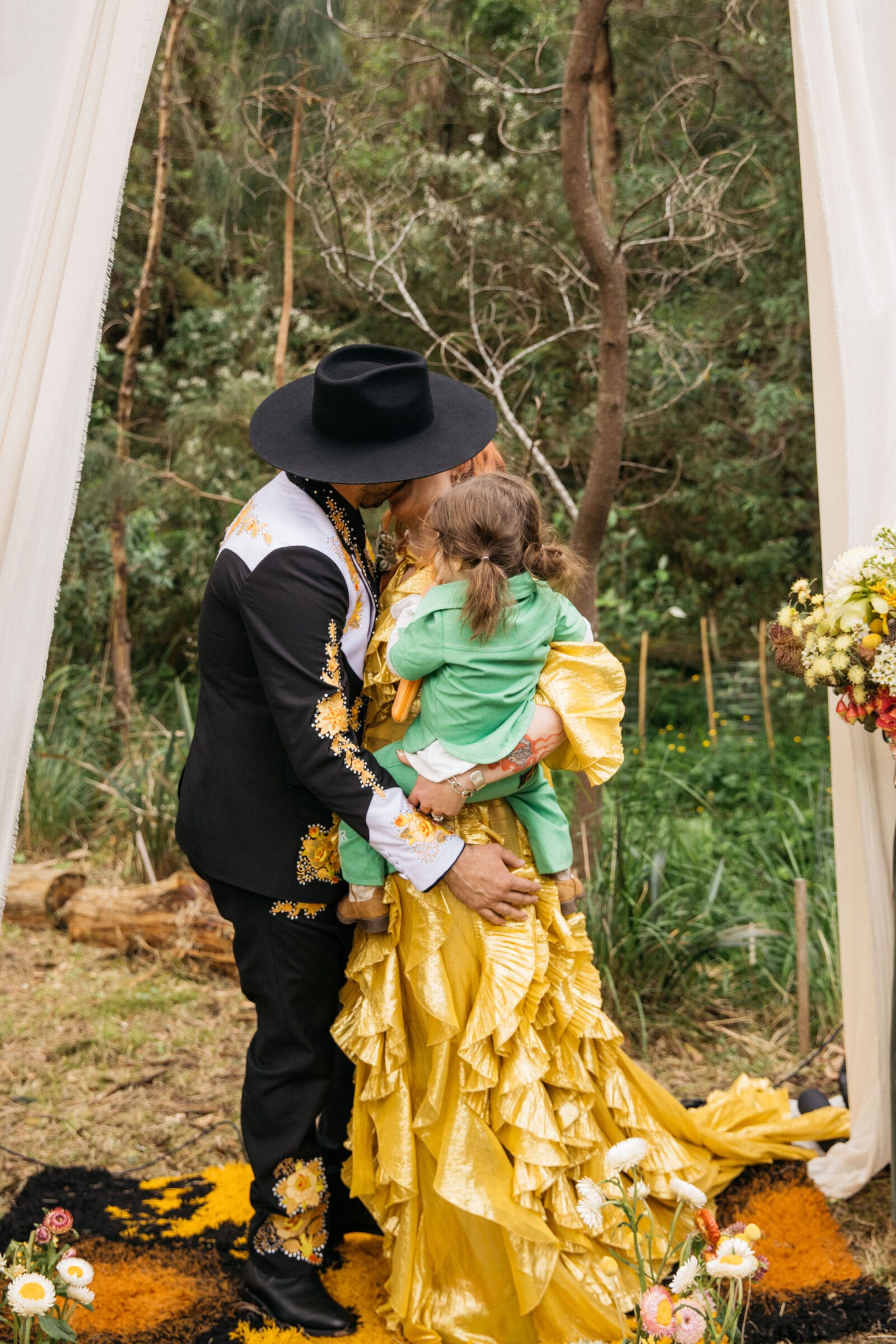 “There was no overarching theme. We just wanted it to be vibrant, fun and ‘us’. Both of us love to create, and we pulled things from our own collection and collaborated on the decorations. We were both really drawn to gold and, amazingly, had two green suits for the kids that worked really well with our outfits.”