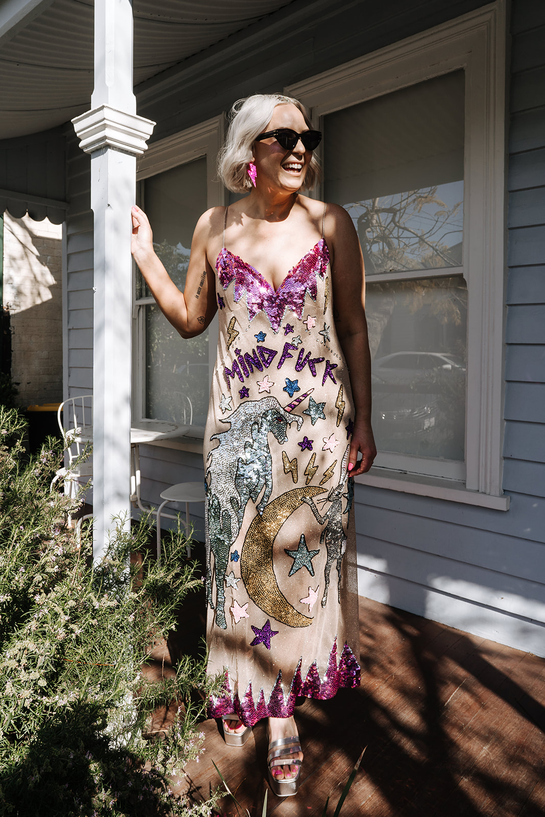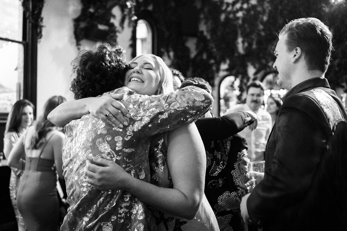 “ I knew I wanted the vibe to be more of a party than a formal occasion. I wanted to wear something sequin-y/sparkly for my wedding dress, so I asked guests to wear something sparkly or ‘your best party fit’ to match!”
