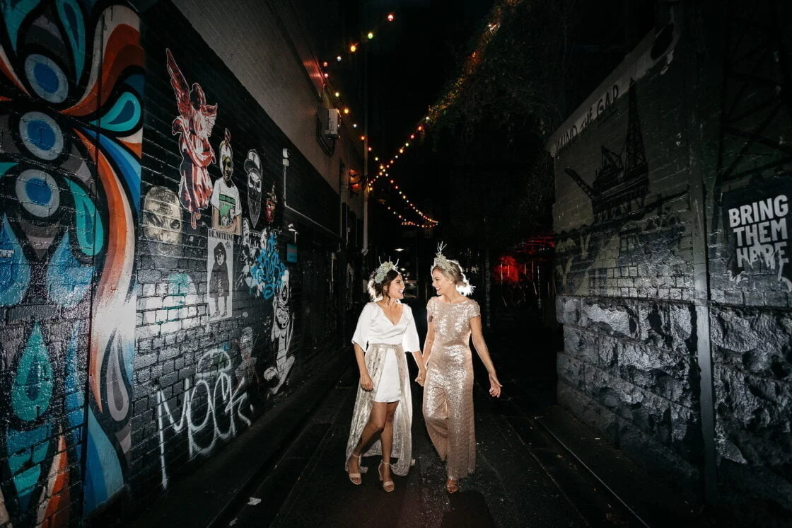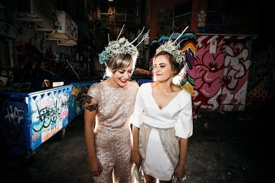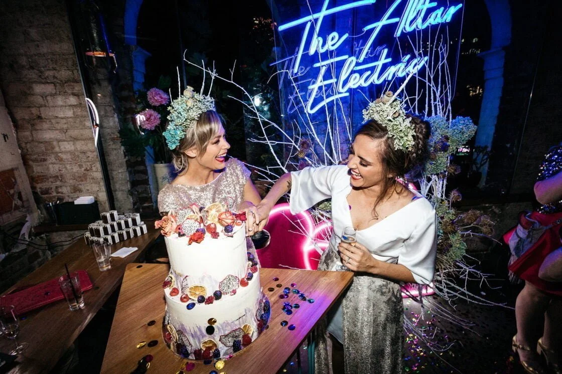 It’s not often a whole bunch of the industry’s finest come together to create an epic wedding, free of charge, just as it’s also not often a couple argue over who’s going to propose, as Mahatia and Teegan joked! But this wedding is unique in other ways, too. “Dee from The Altar Electric and photographer, Christian Marc (of Be Here Be Now) planted a seed together at our first ‘wedding’ (a commitment ceremony in 2016), that they would marry us and capture it as soon as it became legal. Dee basically became our wedding planner extraordinaire. She found every single vendor for us and then some of the vendors approached Dee to offer their services and contribute out of the kindness of their hearts, to what we all referred to as our “Wedding Extravaganza”. It was a midnight party with an open invitation to the public. “This was a huge victory for our community and something that was long fought for, so to include the entire community in our celebration felt like the absolute right thing to do.”
