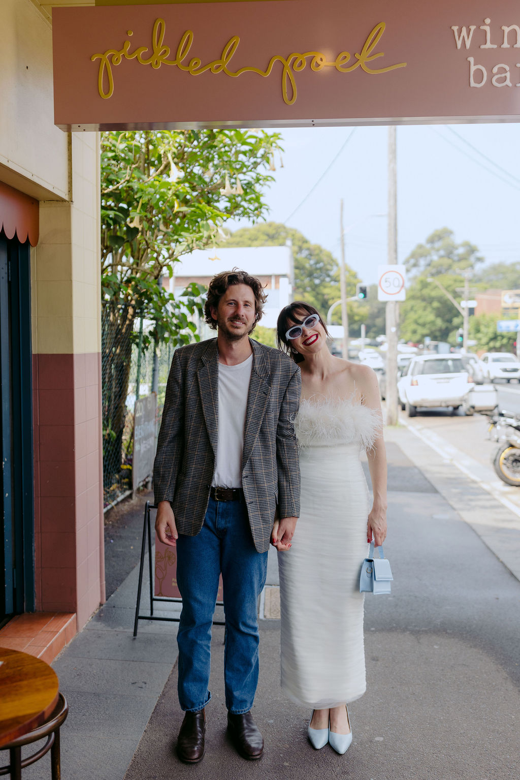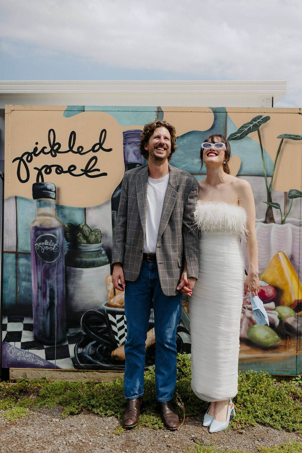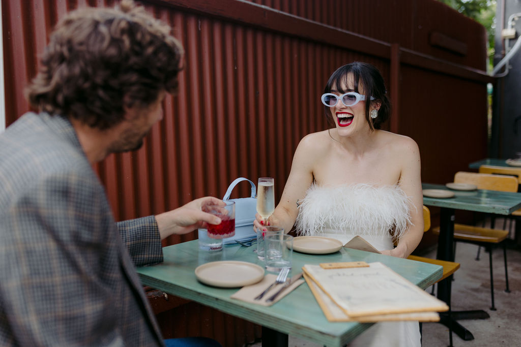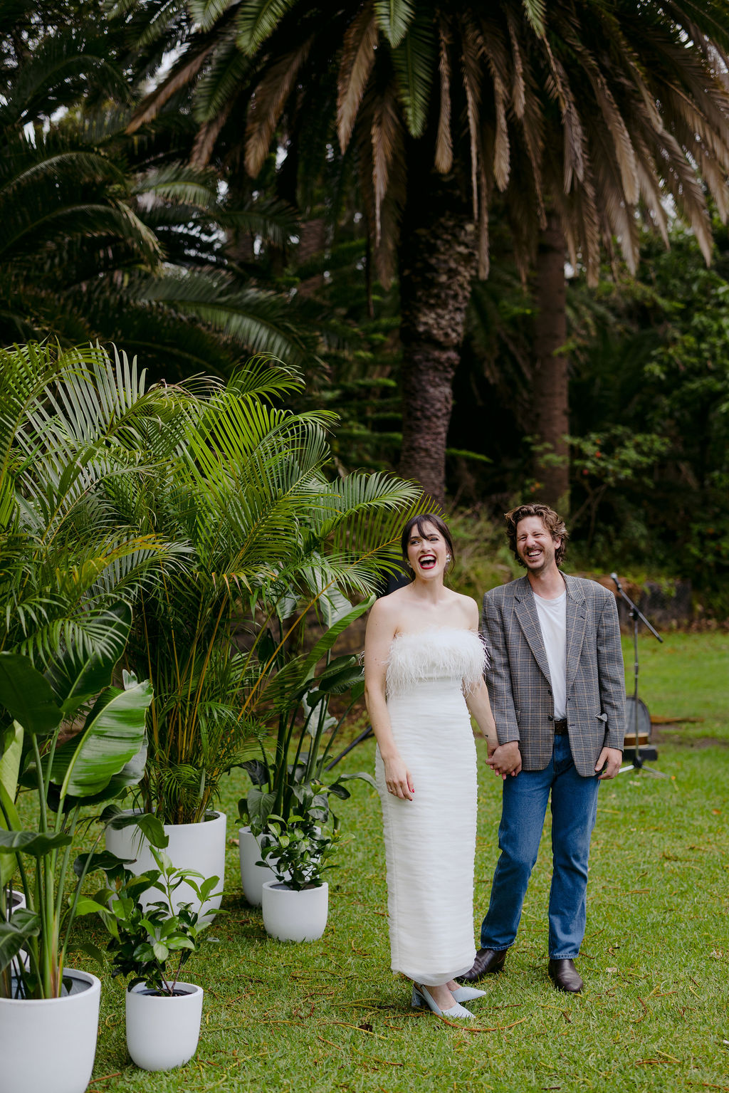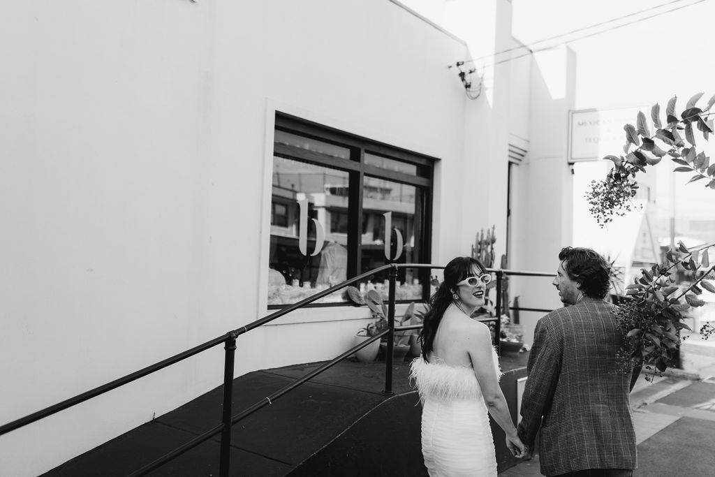 The bride (in a funky feathered Rebecca Vallance frock) and groom (wearing a partially Salvos-sourced ensemble) told us that they didn’t do a whole lot of vendor research, but are “lucky to be surrounded by a community of very talented friends, along with a few wonderful long-standing connections who just happened to be the perfect people for the job.”