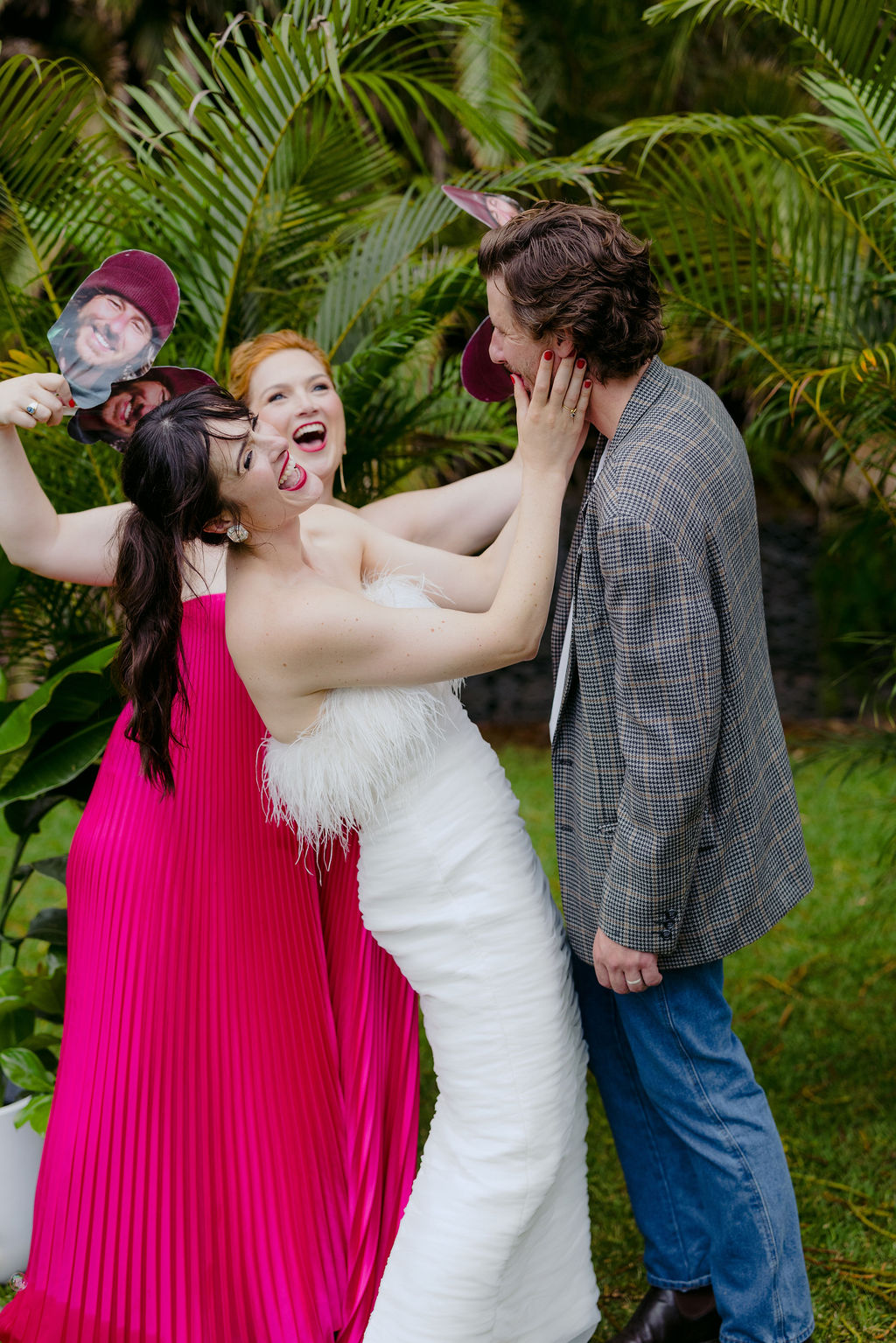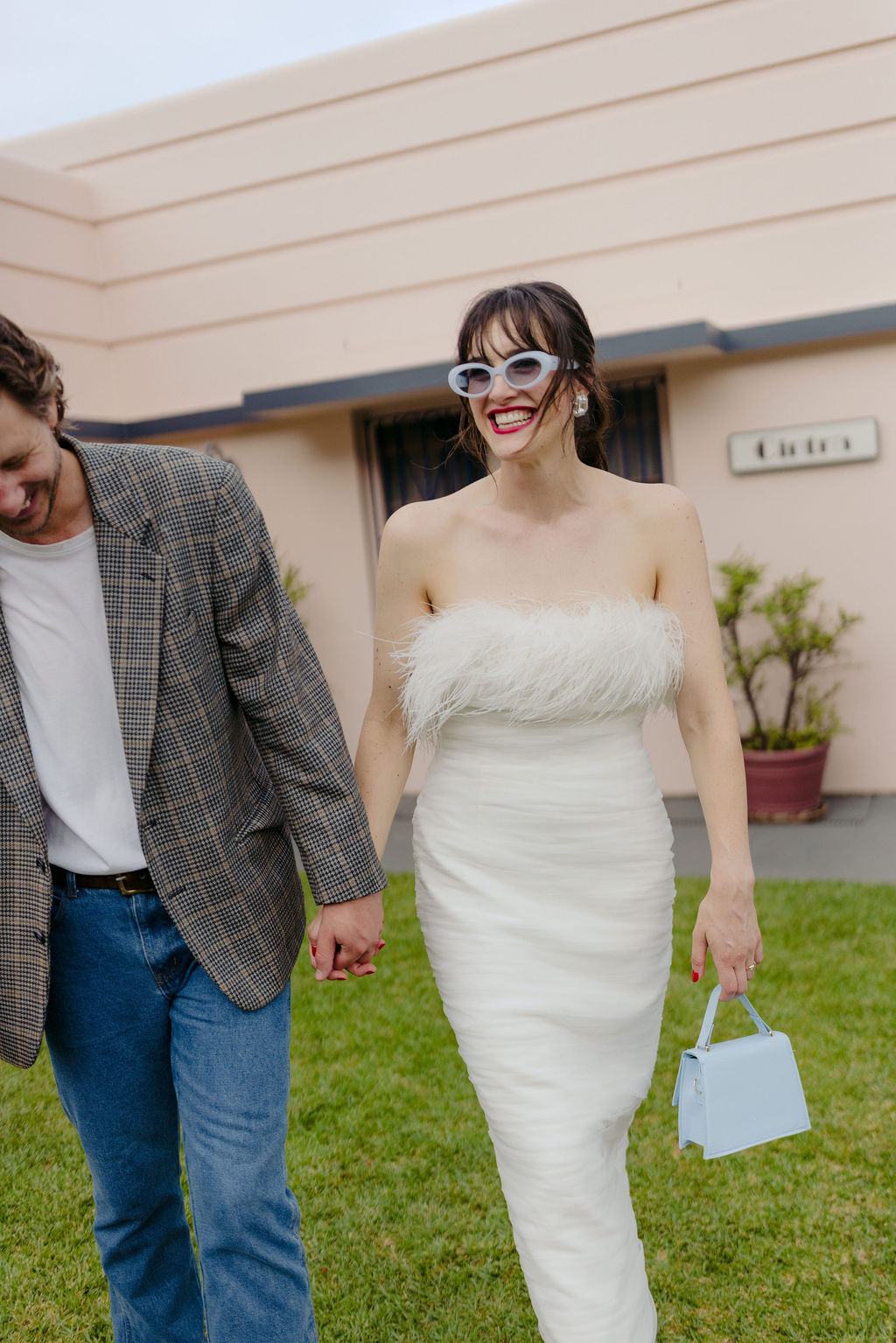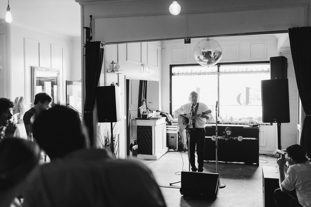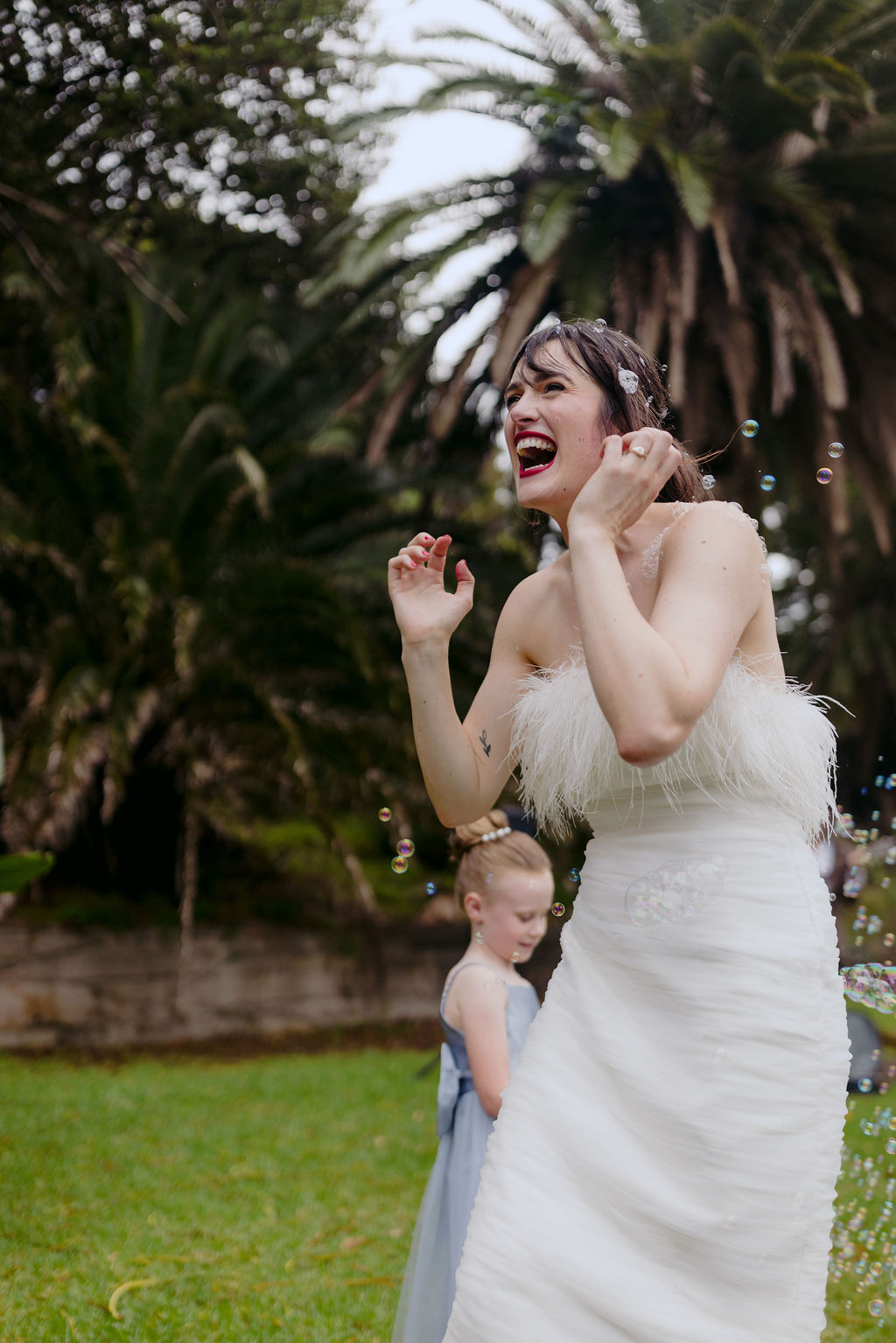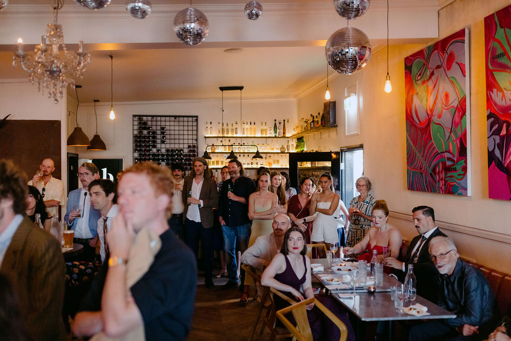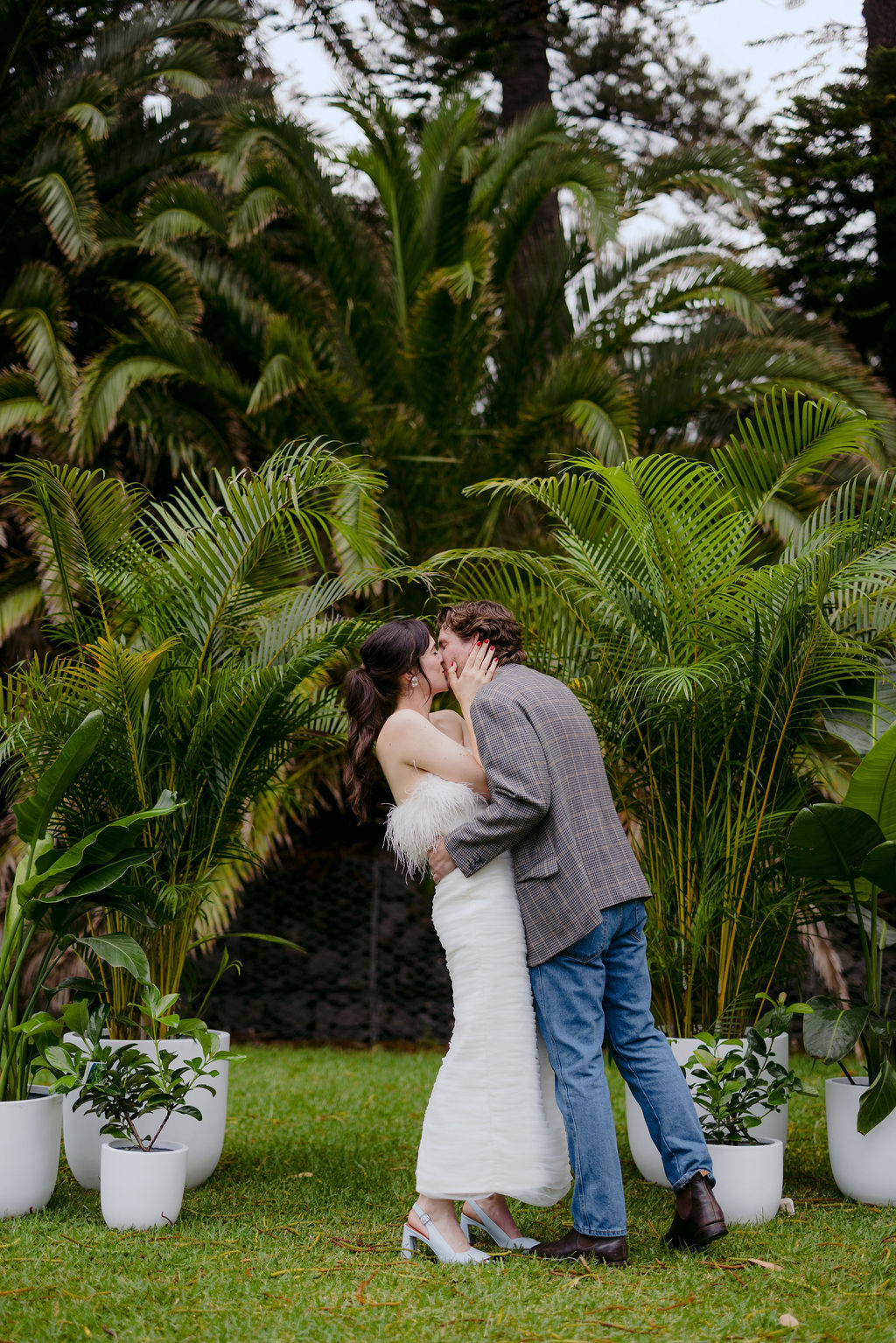 The bride (in a funky feathered Rebecca Vallance frock) and groom (wearing a partially Salvos-sourced ensemble) told us that they didn’t do a whole lot of vendor research, but are “lucky to be surrounded by a community of very talented friends, along with a few wonderful long-standing connections who just happened to be the perfect people for the job.”