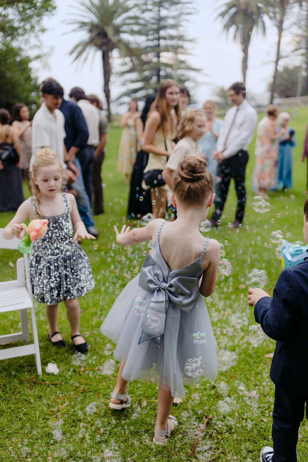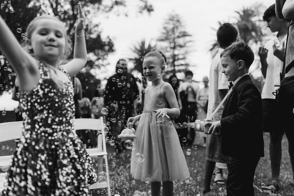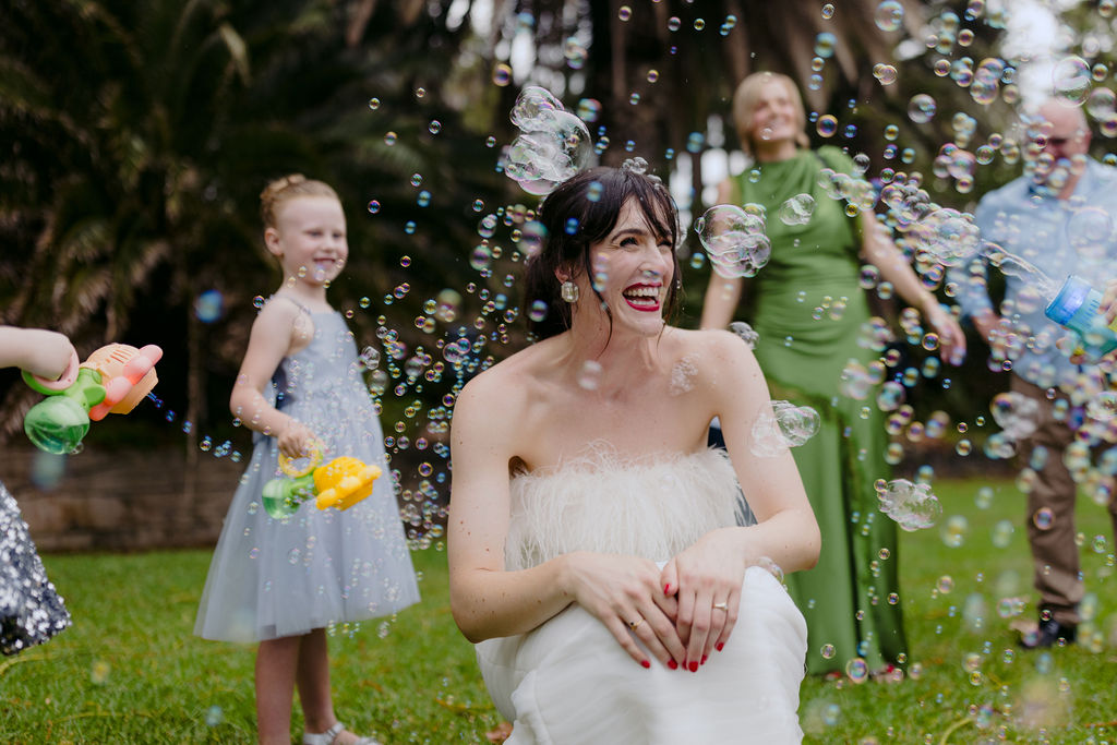 “The aisle moment and the ceremony were definitely highlights. My siblings are all between two and eight, and instead of traditional flower kids we asked if they’d like to be our “bubble kids”, mainly because I have a slightly ridiculous love of bubbles. Watching them proudly march down the aisle, blowing bubbles everywhere and being gently guided along by my siblings, was wonderful. I walked in behind them with my parents on either side of me, some of Sam’s closest friends playing the music, and Sam waiting at the end of the aisle next to my eldest sister Theresa, who was officiating the ceremony. During the ceremony Sam’s eldest niece Lia gave the Acknowledgement of Country, and his goddaughter Neve presented us with our rings. It was one of those rare moments where you look around and realise that all the people who have shaped your life are somehow standing together in the same place.”