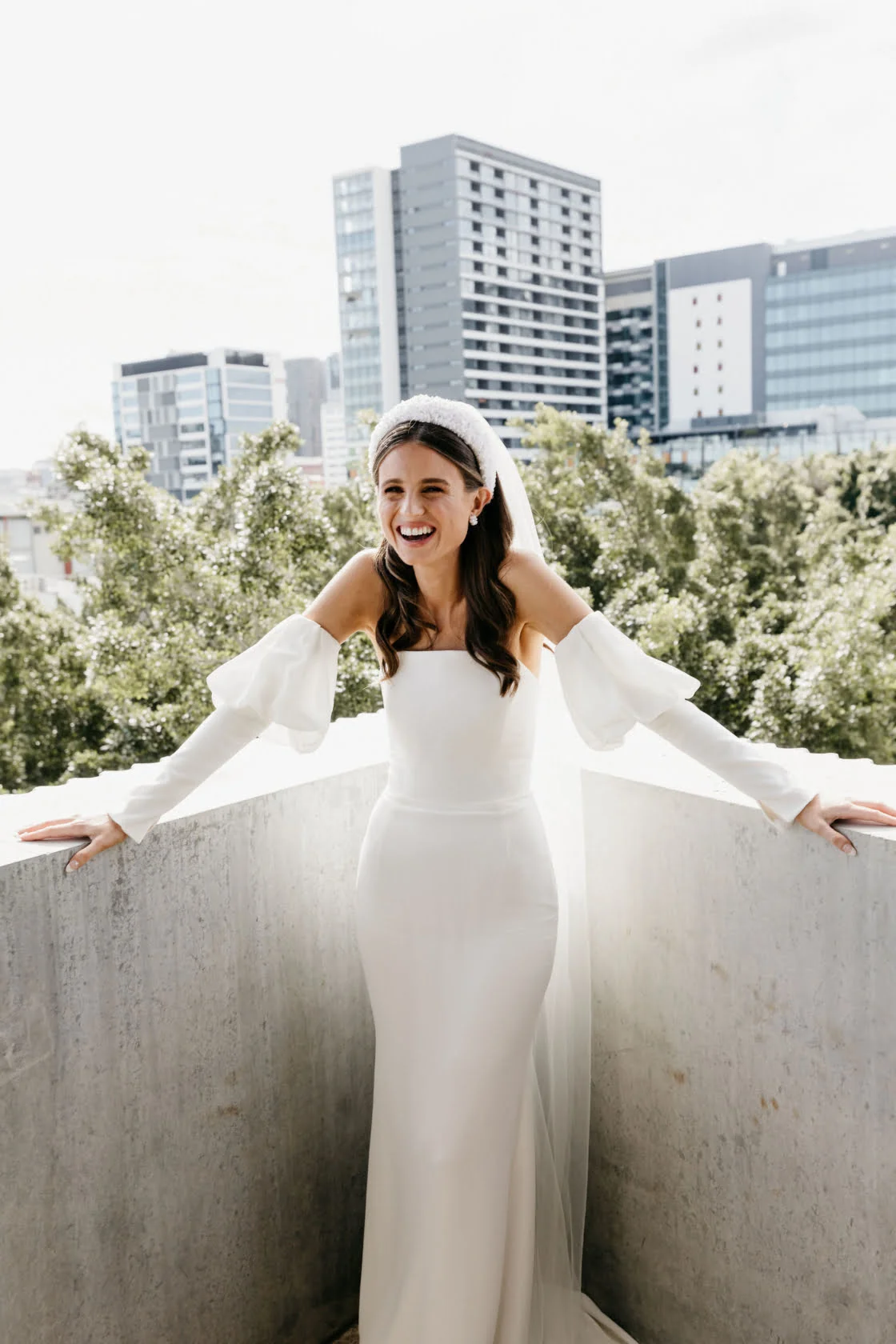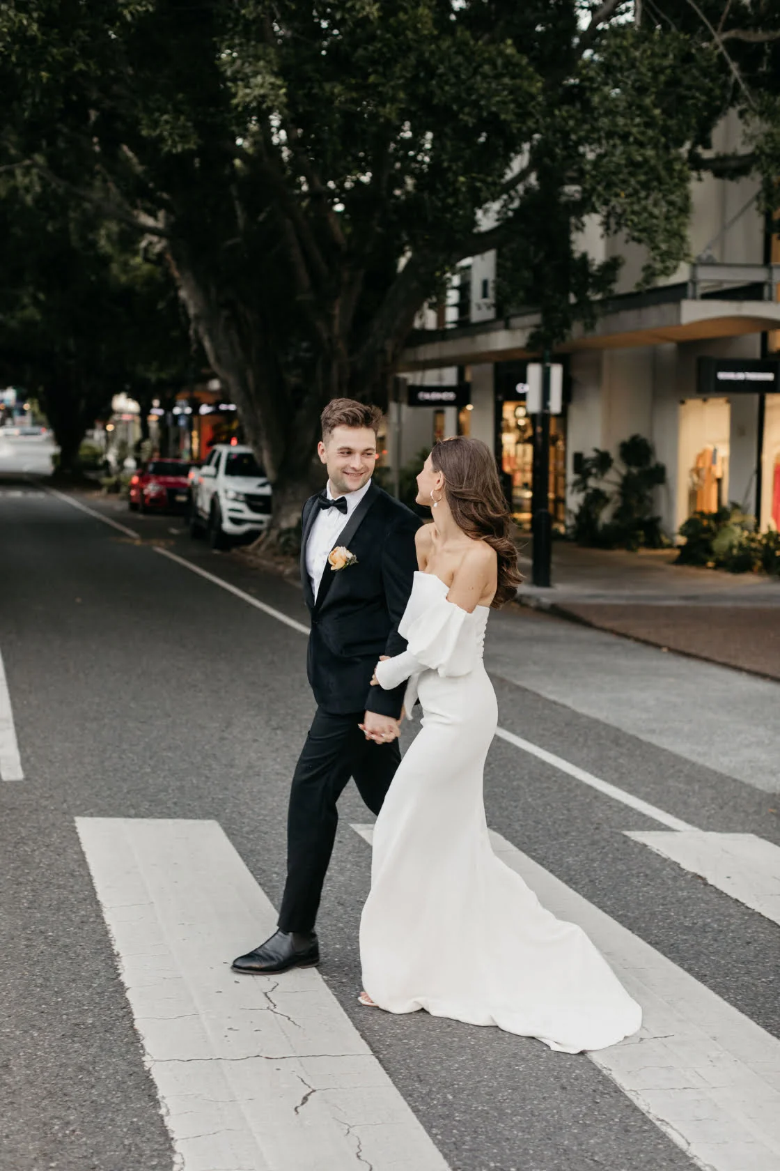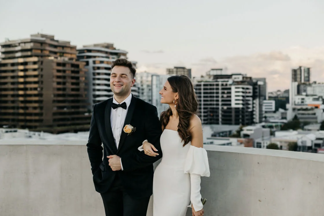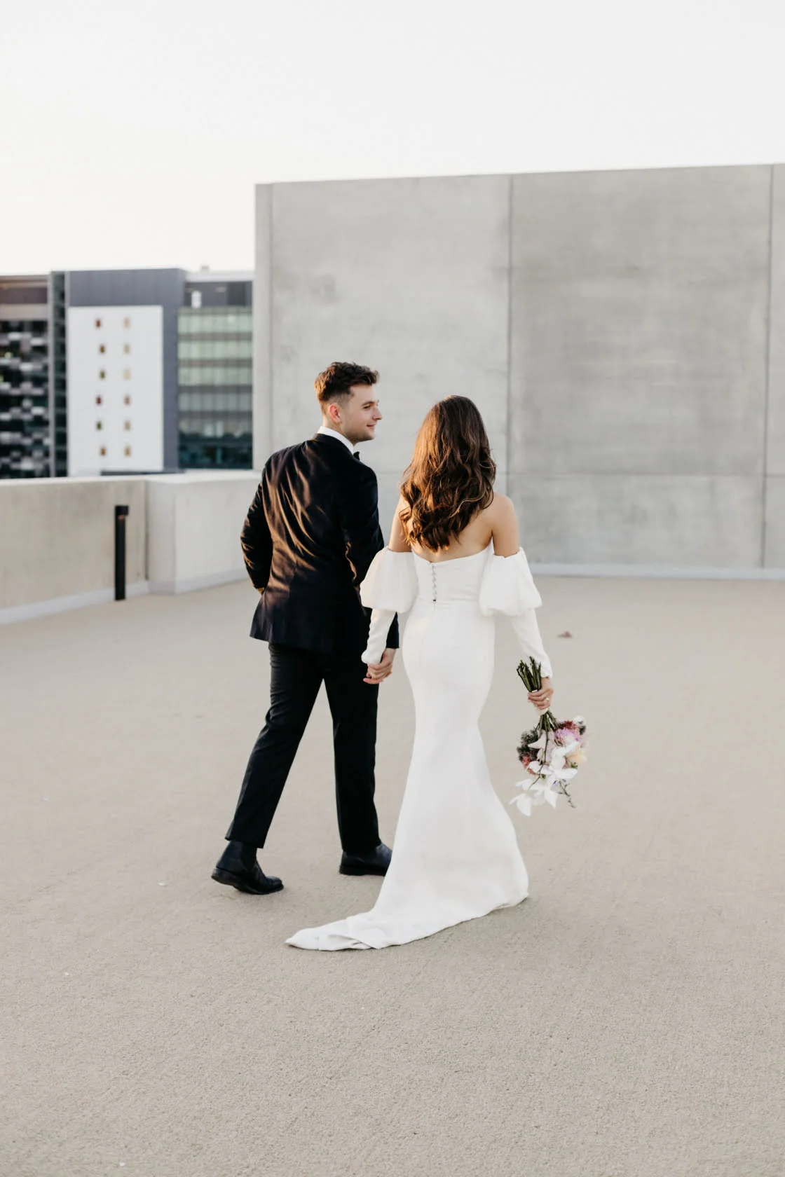 These two got married twice. They eloped during COVID (“it turned into a viral Tik Tok reaching 500k views, then got picked up by Daily Mail Australia and the rest of the world,” says the bride) but the one we are bringing you today is this urban delight, six months later. The stunning Prea James Bridal gown was bought from one of our go-to QLD bridal boutiques, Sphere Bridal Gallery and the pics are by the talented photographer/ videographer Milk and Honey Creative. Scroll down for more…