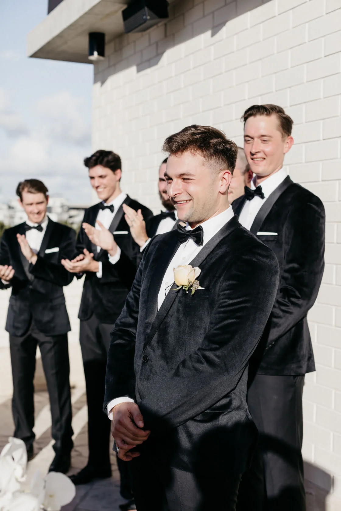 THE DRESS “The second I put it on I felt like Jackie O, and knew it was perfect. However I wanted to make some customisations and asked to extend the sleeves to look like gloves, I really wanted to wear something that hadn’t been done before. Matt and the groomsmen’s suits were an absolute steal, we got them from The Iconic for $60 each (orginally over $300), I think because it was coming in to Summer when I purchased them and they are velvet after all.”
