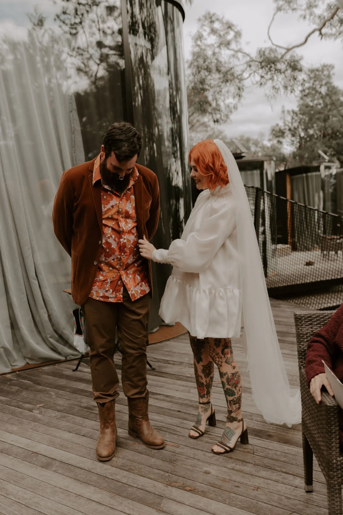 THE SUIT “Leading up to the date, I had asked Matt a few times what he wanted to wear and he had always given me a kind of clueless look and asked “Can’t I just wear shorts and Crocs?” I had looked at a few shirts and jackets online that he’d shown an interest in so I bought a few things online and hoped for the best. When they arrived the only thing that he was super keen on was the shirt (that he ended up wearing ) and the rest didn’t totally hit the mark but he was happy to wear them. I didn’t care what he wore, I just wanted him to feel comfortable, so I was ok if we didn’t happen to match… because its his day as much as mine. Fast forward to when we got to Tasmania, five days before the wedding, and we’d just gotten off the ferry in Devonport and Matt says “I think I might try and find some different pants for the wedding”. I had a little internal scream…. and calmly agreed to help. We happened to walk past a menswear shop and we went in. When we told the shop assistant we were looking for wedding pants for the groom, five days before the wedding, she was a little surprised by our calmness. She was super helpful and he found some pants he liked…. I then suggested we look for a jacket too, and we spotted the amazing blazer… and surprisingly they had his size!! He looked amazing and he felt comfortable! So when I say we didn’t intend to match each other OR the landscape, I’m not kidding.”