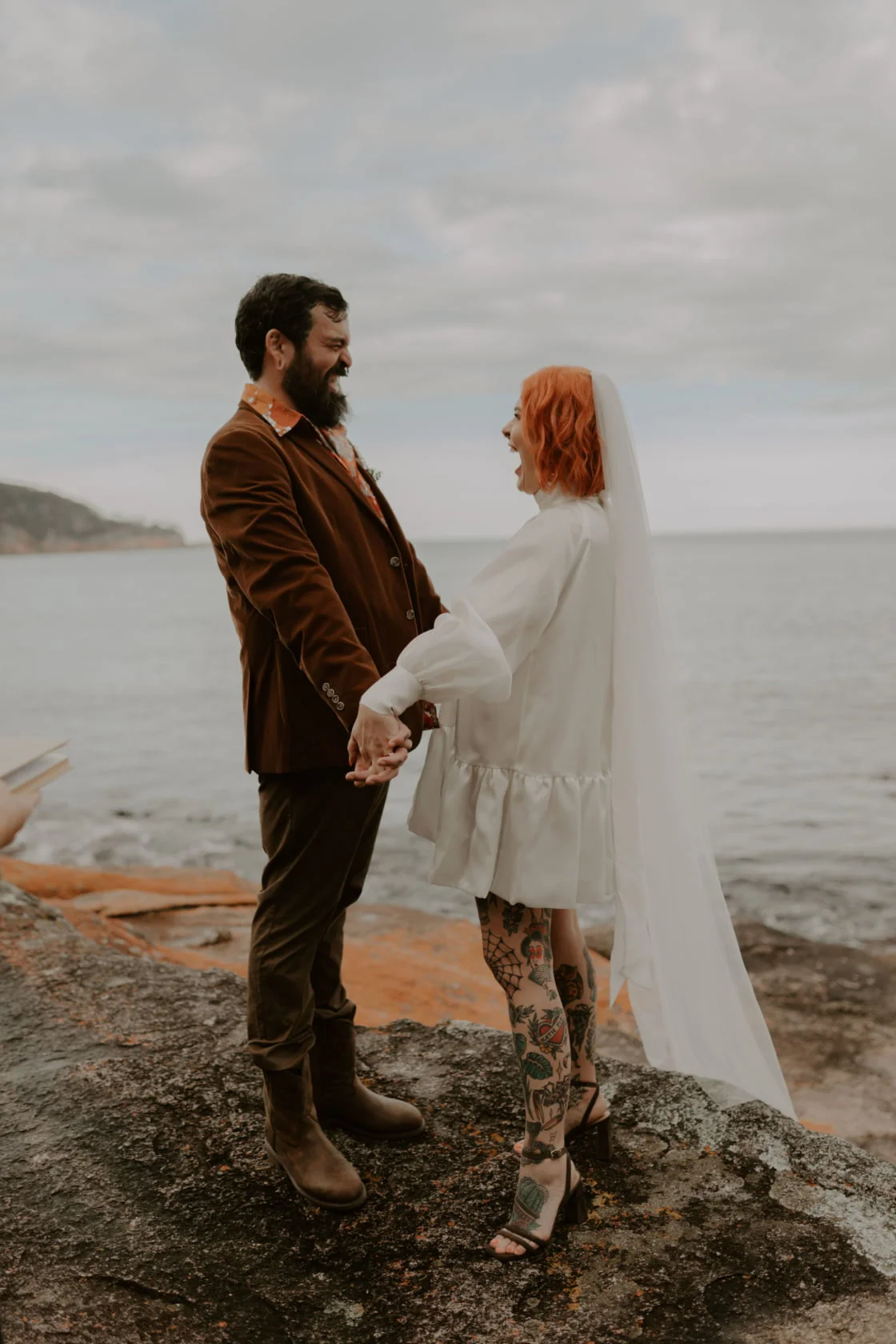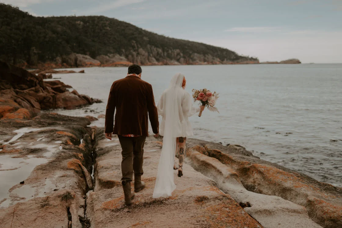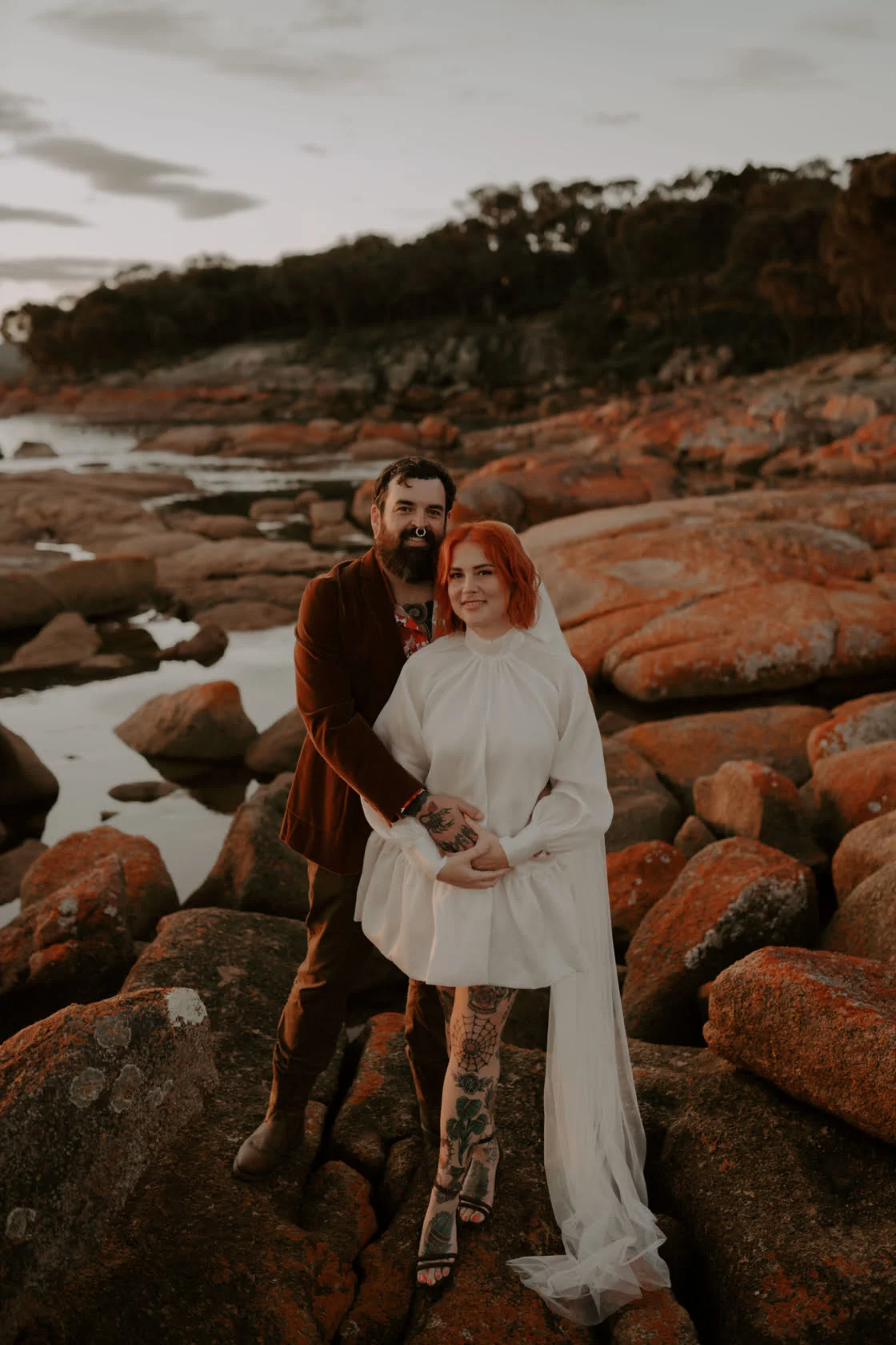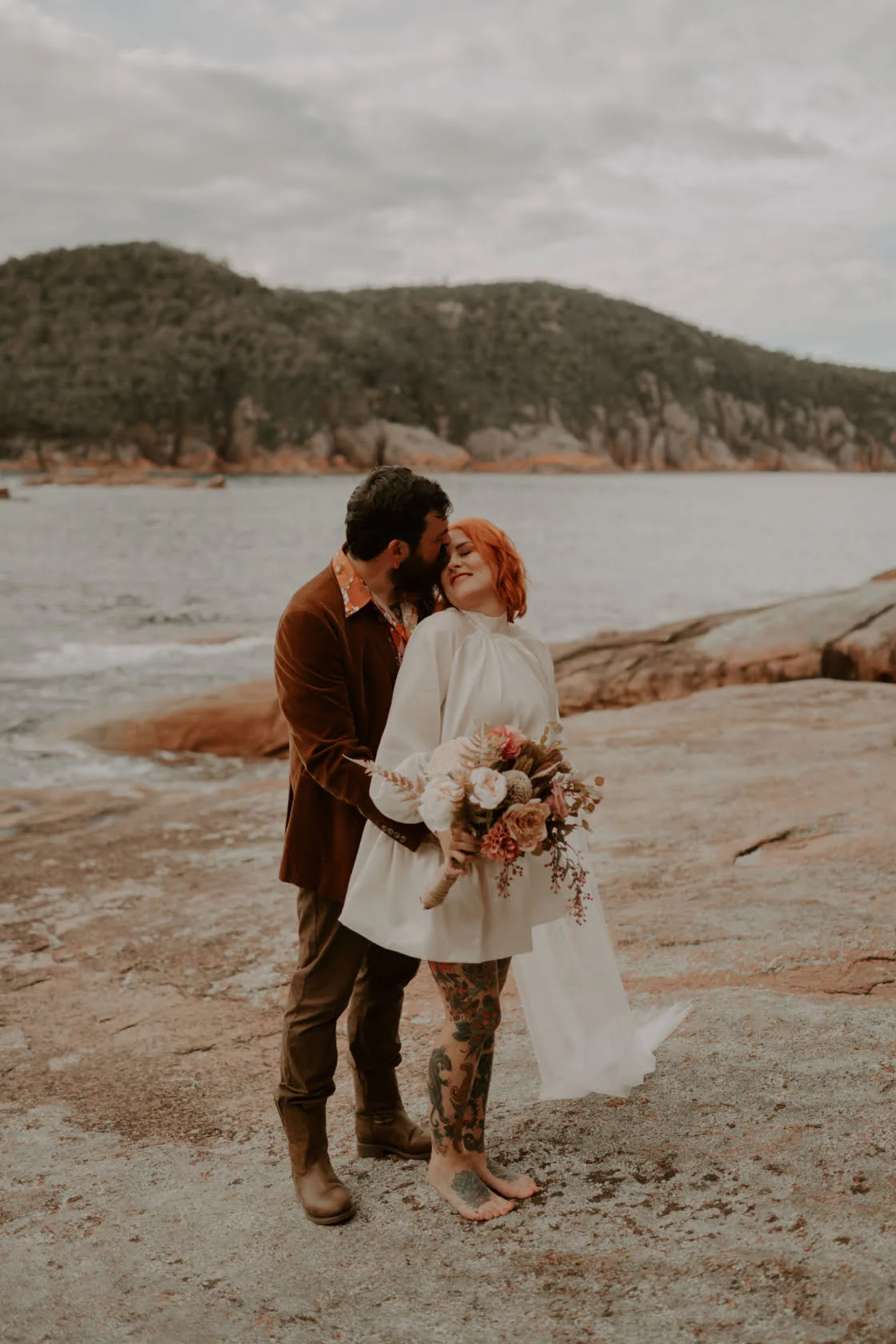 THE VENUE “We were originally going to have a small, intimate wedding with family and friends but COVID lockdowns were intense at that time and Matt and I were already living in different states so it all seemed a bit too hard and went on the back burner. Matt really wanted to visit Tasmania and I said “ why don’t we just elope?”. Matt’s a pretty private guy so he was keen to have a small, no fuss ceremony, and I have been married before so I didn’t want to do the whole massive wedding again. I spoke to a friend who lives in Tassie and she suggested Freycinet National Park as a beautiful Venue. Matt and I love nature so we wanted to immerse ourselves in it on our special day.”
