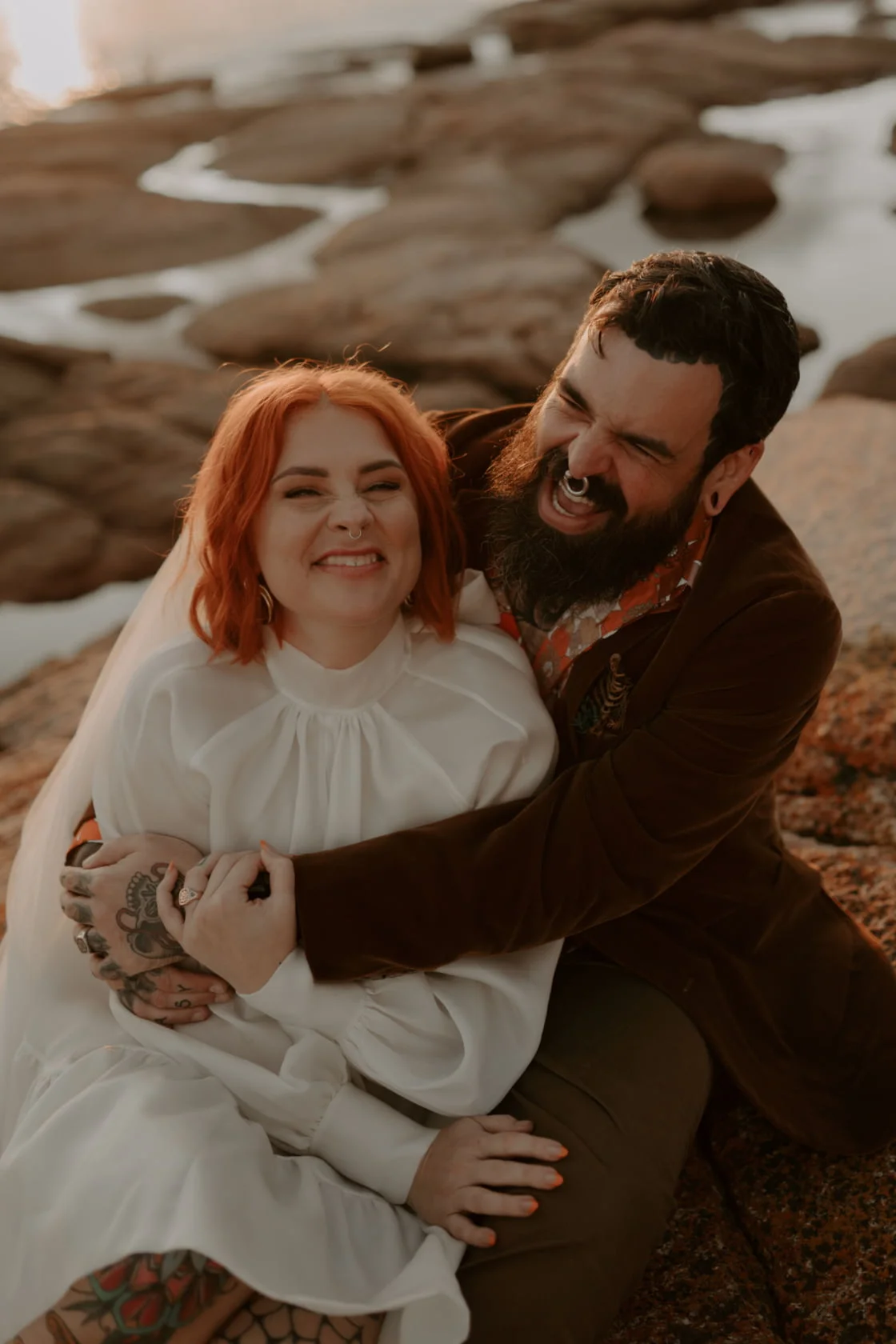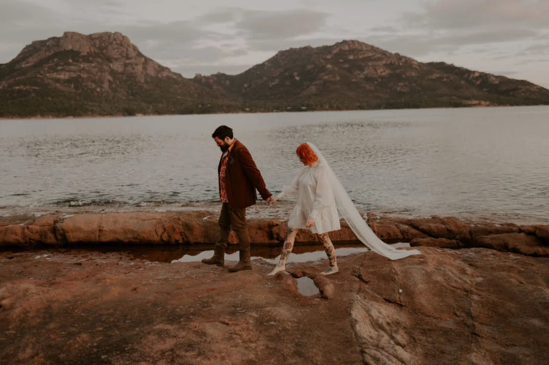 Jen is an emergency nurse and Matt a tattoo studio owner, so when it came time to tie the knot, these two opted for something chill and low-key. We’re talking one guest, a cruisey ceremony and a heavenly portrait sesh in the middle of Freycinet National Park. Pretty picturesque, no? We sure think so. “We made it very clear to our photographer and celebrant that we wanted something very intentional, intimate and non traditional”, they share and that is exactly what they got. If you’re feeling the relaxed vibes these guys are putting down then you’ll want to scroll on for some rad snaps by Mel Badsey…