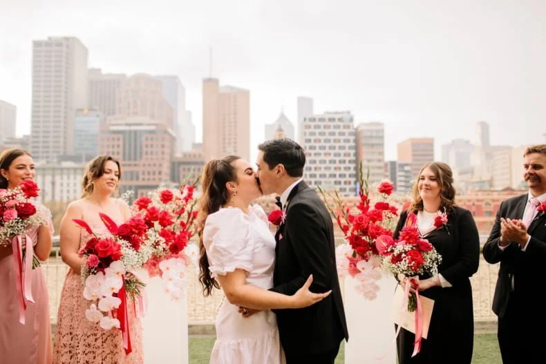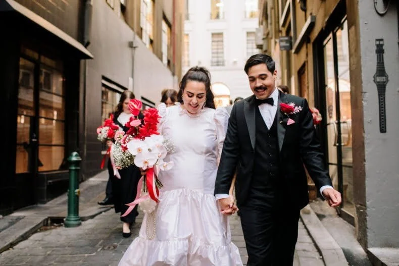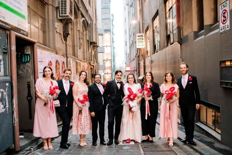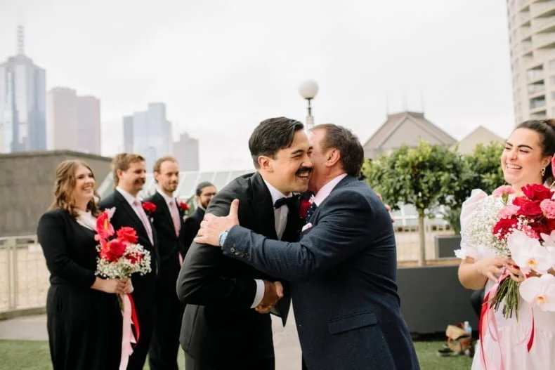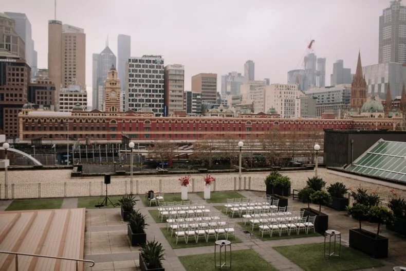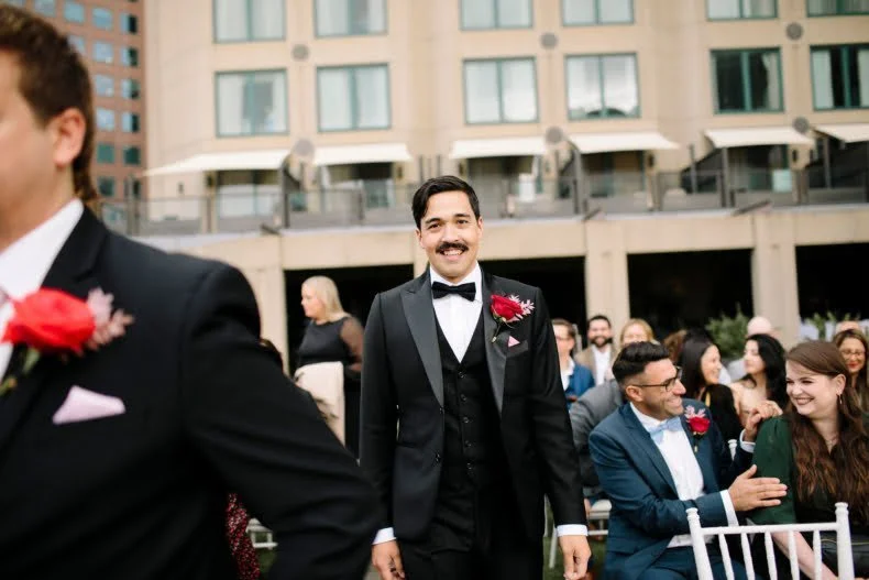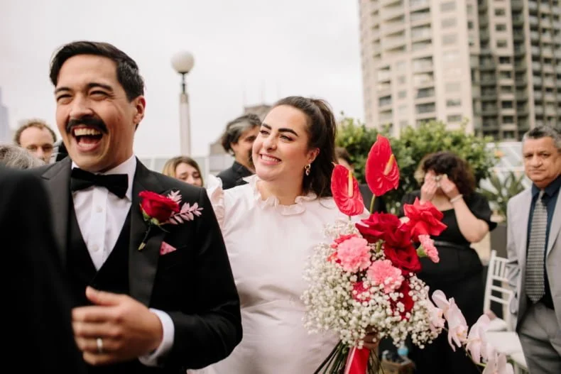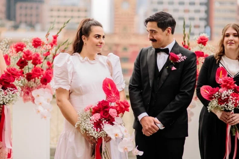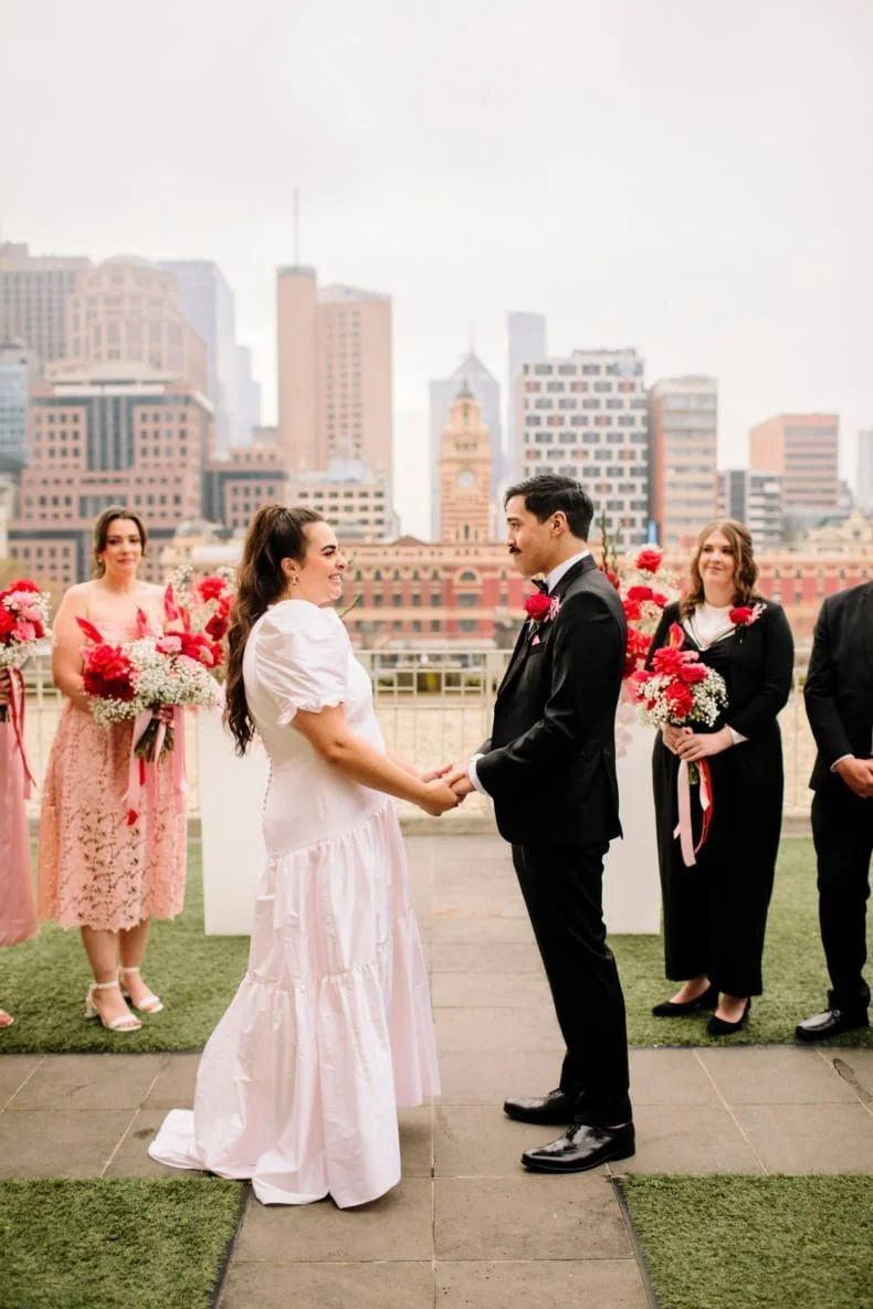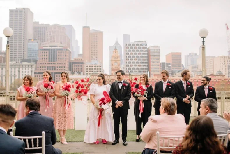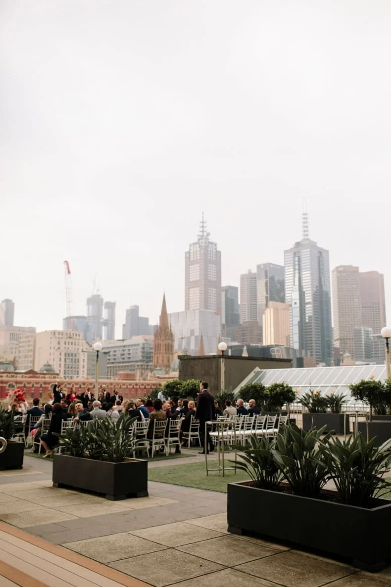 MEMORABLE MOMENT “Like every Melbourne couple planning an outdoor wedding, we worried about the weather. The forecast was for rain, but how much? The Langham rooftop has no weather protection, and we were pretty stressed the day before the ceremony. On the day, it was pretty cloudy. Moments before the music played and Zeena walked out, the skies cleared, and the sun shone out. It was amazing, and honestly a little cliché. We laughed about it at the time, but it was such a special, beautiful moment.”