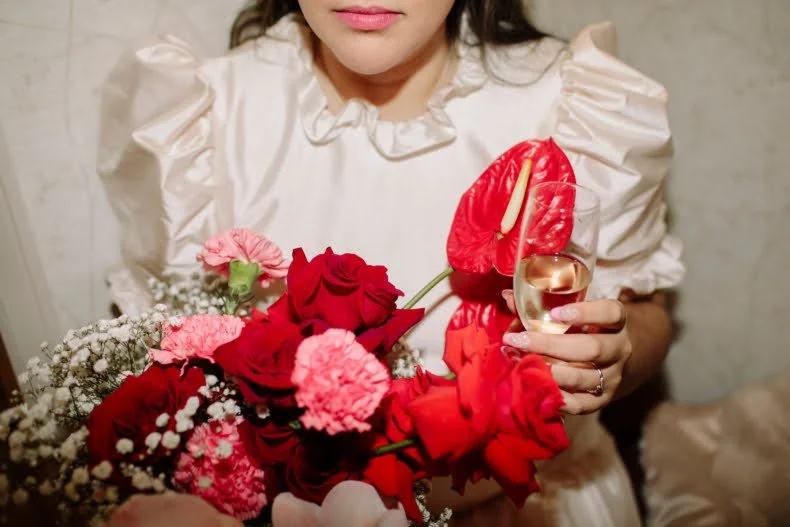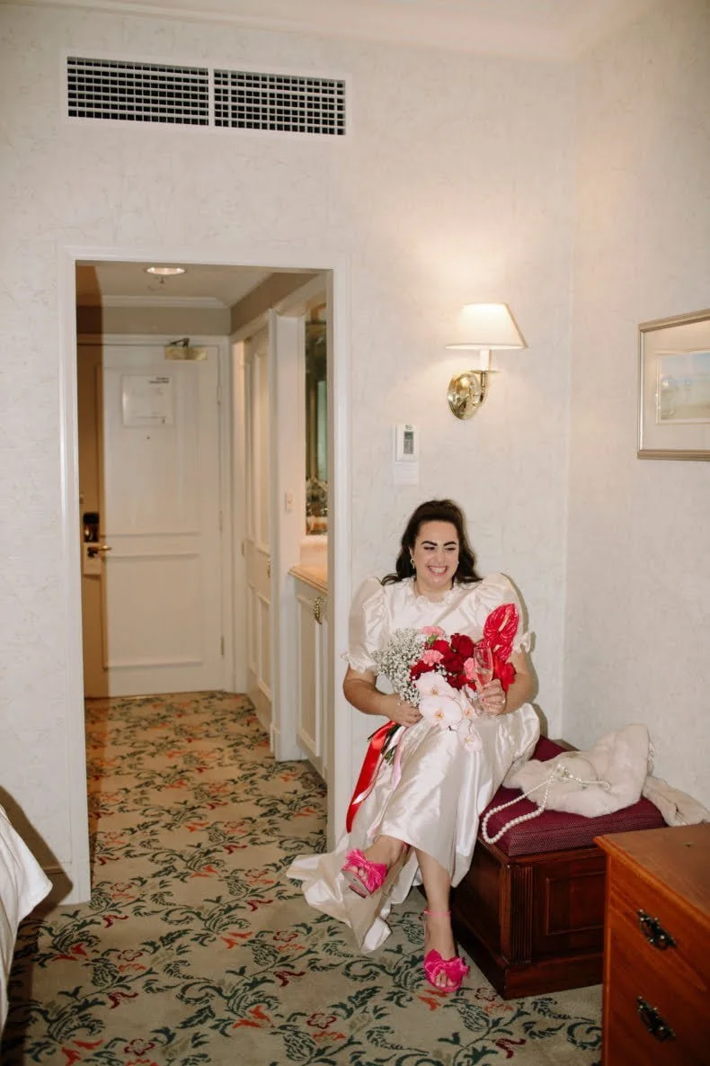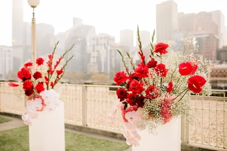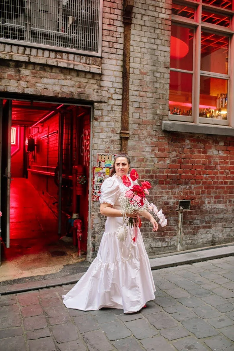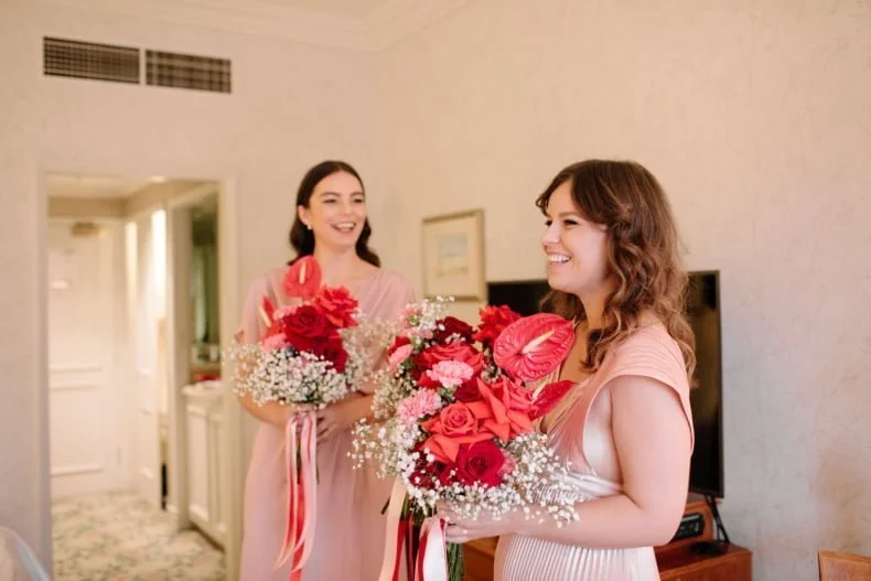 THE INSPO “We decided on our colour scheme first and everything else fell into place. We love pink and red together, so Bloom Boy was a perfect fit for our vision. We liked the idea of a low-key cheesy prom feel – from the dresses and suits to the cake and flowers, we’re so happy with how everything turned out.”