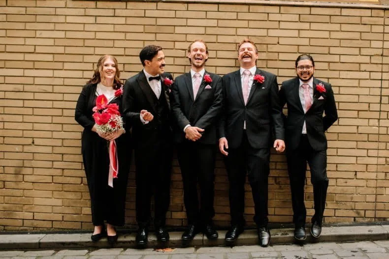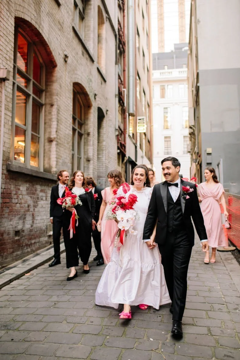 CONTRIBUTING VENDORS Photographer It’s Beautiful Here Florist Bloom Boy Ceremony venue The Langham Reception venue & catering Rupert on Rupert Food Trucks Cannoleria Cake Miss Trixie Drinks Tea Wedding favours Candy Addictions Signage & stationery Self-made Printer Classic colour copying Entertainment Melbourne Entertainment Company Celebrant Kate Morgan Rings Eli Speaks Jewellery (bride), Evita Jewellery (groom) Transport City Car Hires THE BRIDE Bridal gown Bonita Couture Shoes Pink Inc from Myer Accessories F&H Studio Hair Natalia Abelas Makeup Jaynelle Lording THE GROOM Suit & tie Institchu Cufflinks The Cuffshop Shoes McCloud Shoes Watch Daniel Wellington Barber Barber Black Sheep Groomsmen suits Ferrari Formal Groomsmen shoes Myer