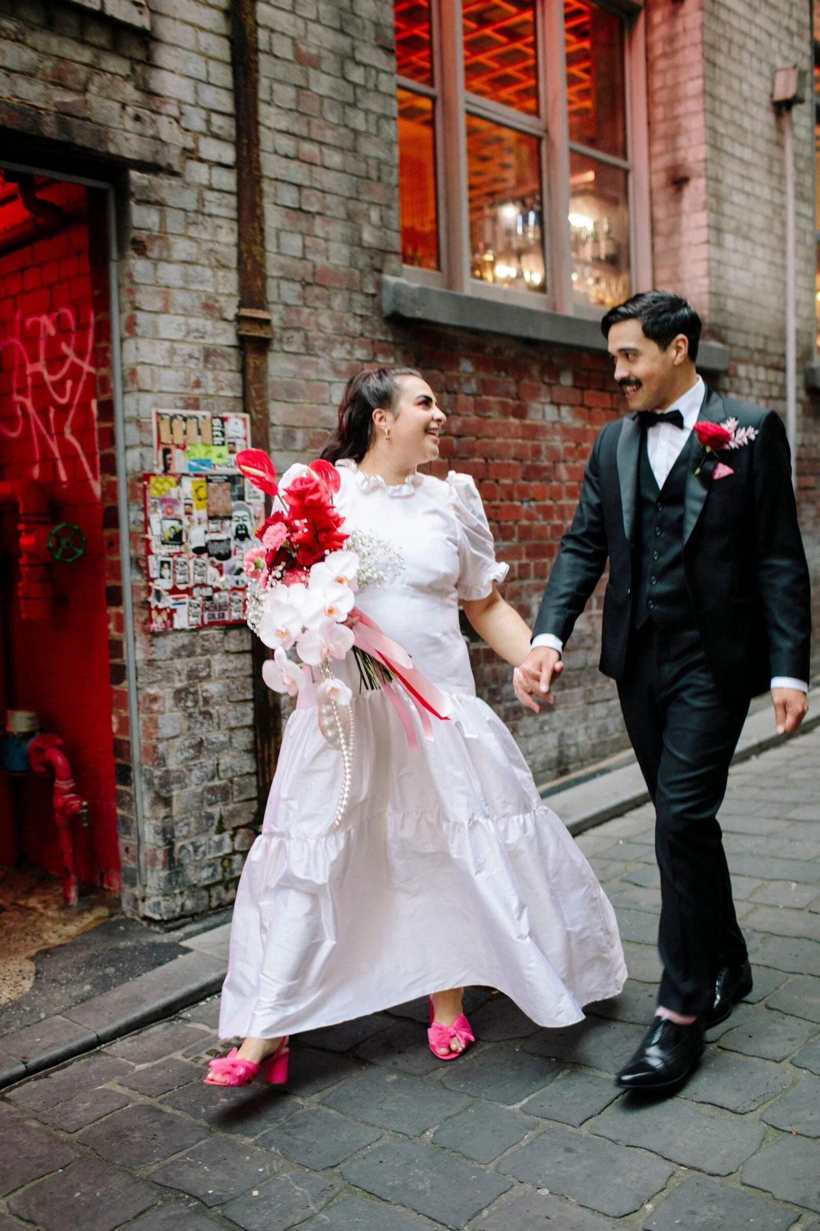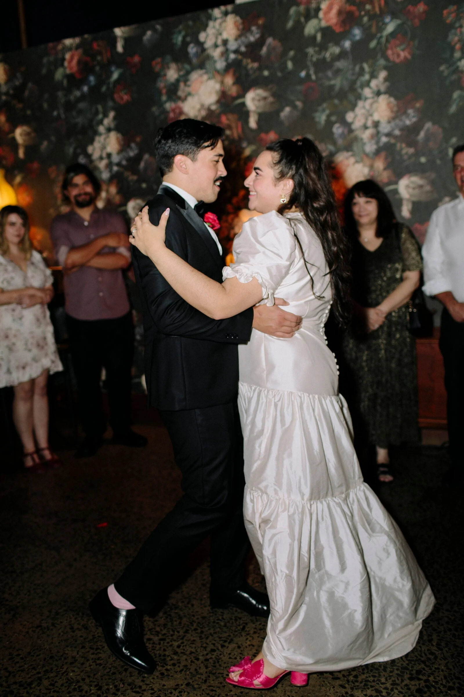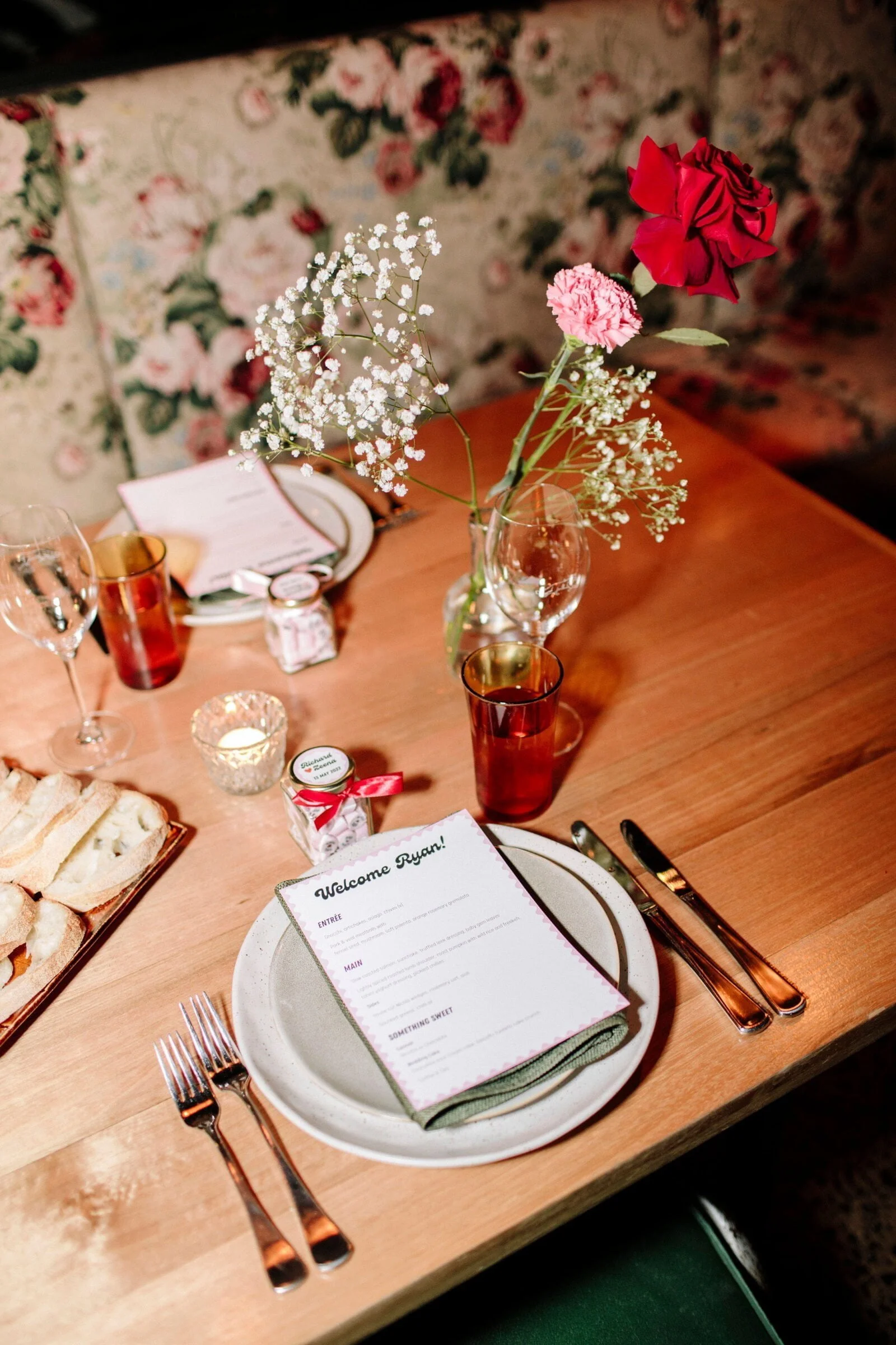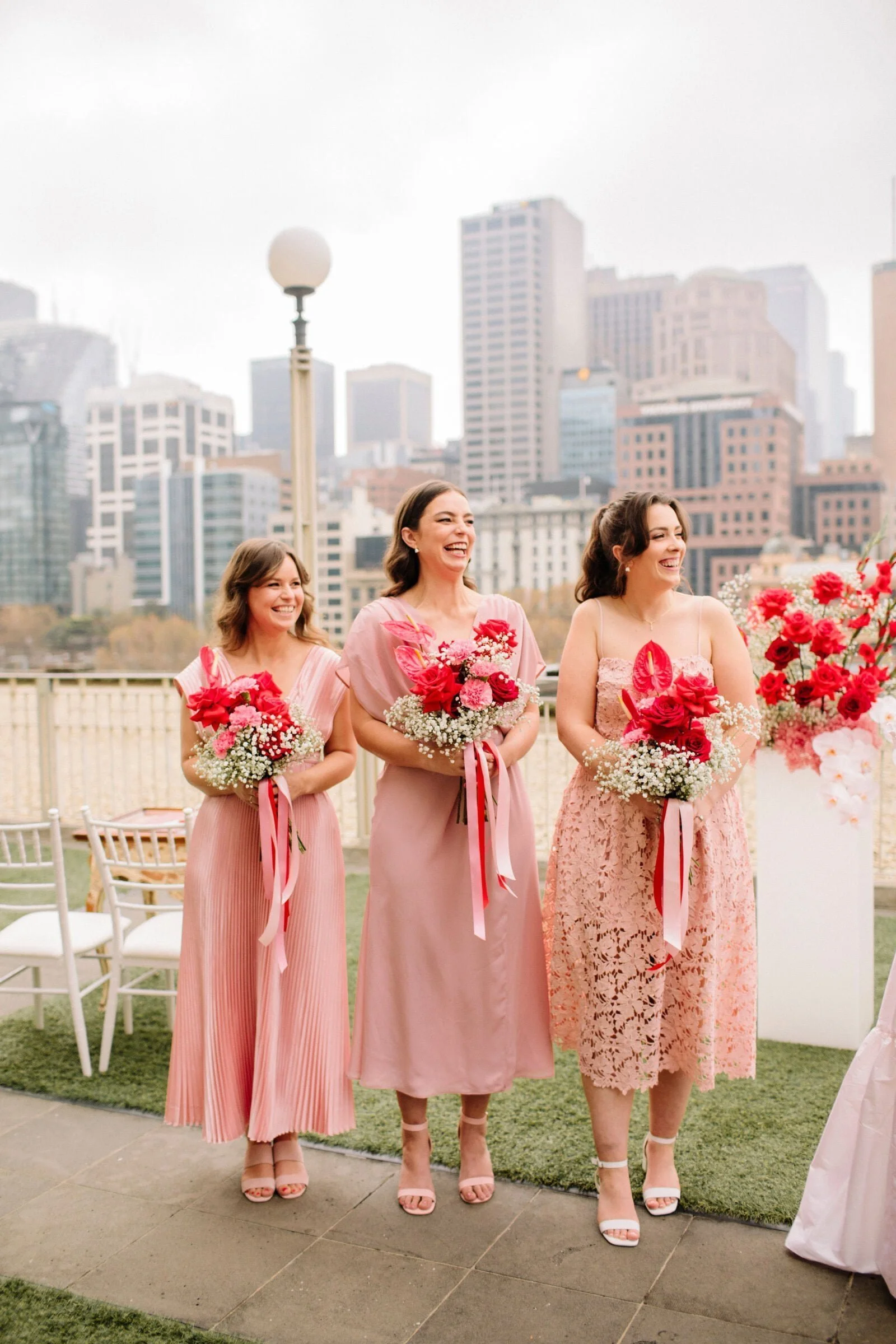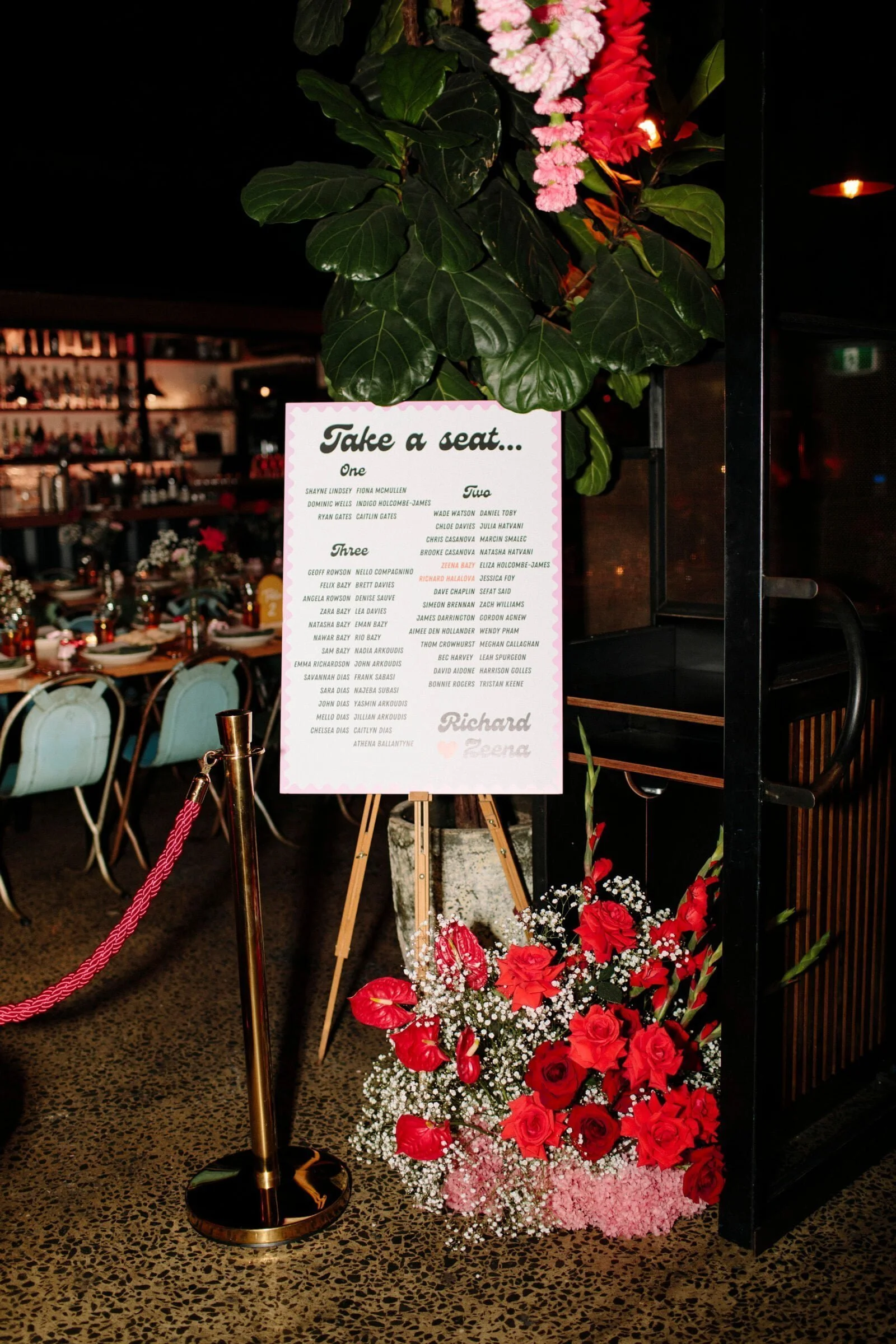 THE INSPO “We decided on our colour scheme first and everything else fell into place. We love pink and red together, so Bloom Boy was a perfect fit for our vision. We liked the idea of a low-key cheesy prom feel – from the dresses and suits to the cake and flowers, we’re so happy with how everything turned out.”