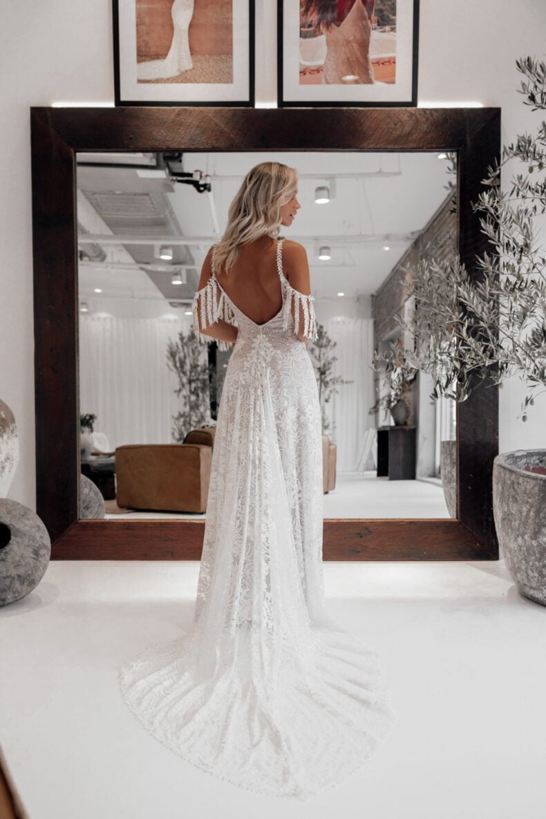 What are the three most popular designs on your racks? We really value customer feedback and after almost 13 years of Grace (and as a team of mostly women), we’re confident we have a good grasp on what our brides really want. In 2023, we launched our Jones gown, which was designed based on feedback from our brides looking for more support and with no restriction. This gown is fast becoming a go-to for our brides this year! Brides are also loving Goldie from our Memoirs Of Her collection, which features a high-neck and low-back moment – both big bridal trends in 2023/2024. Finally, for our lace-loving brides, they cannot get enough of Nathalia. Featuring an off-shoulder, mirror-lace design, this gown always brings that ‘wow’ moment our brides are dreaming of!