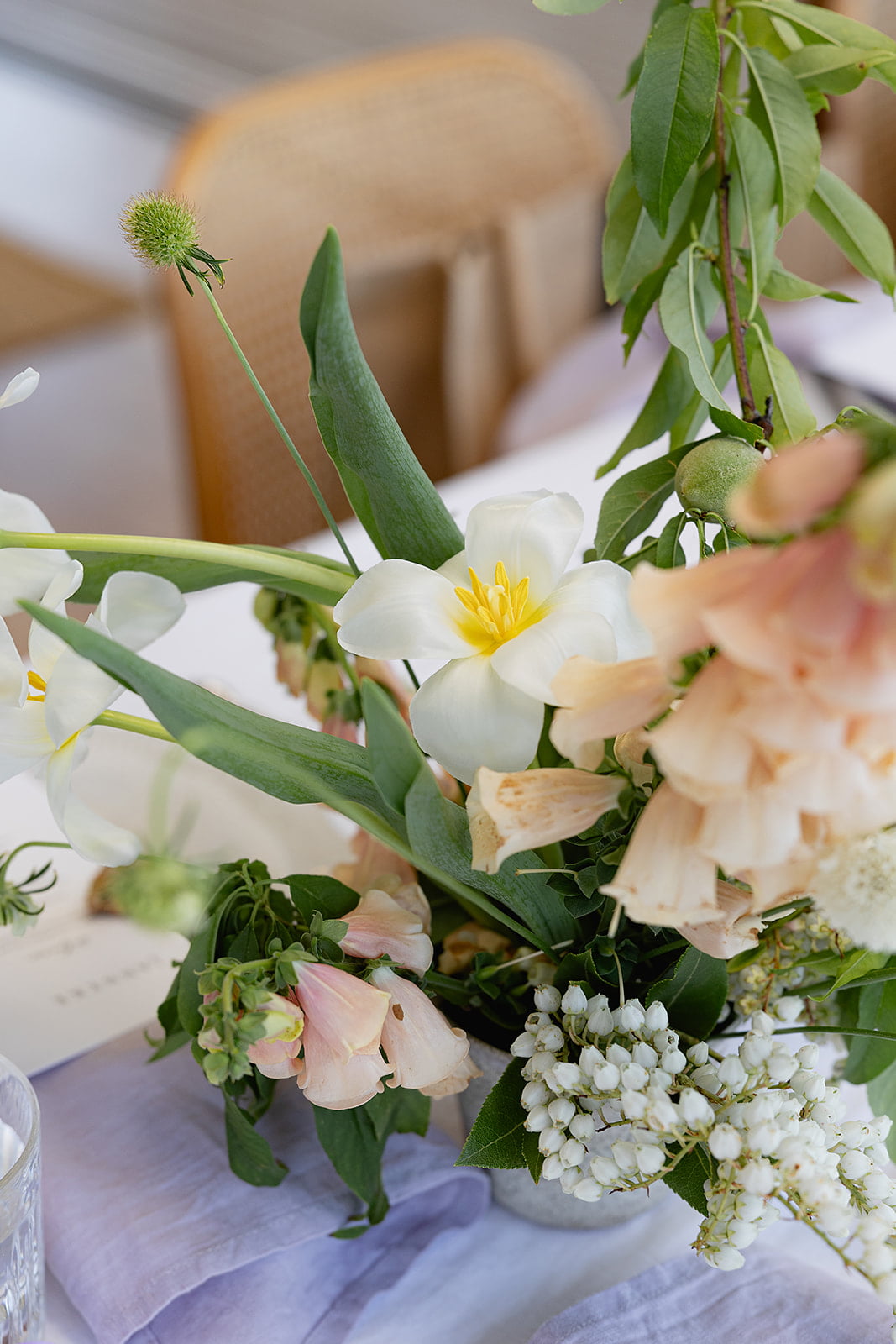 Due to the blank canvas aspect of the venue (as well as the fact we pretty much hosted a small wedding), we called in one of the best in the biz to plan, co-ordinate and style the day (seriously guys, if you’re on the fence about hiring a event planner/stylist, trust us, they’re worth their weight in gold). The lovely Steph from Blossom Gatherings is an absolute powerhouse and assembled the most talented bunch of vendors to create the magic – elite hire company The Wedding Shed delivered all the furniture, glassware, crockery and linen, Paper Paper Co nailed the stationery and signage, the incredible Hannah Darling serenaded guests, local baker Hello Little Crumb made the EPIC cakes, including a French earl grey and brown butter poached pear tea cake with lime glaze (drool!), and the stunning floral styling was courtesy of Emily of FLWR, who sourced all the beautiful blooms locally.