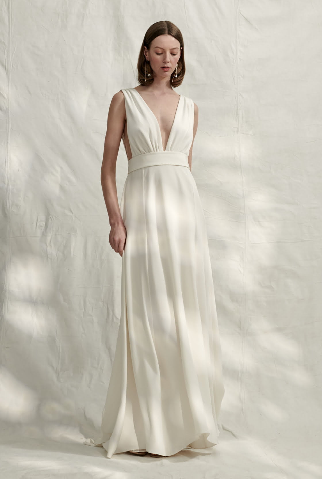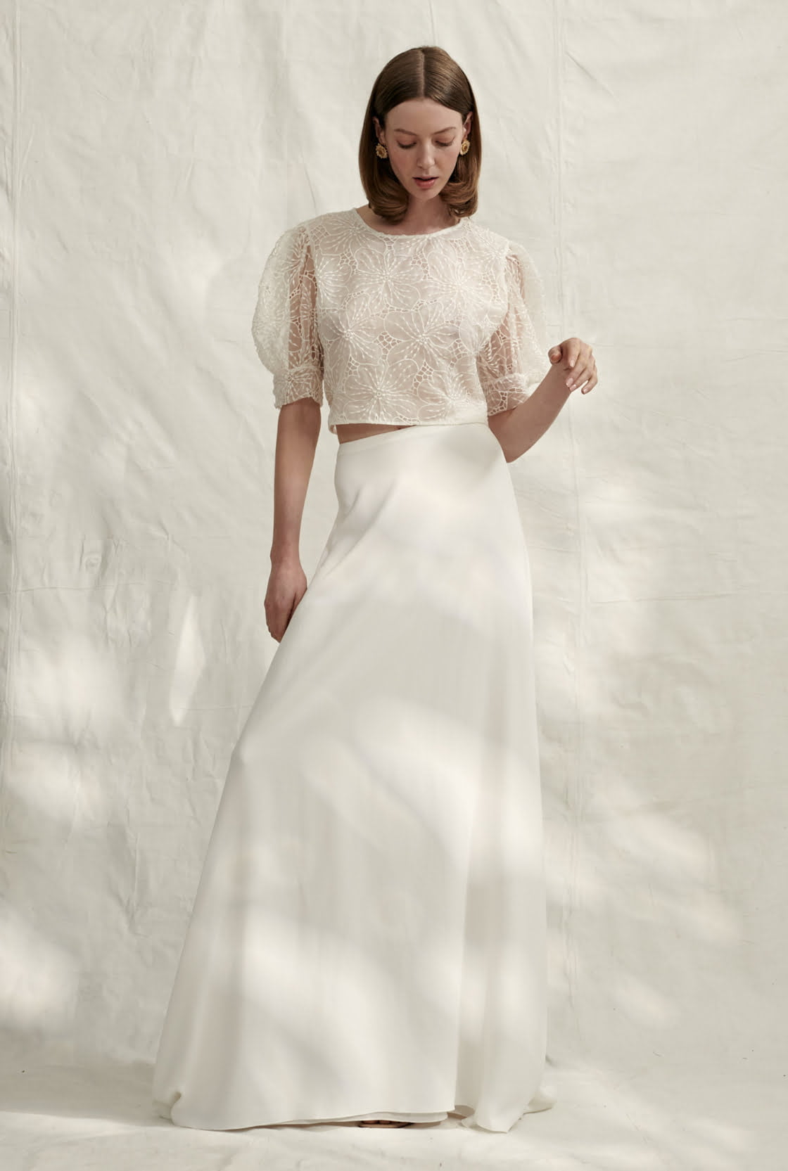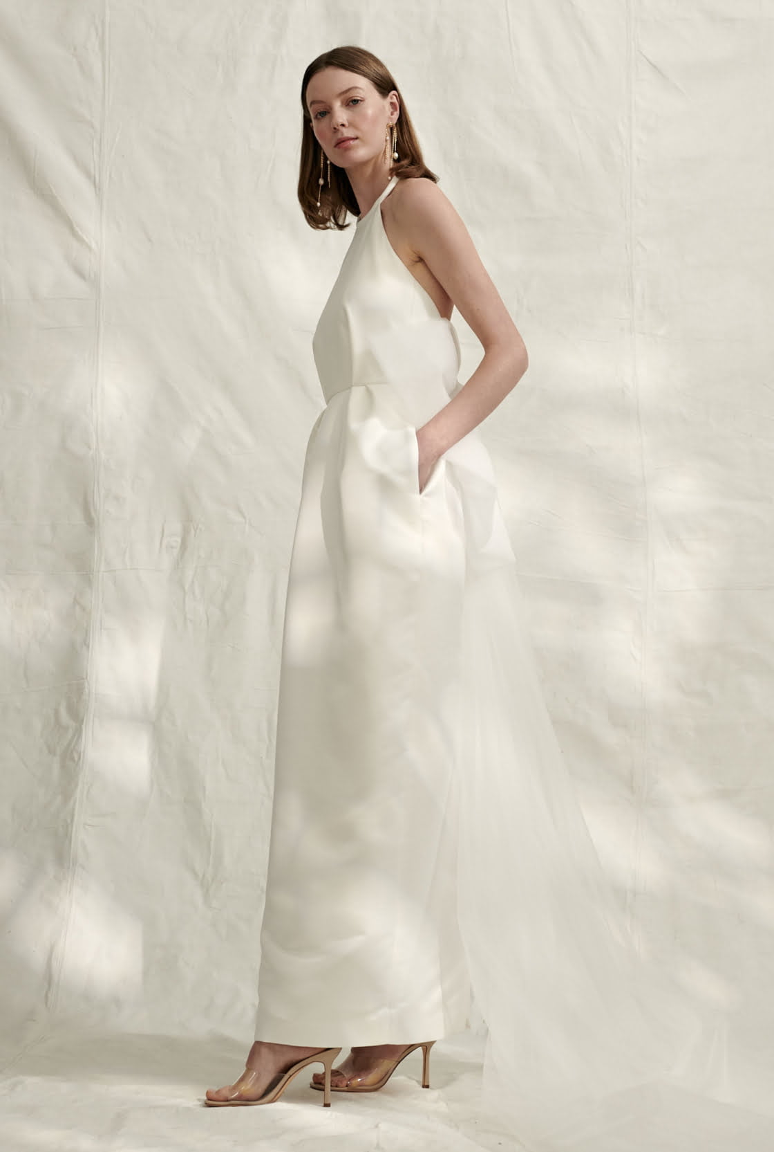 Worth noting, this is the in-house brainchild of Anastasia (of Carte Blanche Bride) and Tania Stokes Couture who came together to design and produce (made in Melbourne, no less) a collection of gowns for the minimalist bride who wants to buck tradition and boast a short piece for their nuptials or needs something more low key for a civil ceremony, or reception. It’s also on the more purse-friendly side of things, with prices starting at $665. We like it so much you’ll find one in our recent round-up, 20 Looks To Elope In and editorial, Girl On Fire.