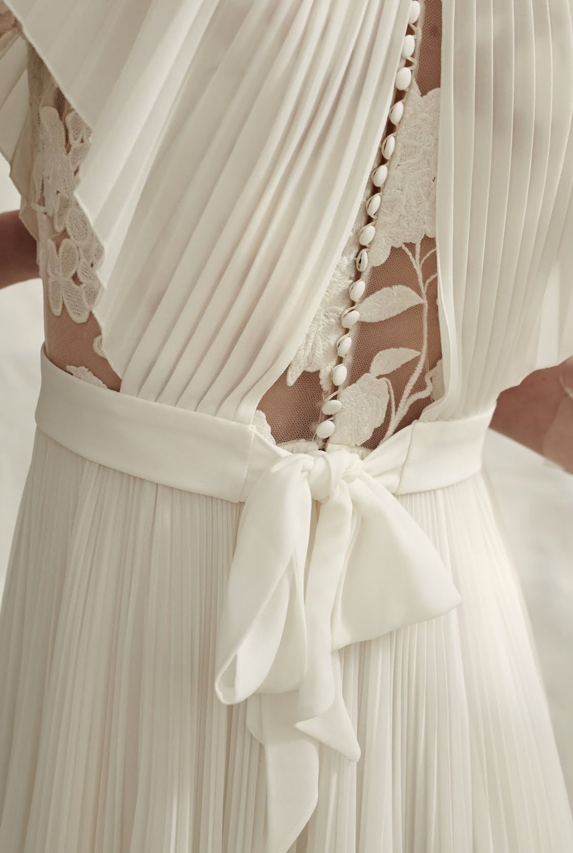 If you’re a lace lover, Margaux Tardits is a must. Snippets of skin sit under perfectly placed details to keep one’s dignity intact while feeling sexy when sauntering down the aisle. Expect design lines like pleated skirts and intricate waist embroidery for figure-flattering results. For more, check out this designer in action in one of our editorial photoshoots, All In On Details.