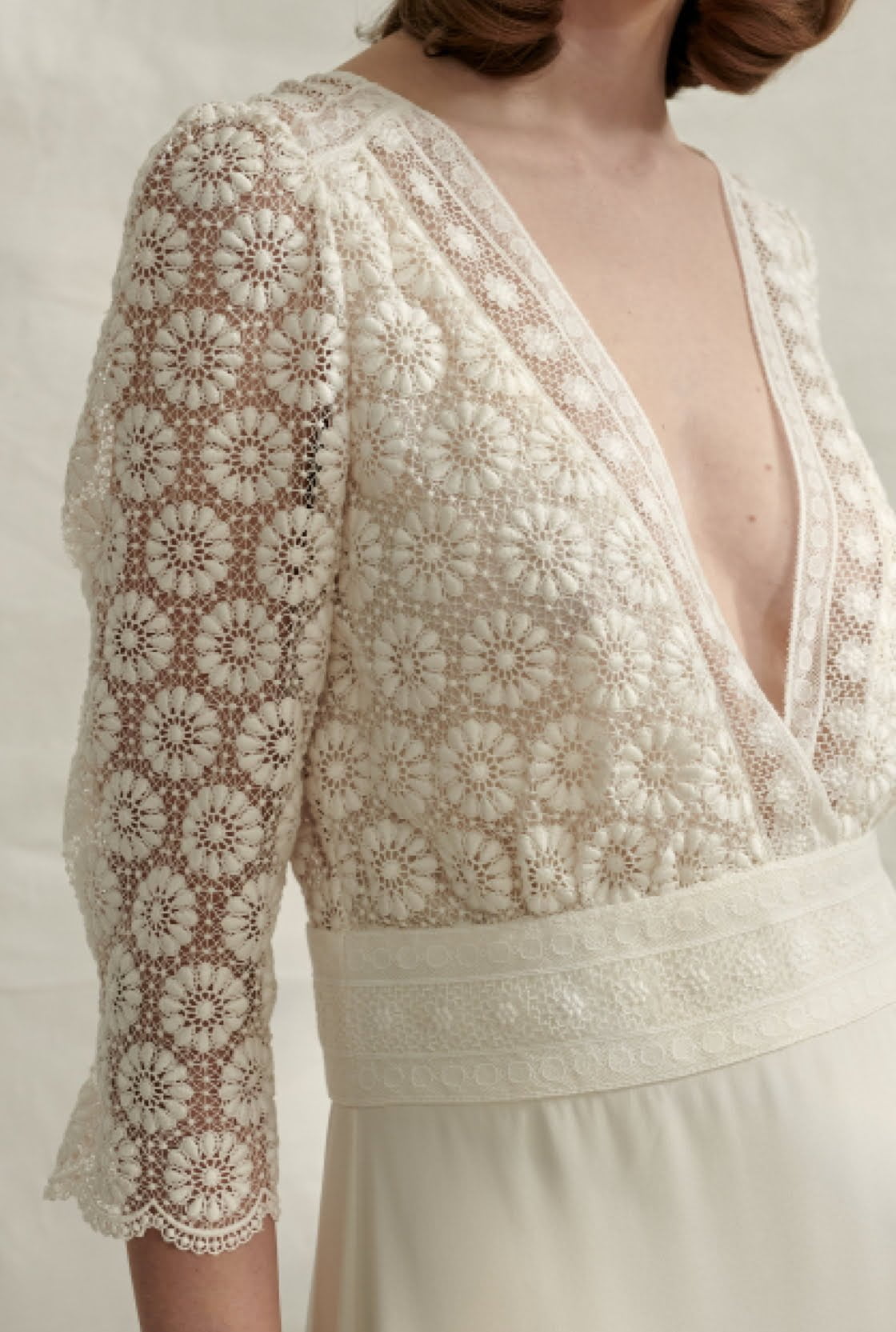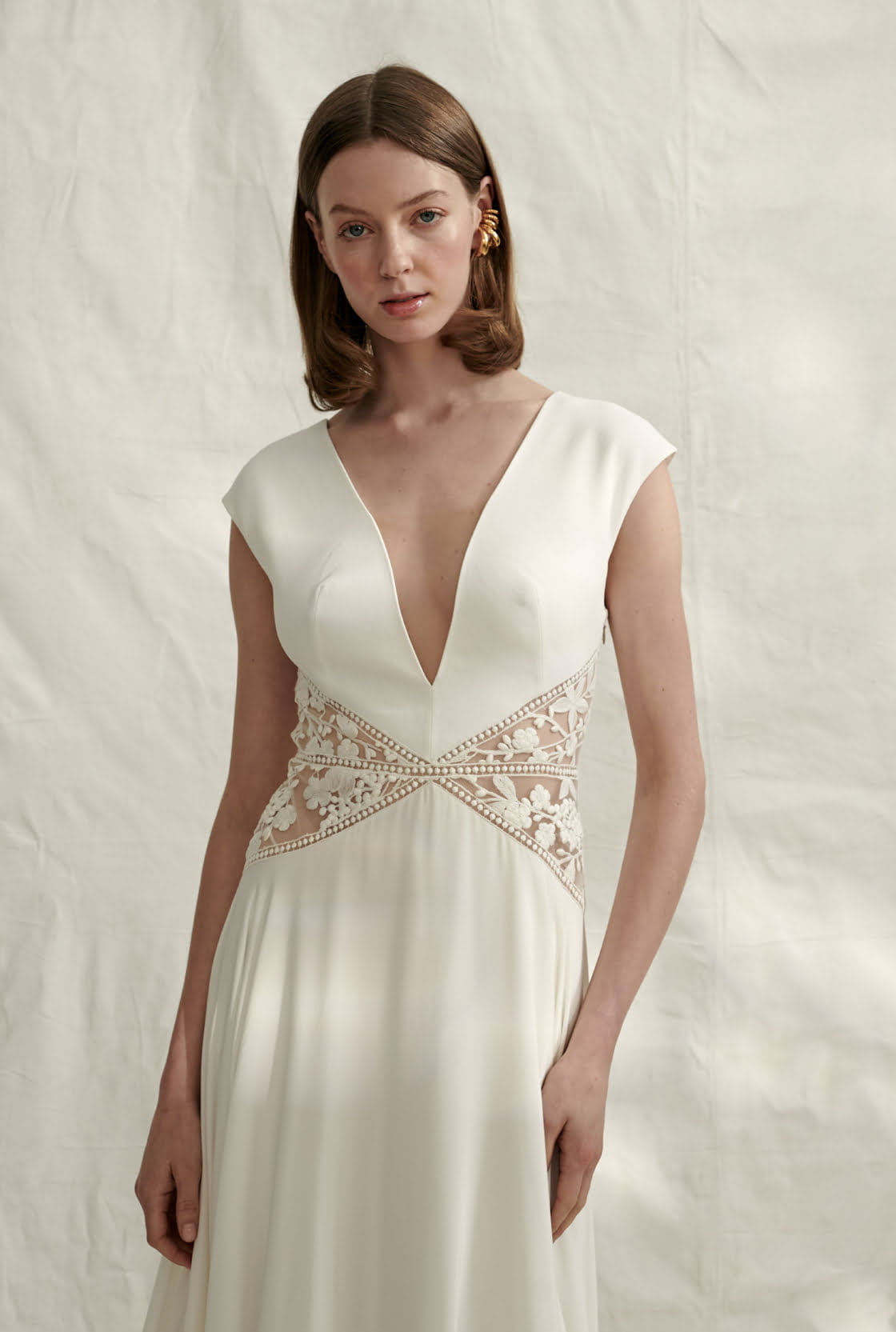 Thanks to the delicate lace detailing and more relaxed fit, Laure De Sagazan gives off romantic feels while remaining modern in feel. Look out for sophisticated long sleeves and cute cap sleeves, balanced by low backs and the sweetest florals. And if you want to see more, check out an incredible piece featured in a past shoot of ours, Let Love Bloom.