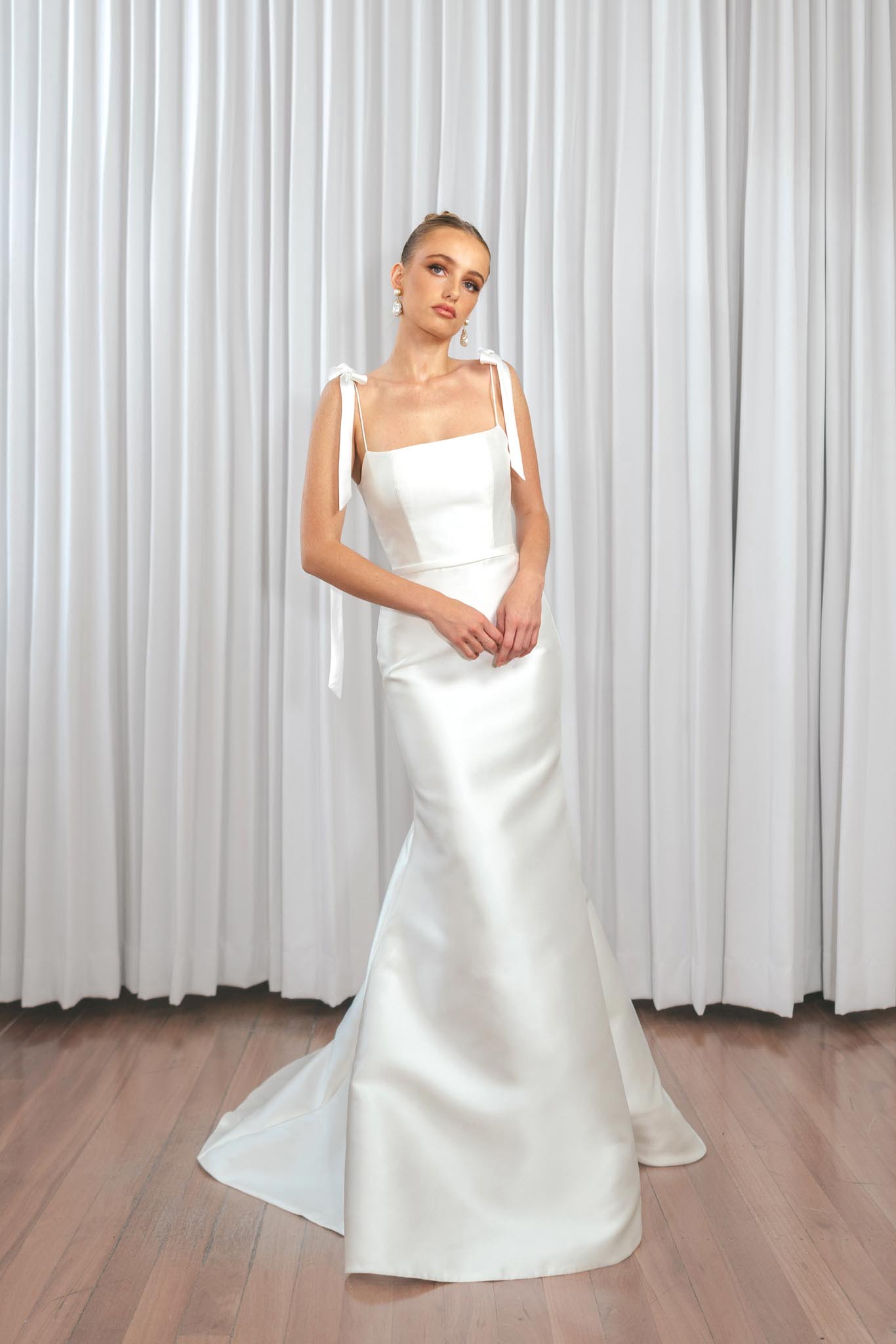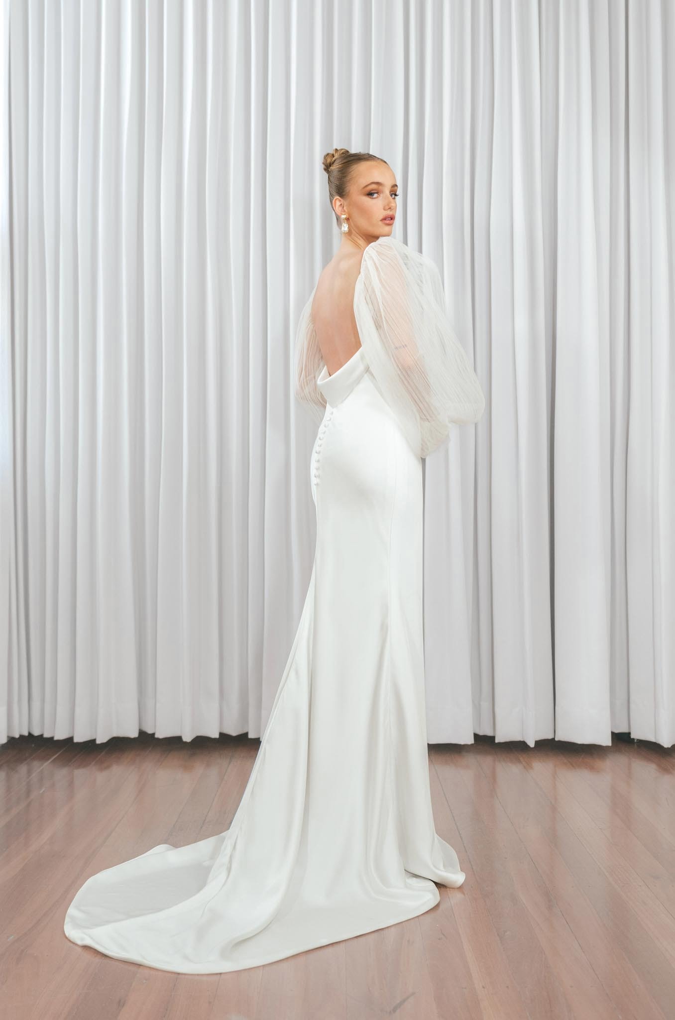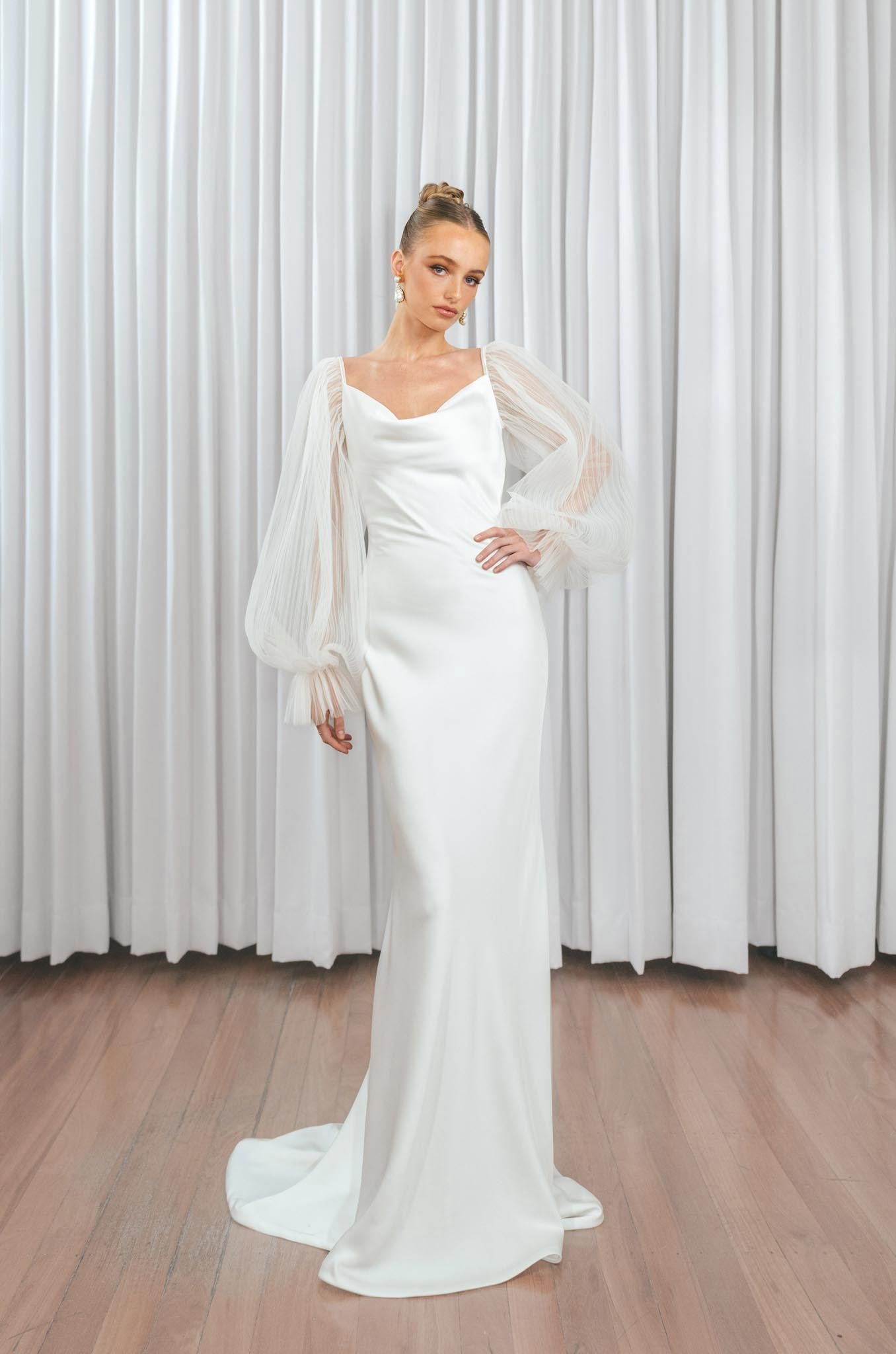 From sleek, classic cuts to dreamy minis that would make the perfect reception look for anyone who feels a costume change coming on (or, of course if short-and-sweet is straight-up your jam), there’s something for everyone in this latest drop. This frock is a total showstopper, and with the whimsical sleeves… ooft! Be still our hearts! And we just adore this timeless and oh-so-chic silhouette.