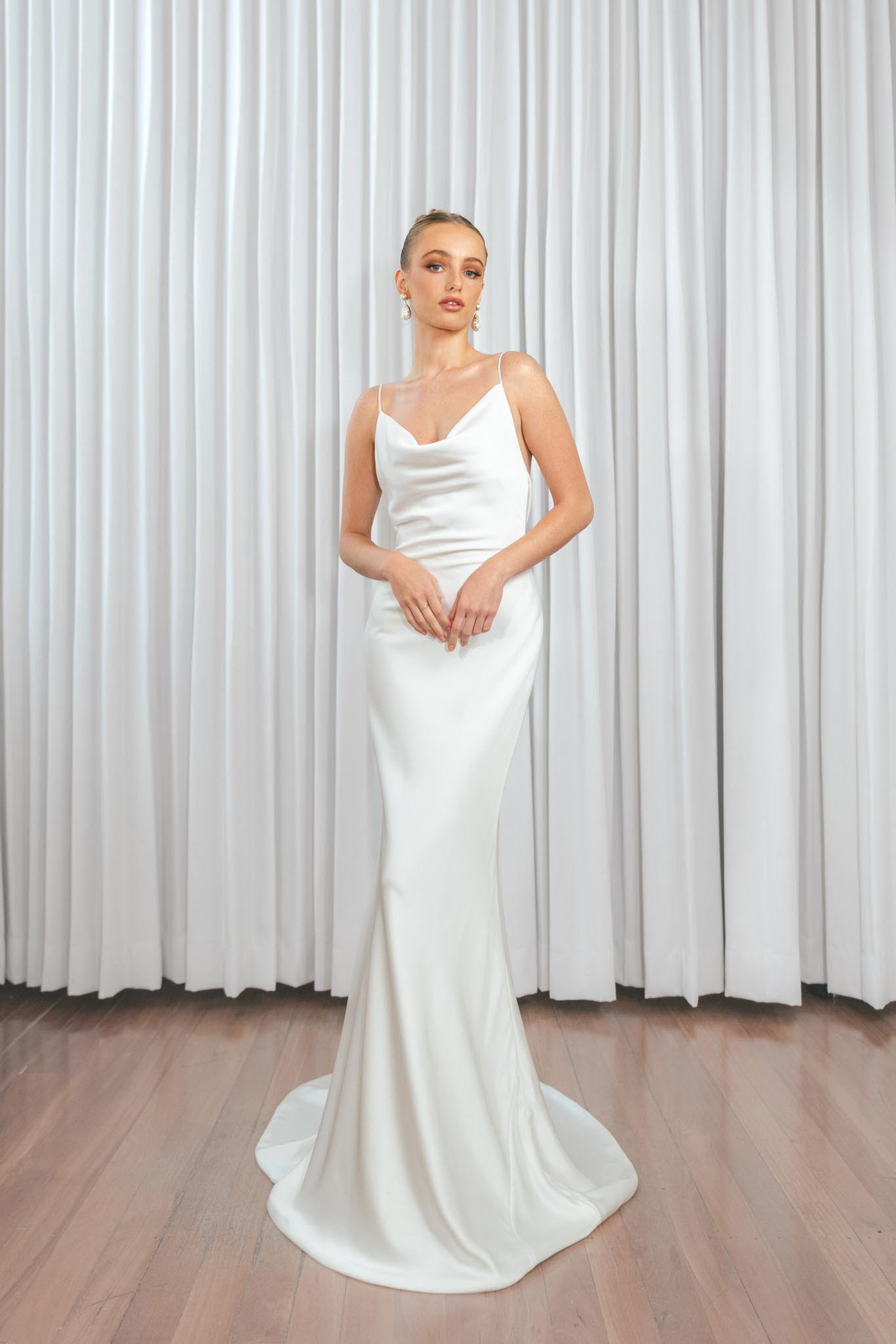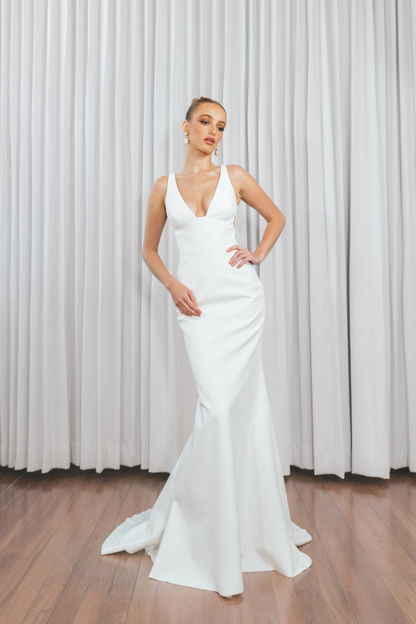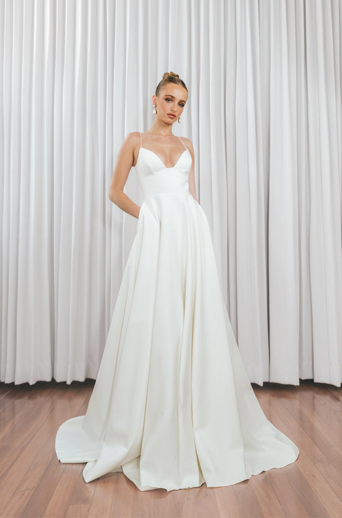 From sleek, classic cuts to dreamy minis that would make the perfect reception look for anyone who feels a costume change coming on (or, of course if short-and-sweet is straight-up your jam), there’s something for everyone in this latest drop. This frock is a total showstopper, and with the whimsical sleeves… ooft! Be still our hearts! And we just adore this timeless and oh-so-chic silhouette.